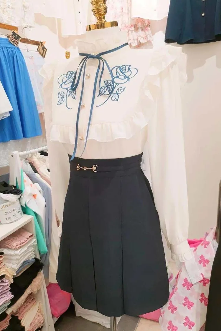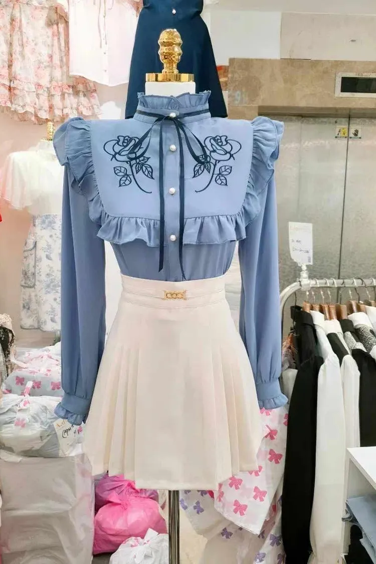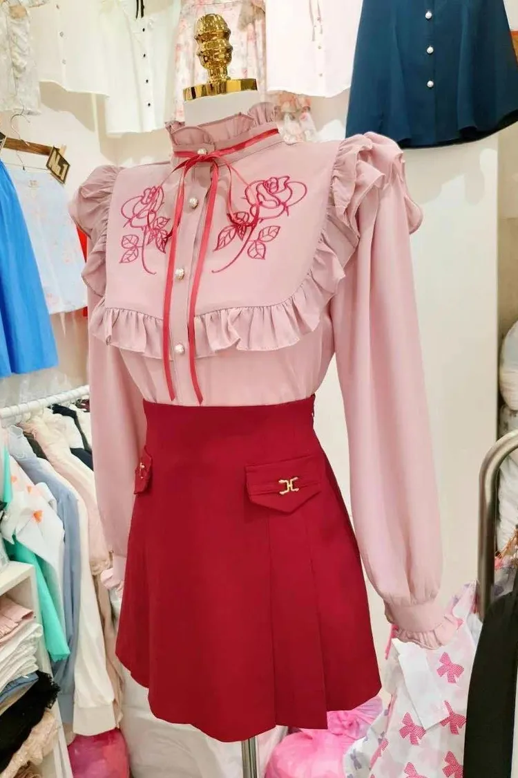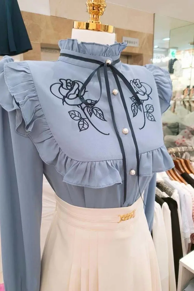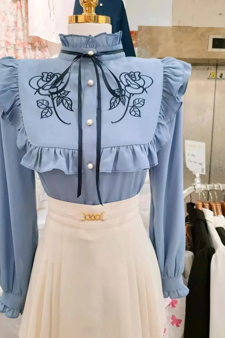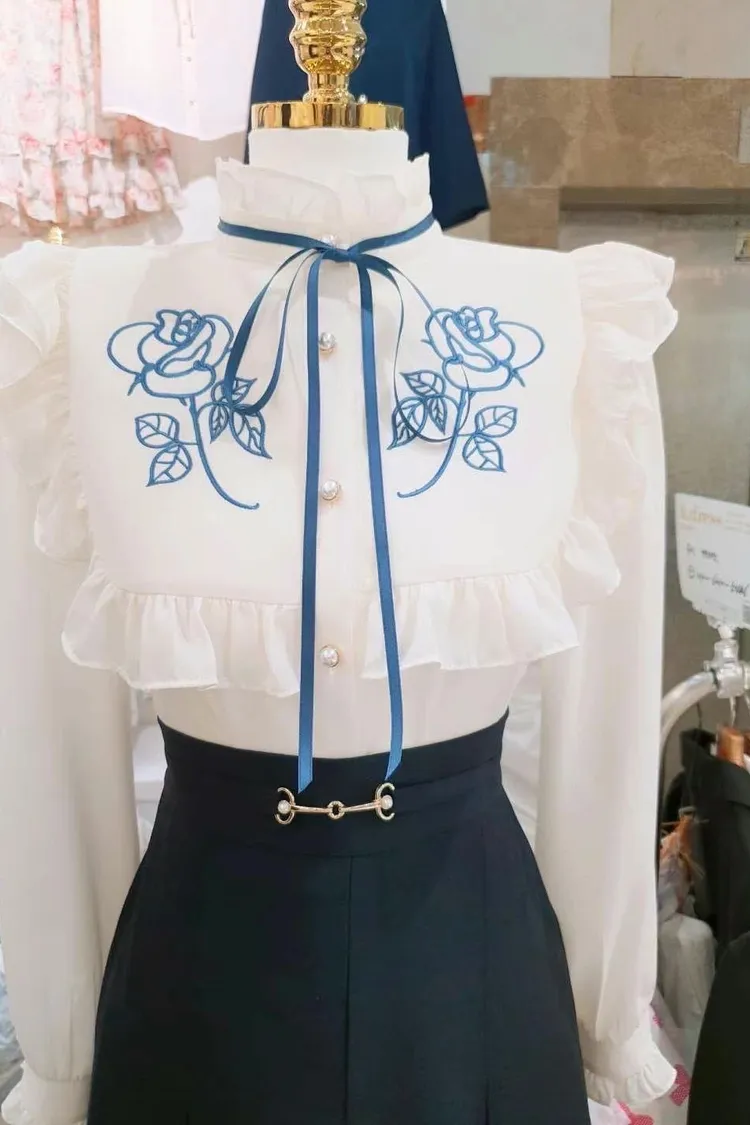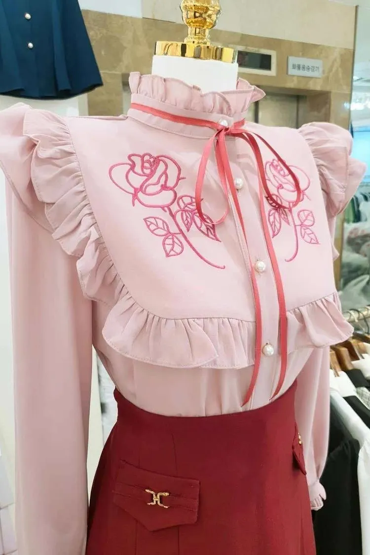 💞浪漫玫瑰刺繡荷葉邊綁帶襯衫💞