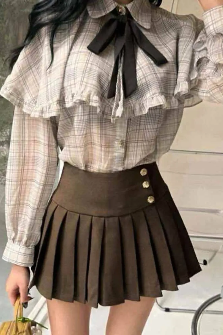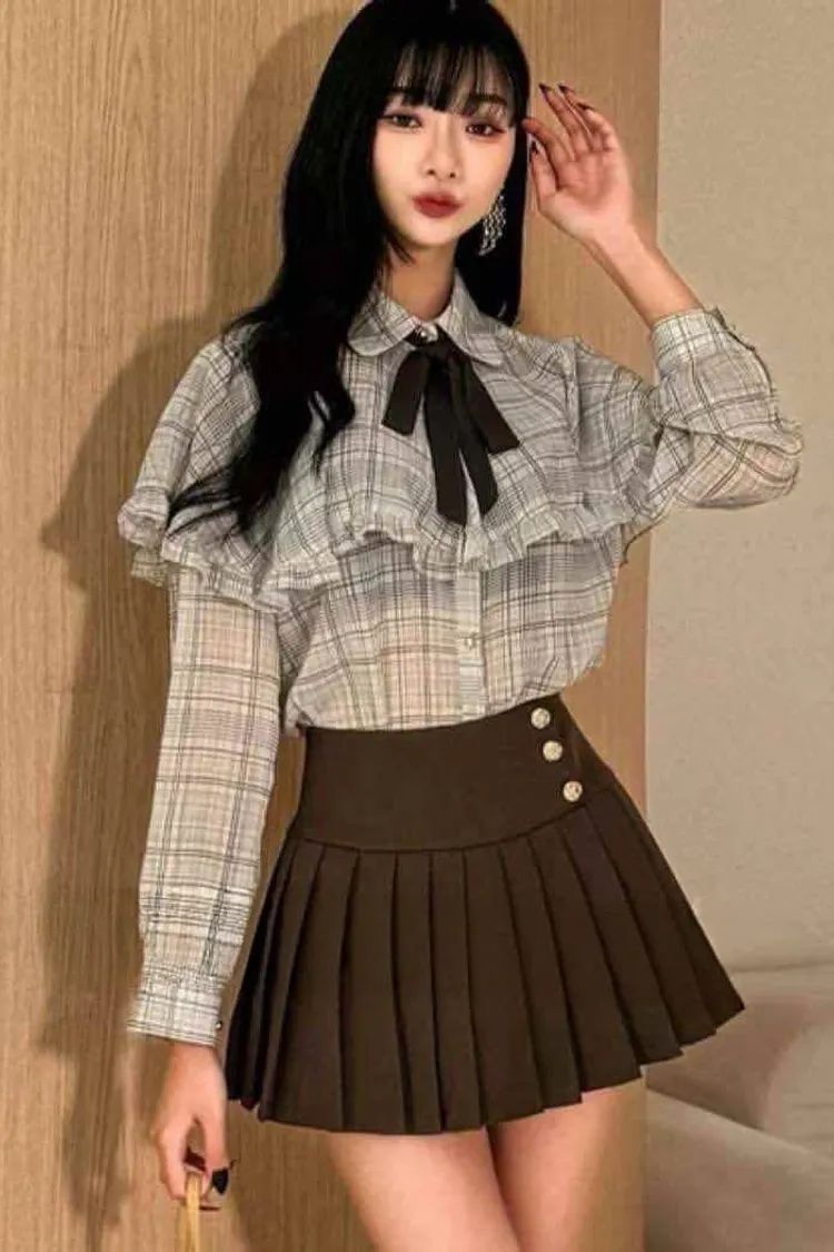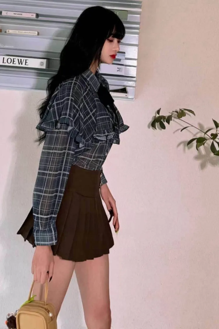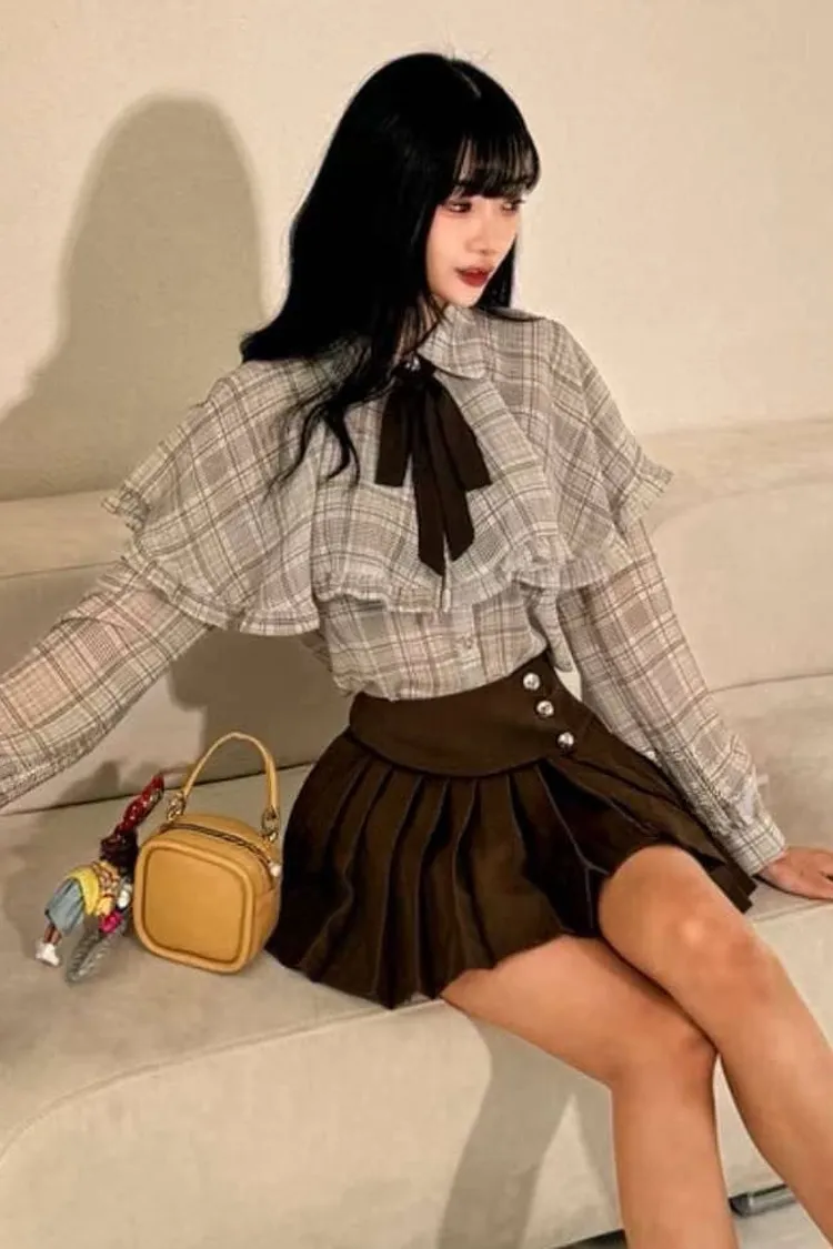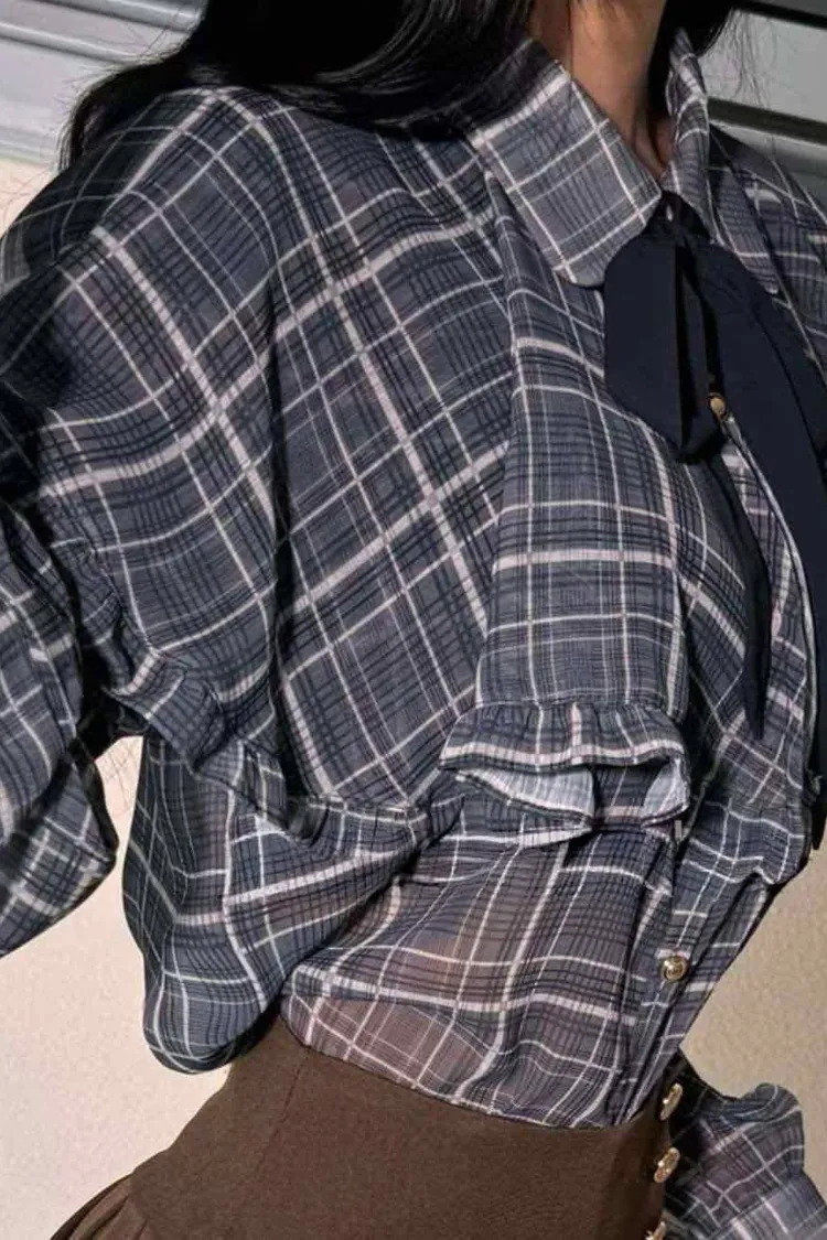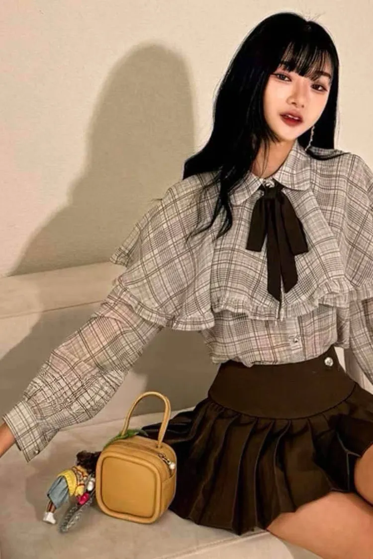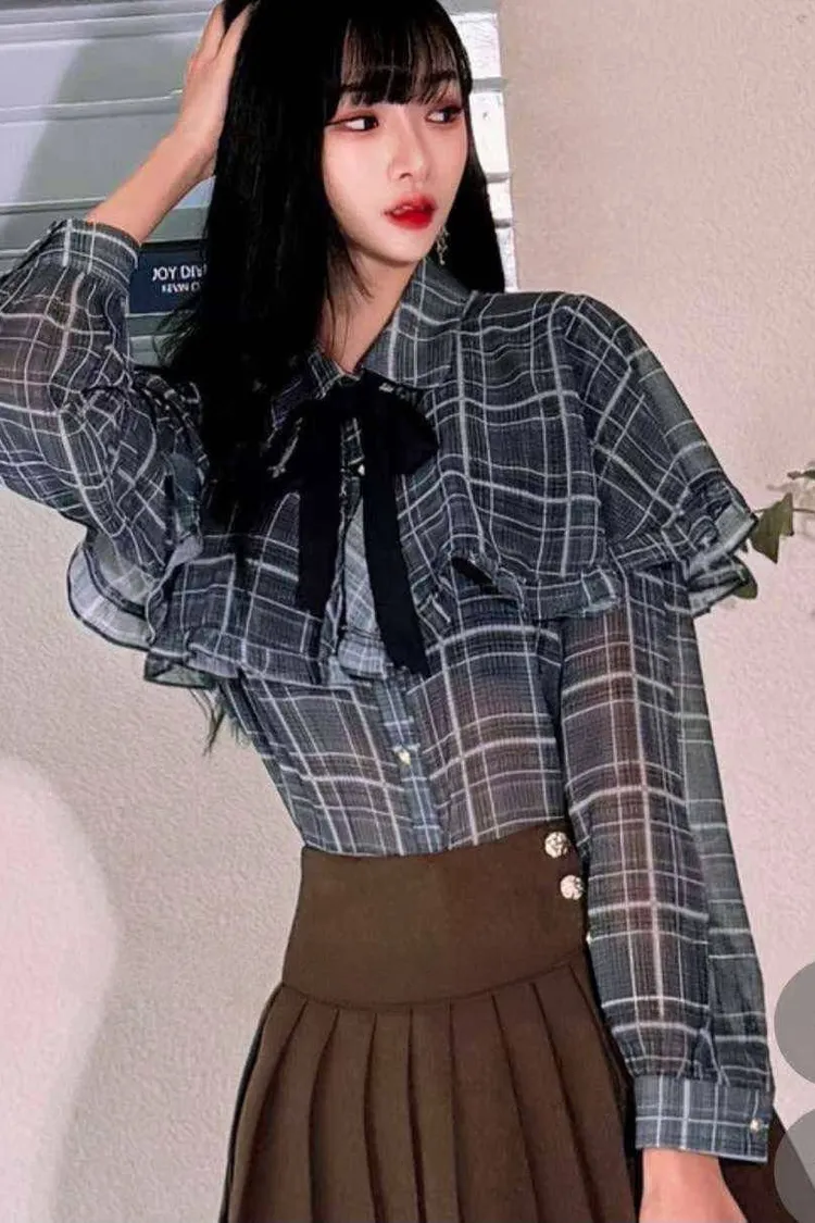 🇰🇷正韓🦋復古格紋荷葉邊披肩式綁帶雪紡襯衫🦋 💖 一眼心動的設計亮點:✨ 立體荷葉披肩: 像小披肩一樣的荷葉邊,視覺上超顯瘦!能巧妙地修飾手臂和肩線,輕鬆告別虎背熊腰感✨ 甜美領口綁帶: 附有質感黑色領結,隨意一綁就是精緻的學院