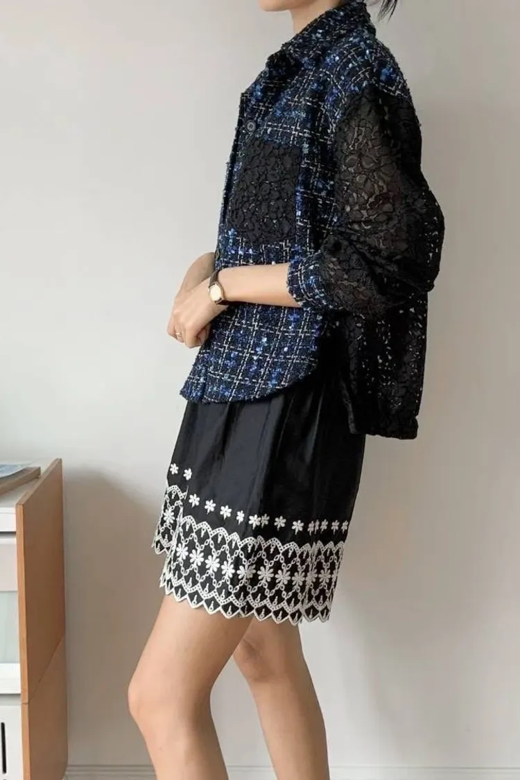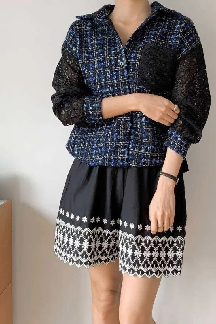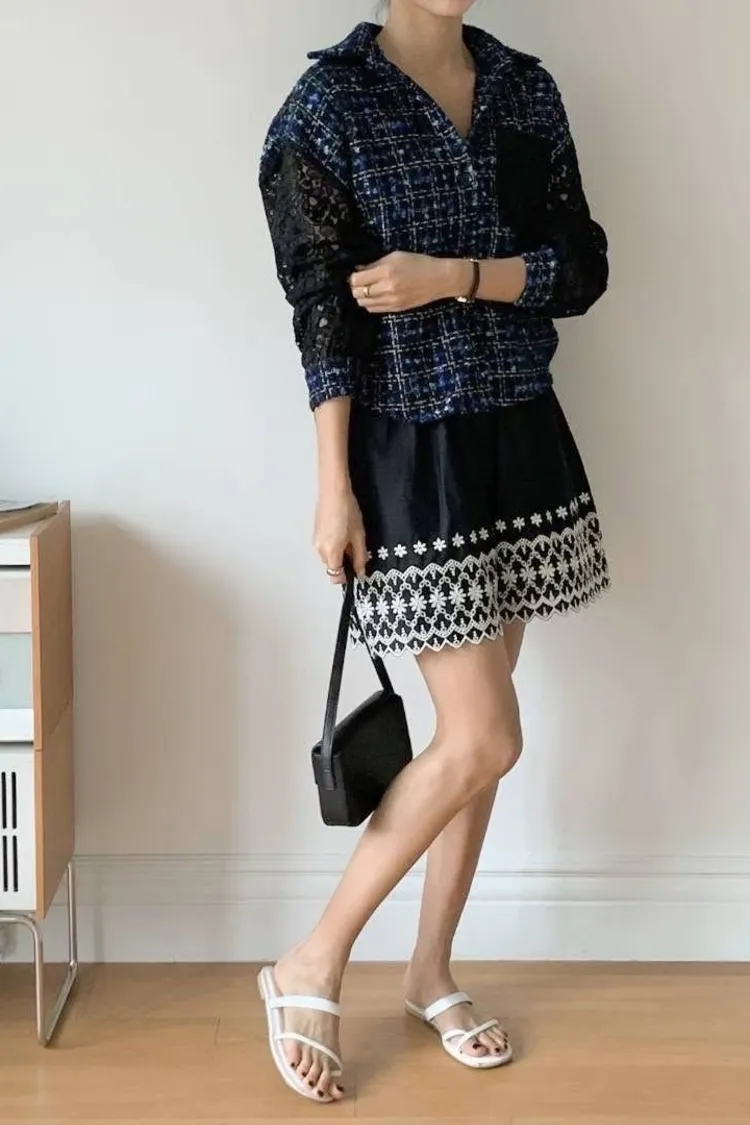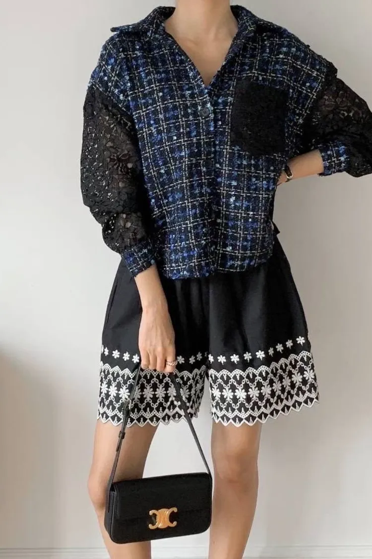 ✔️風格混搭新典範: 將經典的小香風織紋格紋布料,與輕盈細膩的蕾絲透膚袖完美結合,創造出優雅又不失個性的混搭風格