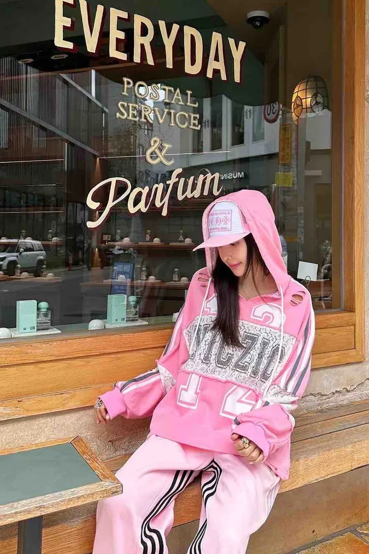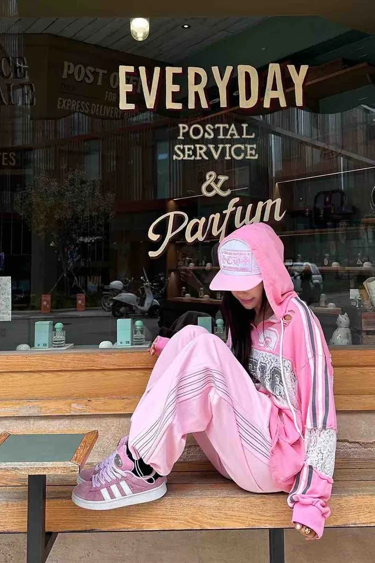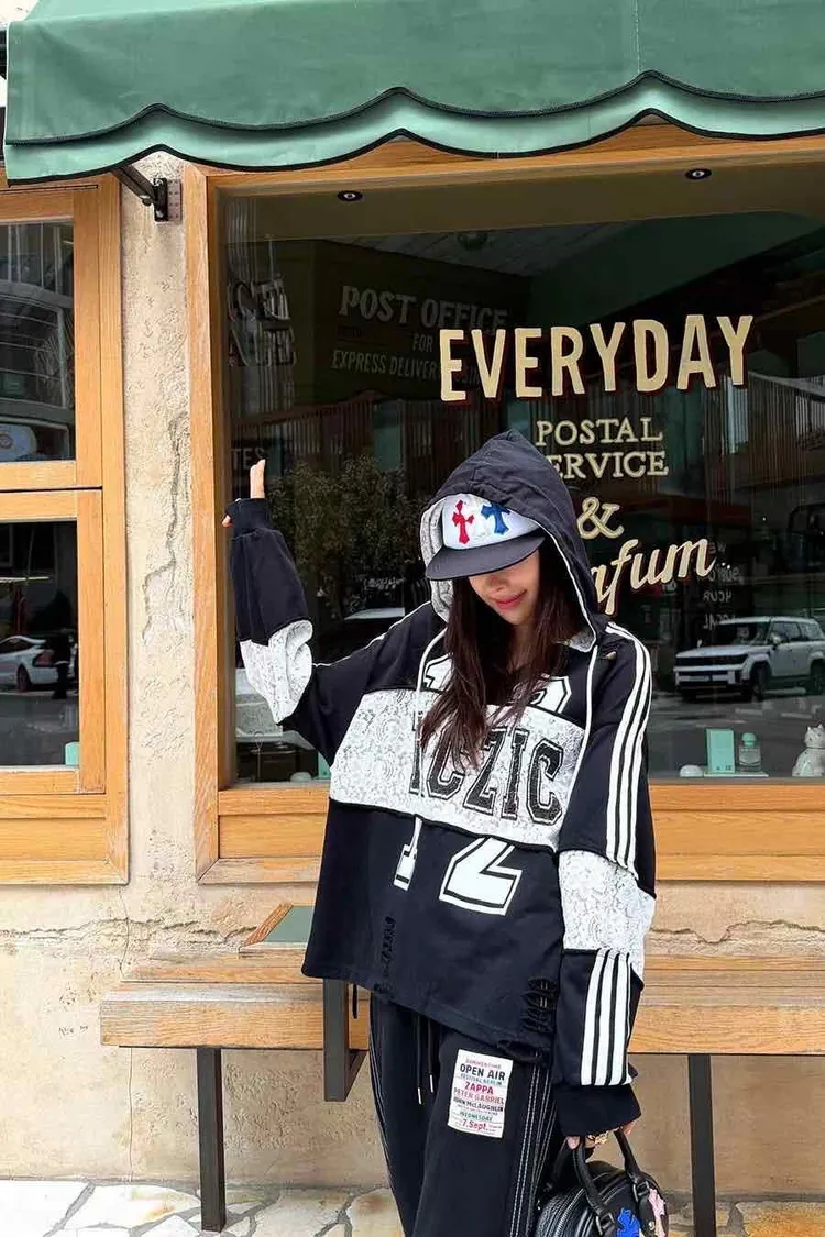 ANNA008 🇰🇷正韓_網紅家💙甜酷潮流拼接蕾絲運動休閒連帽上衣💙