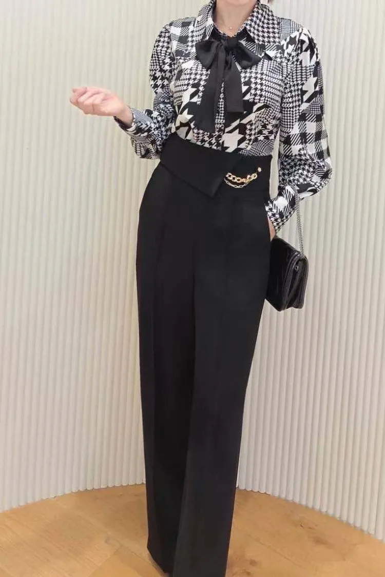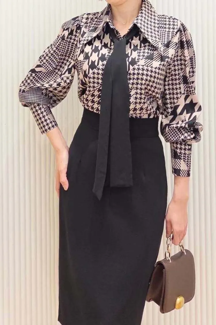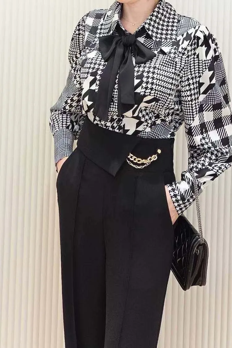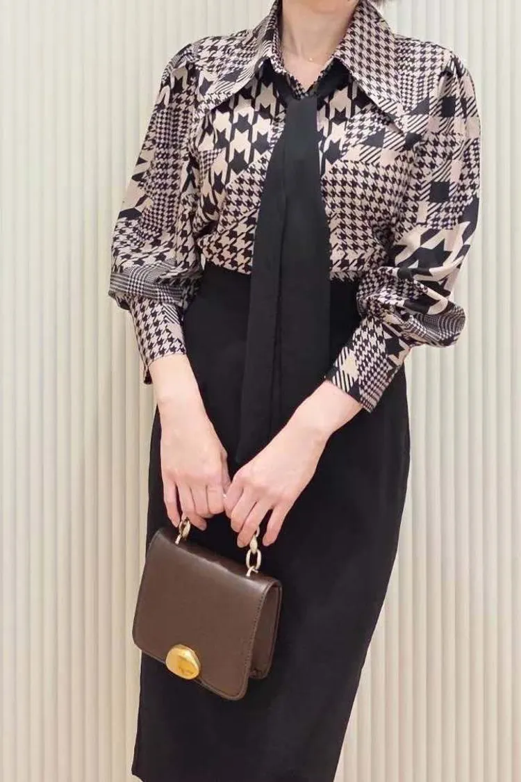 CH025 🇰🇷正韓💕韓劇女主優雅氣質千鳥格紋蝴蝶結領巾襯衫💕