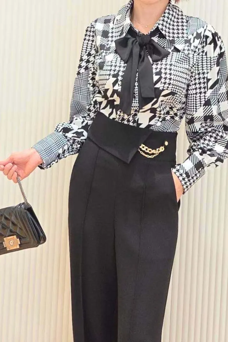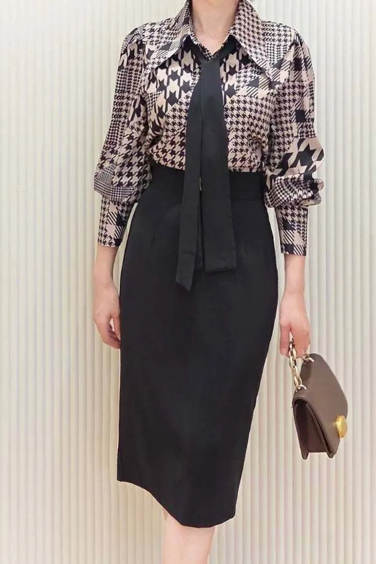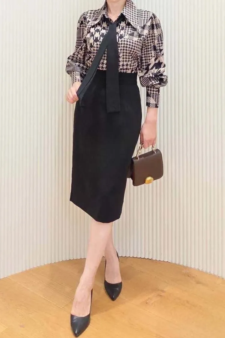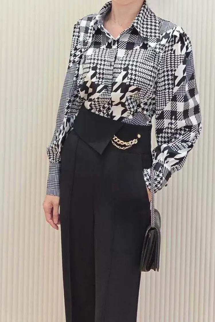CH025 🇰🇷正韓💕韓劇女主優雅氣質千鳥格紋蝴蝶結領巾襯衫💕