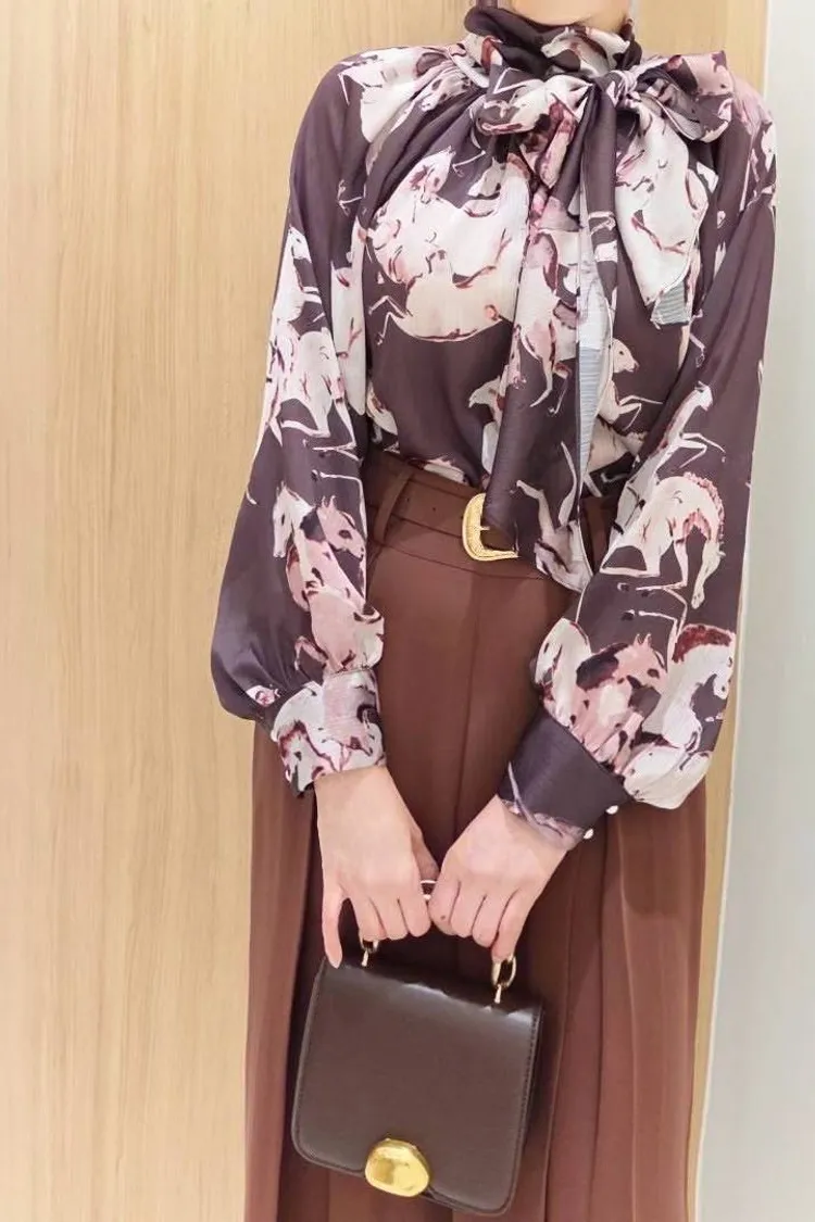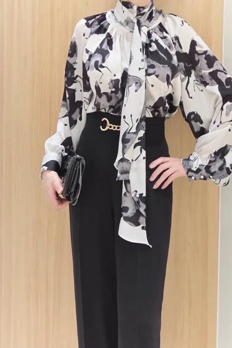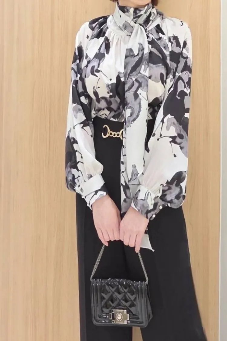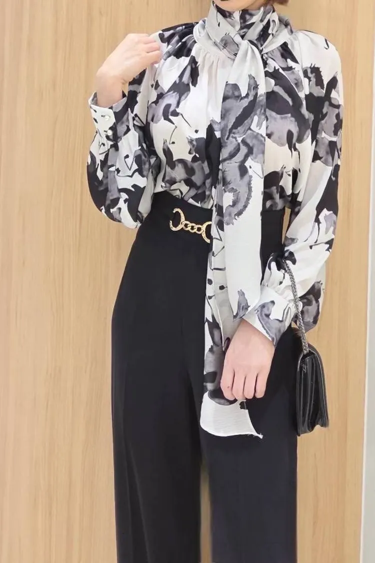 CH027 🇰🇷正韓💕韓劇女主摩登優雅水墨暈染印花綁帶襯衫💕