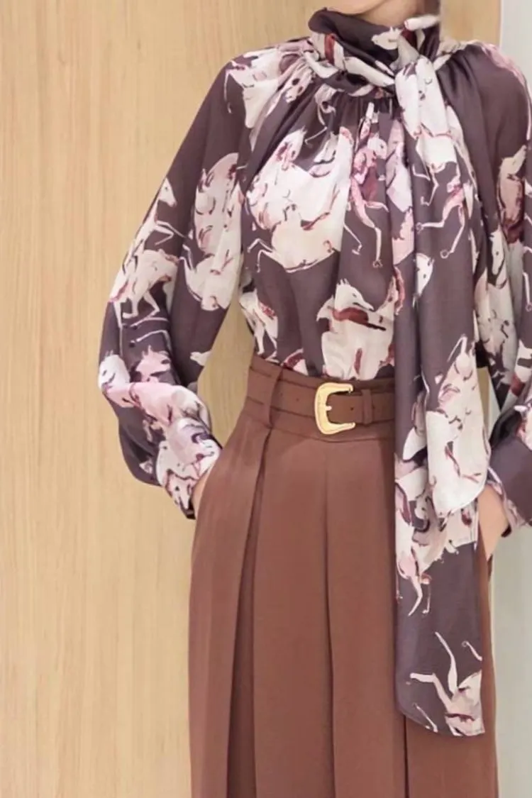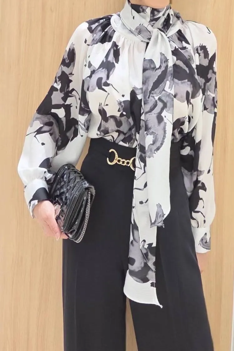 💕韓劇女主摩登優雅水墨暈染印花綁帶襯衫💕