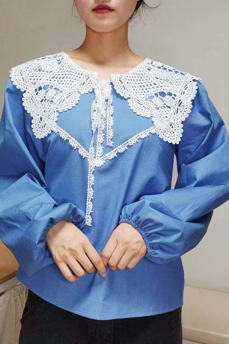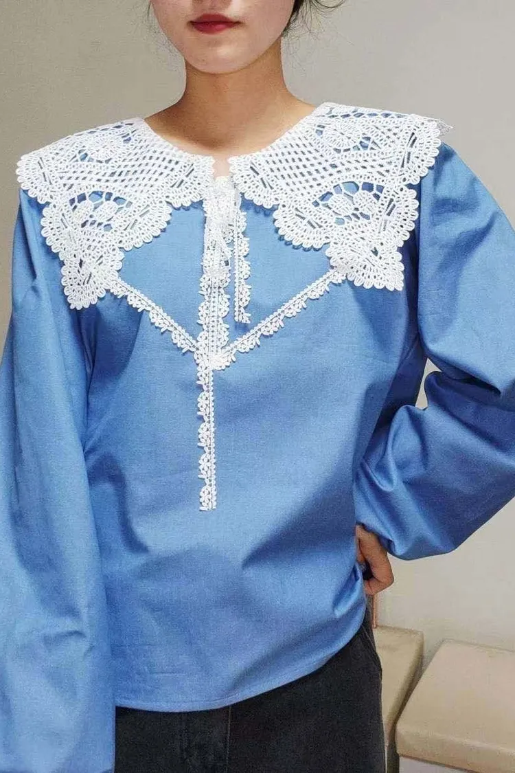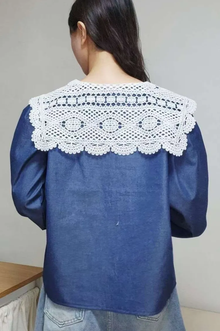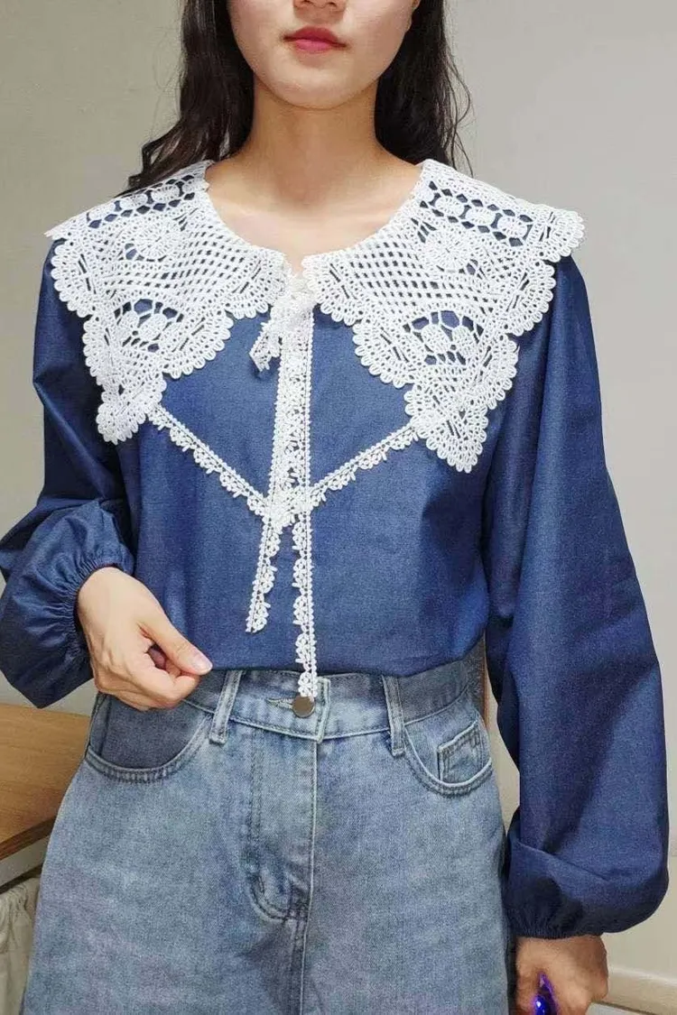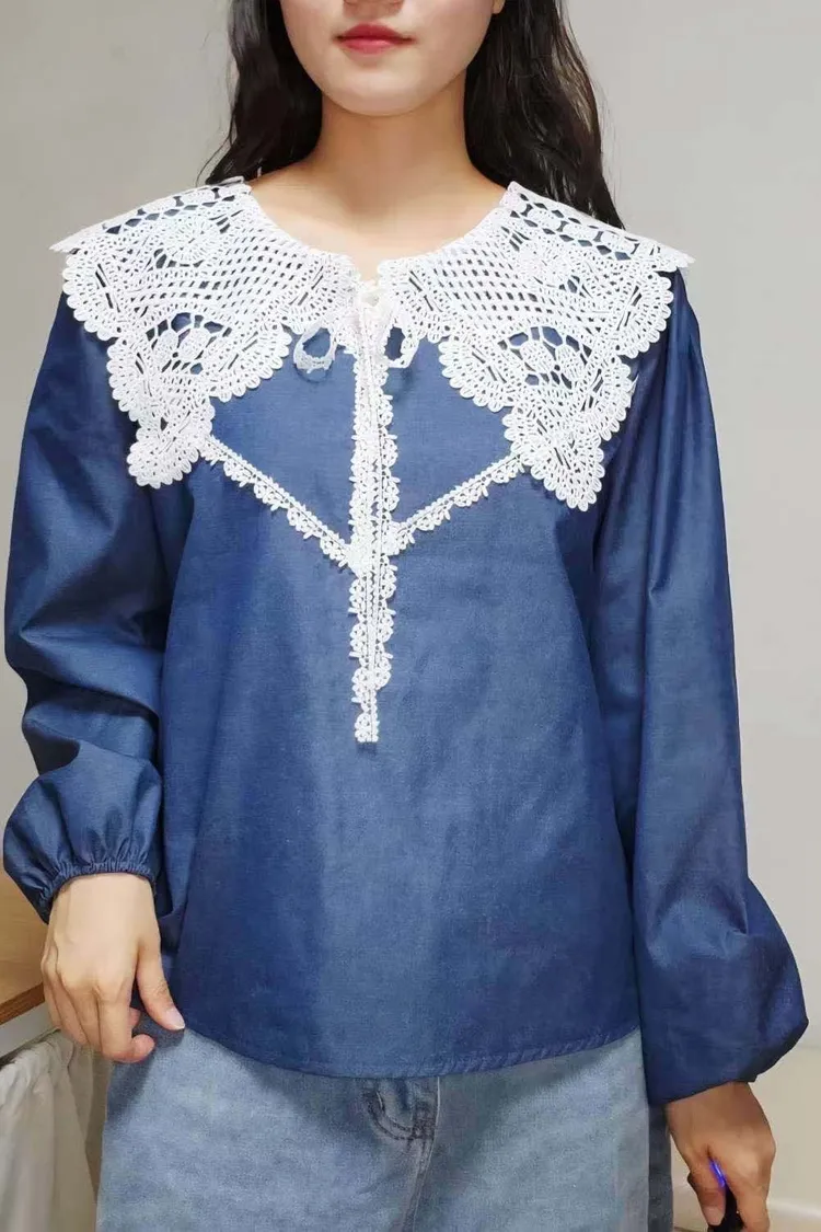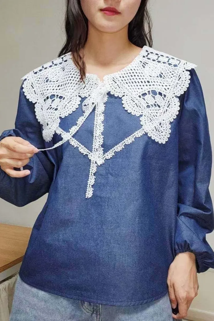HE004 🇰🇷正韓_Hero💛甜美蕾絲大領拼接牛仔上衣💛
