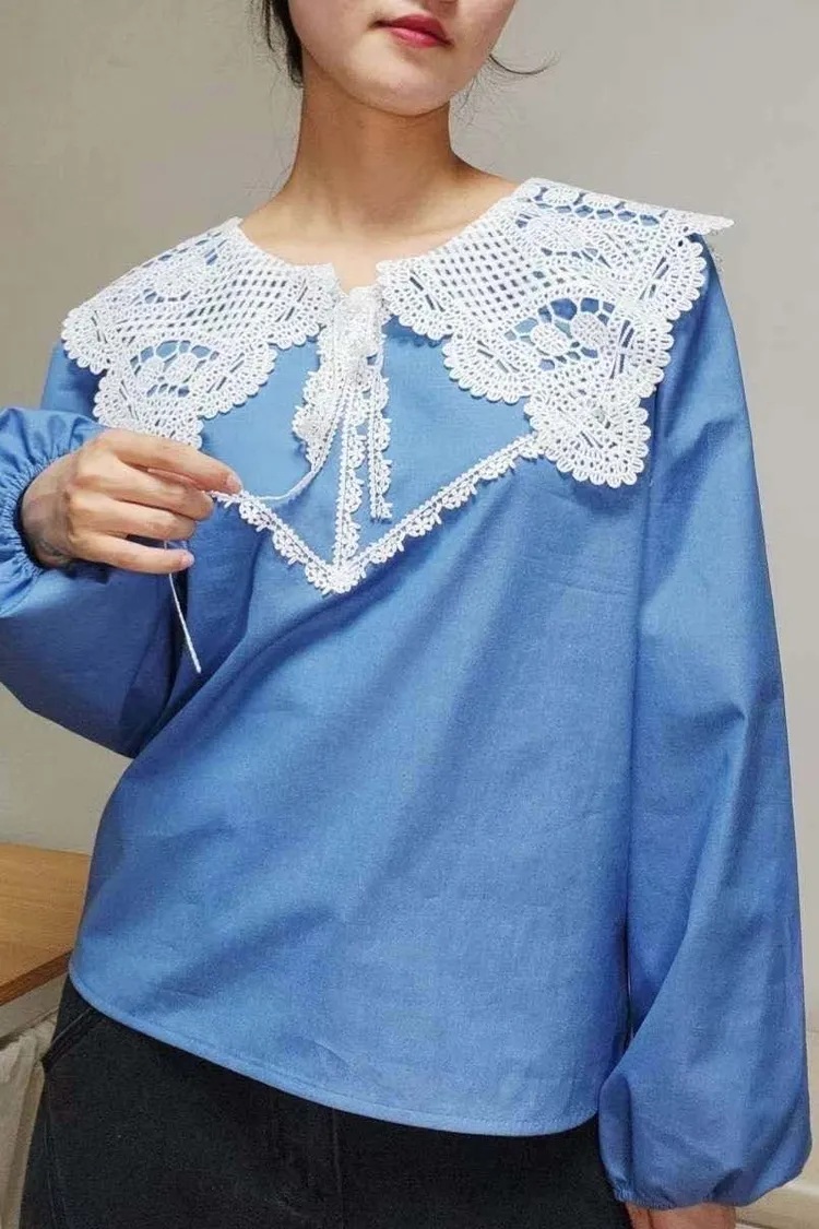💛甜美蕾絲大領拼接牛仔上衣💛