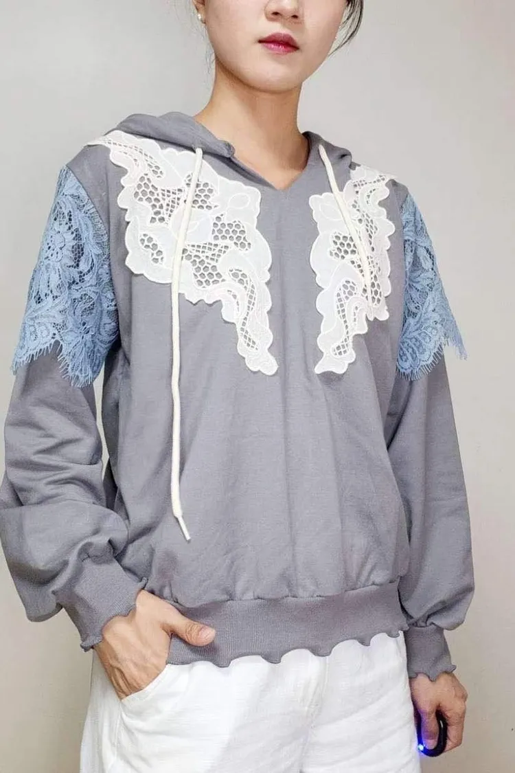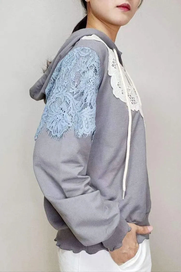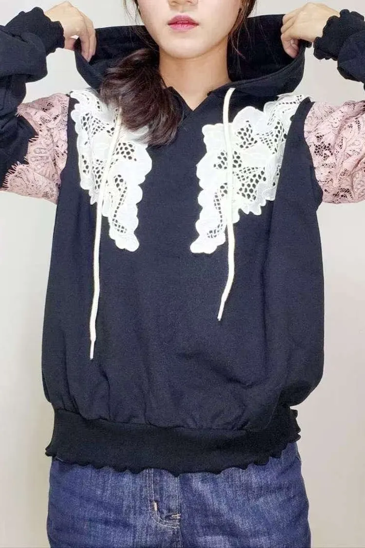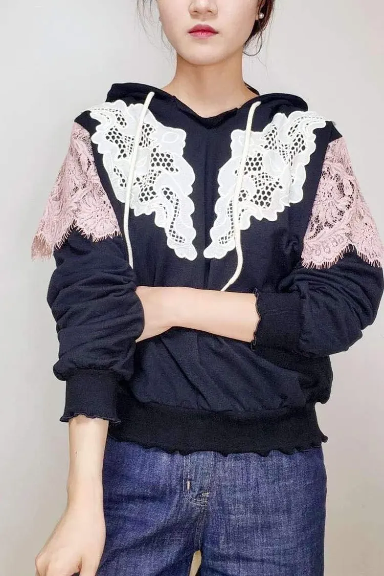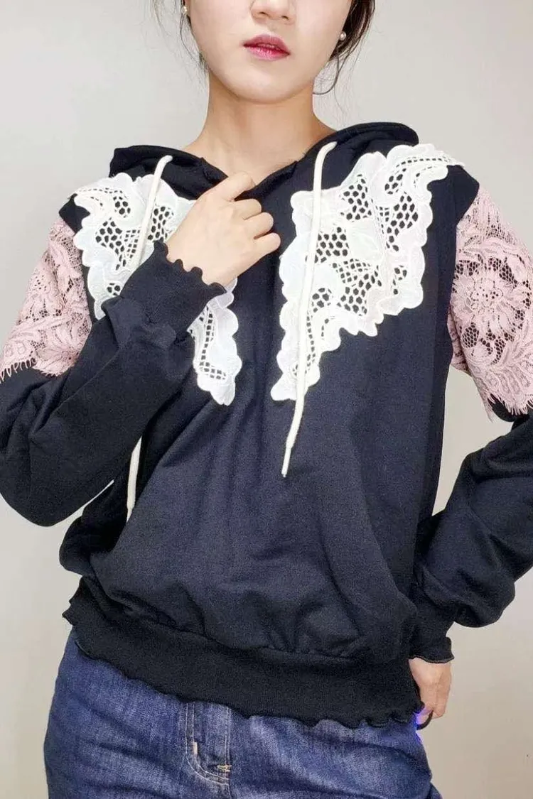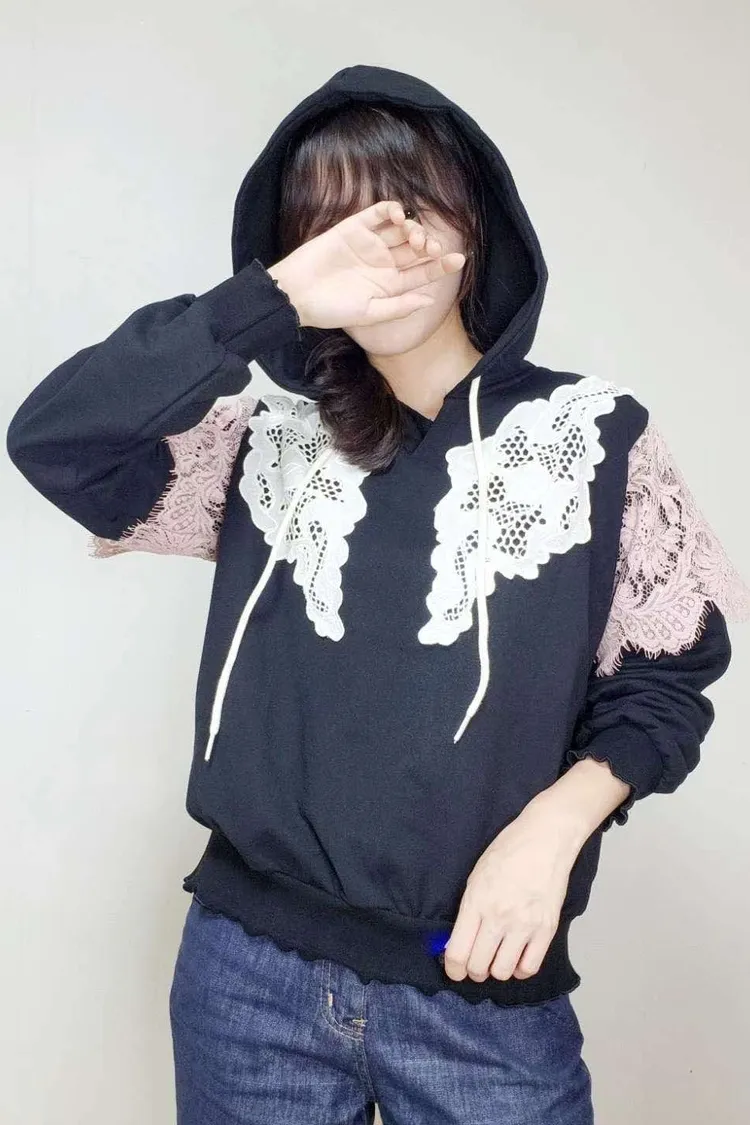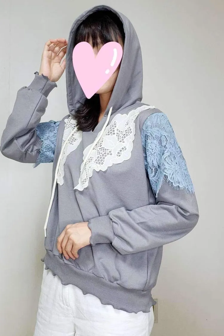 HE011 🇰🇷正韓_Hero💛拼接精緻緹花蕾絲連帽上衣💛