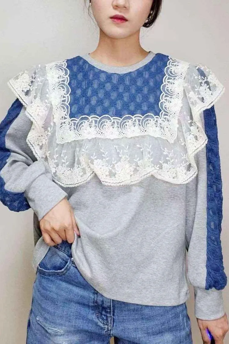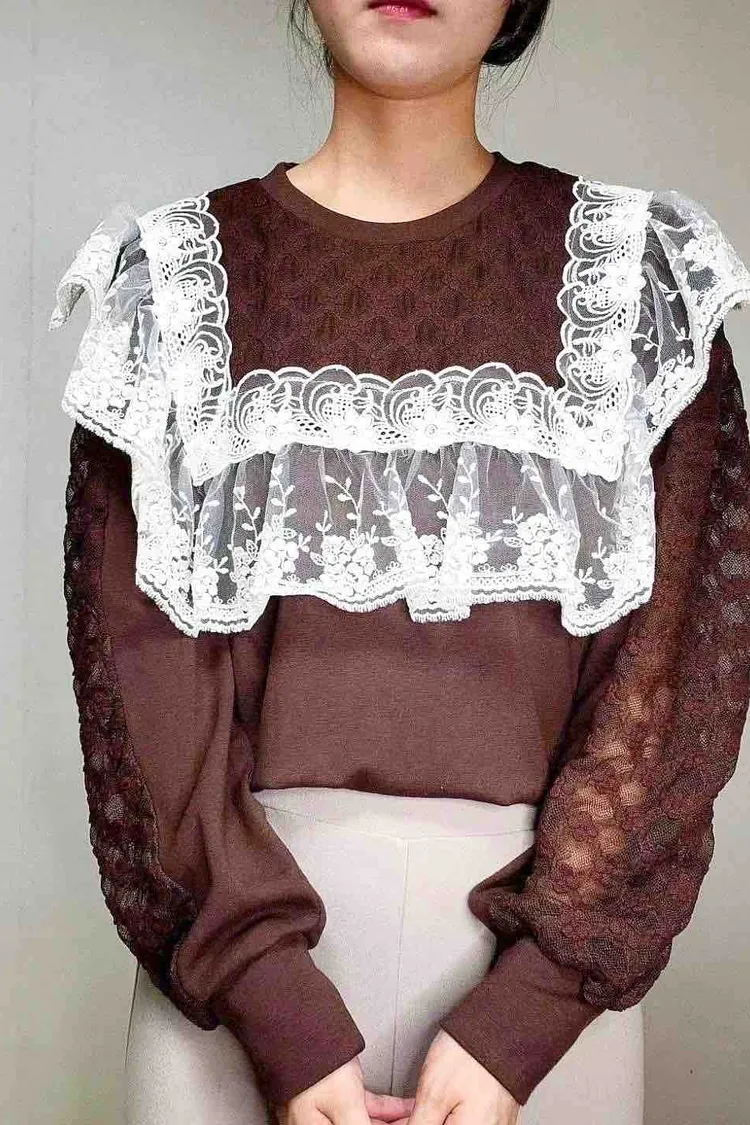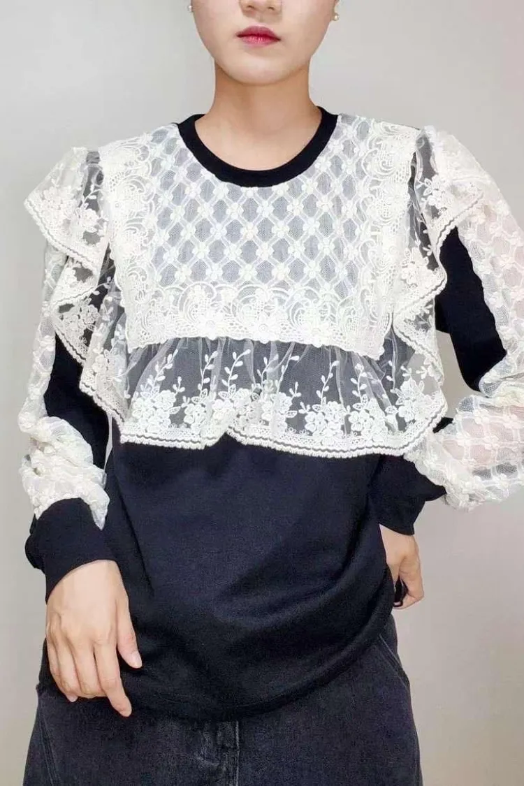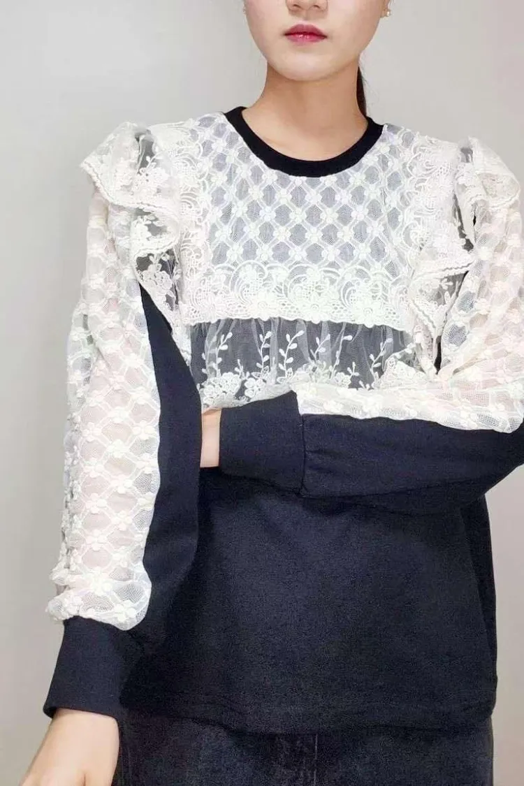 HE012 🇰🇷正韓_Hero💛拼接刺繡蕾絲大方領上衣💛