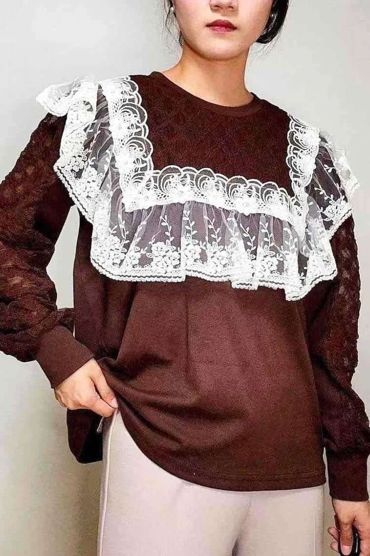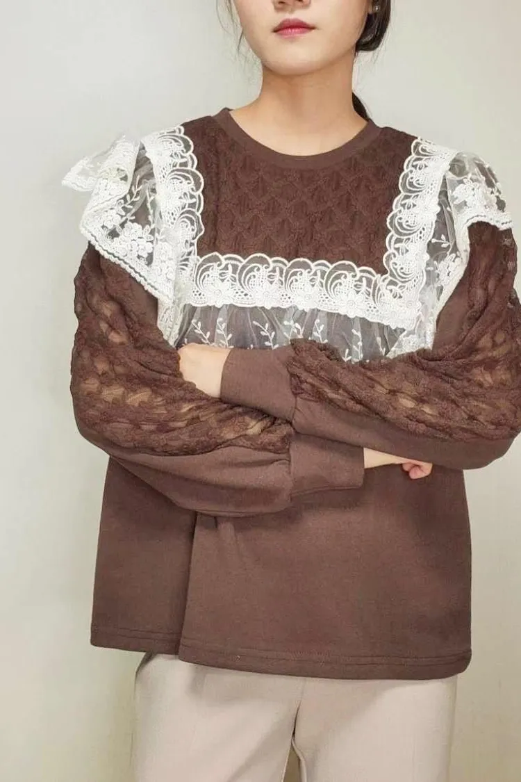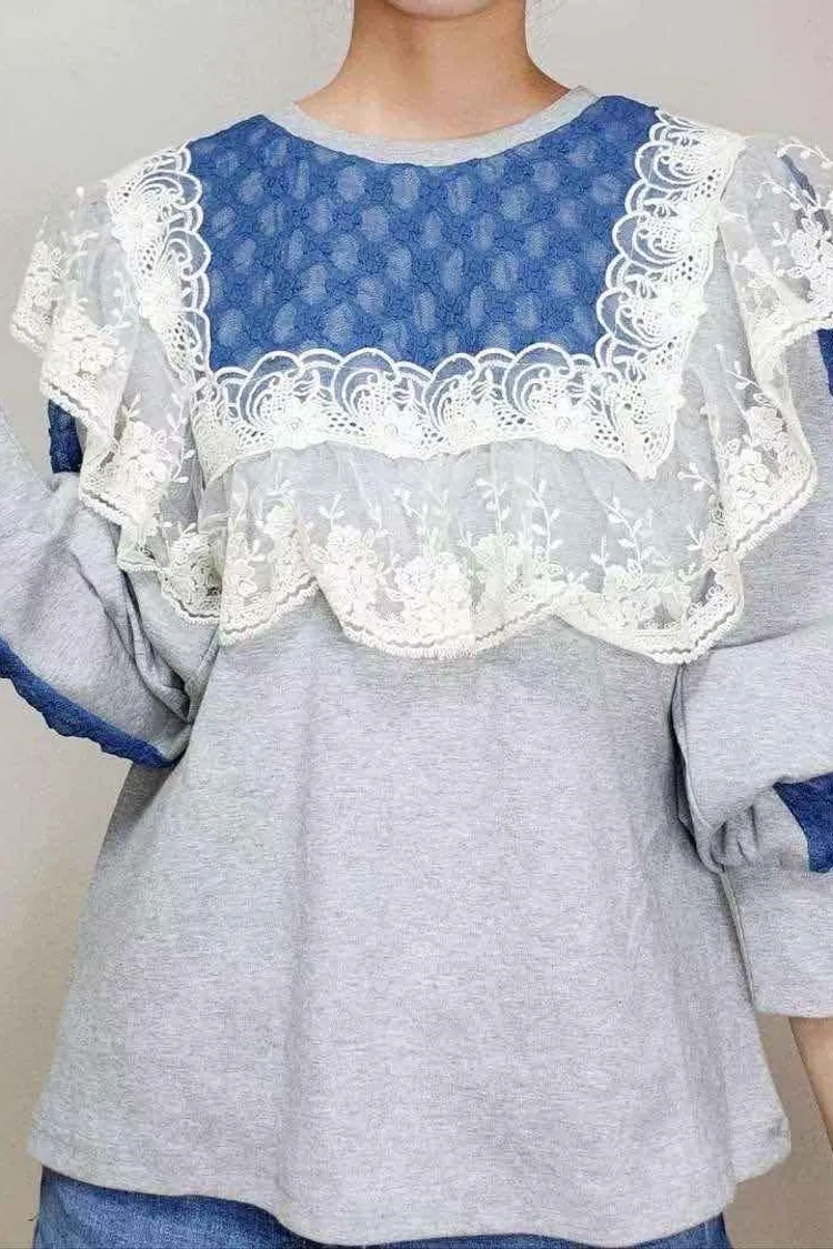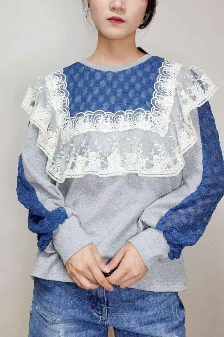 HE012 🇰🇷正韓_Hero💛拼接刺繡蕾絲大方領上衣💛