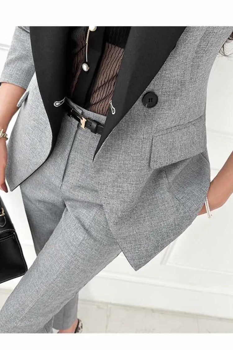 黑色翻領設計,為沉穩的灰色西裝注入強烈的視覺對比