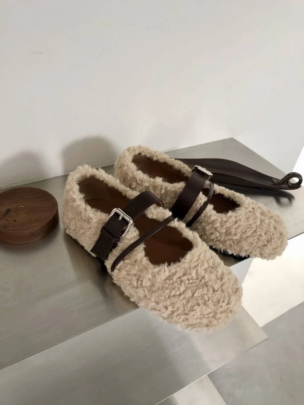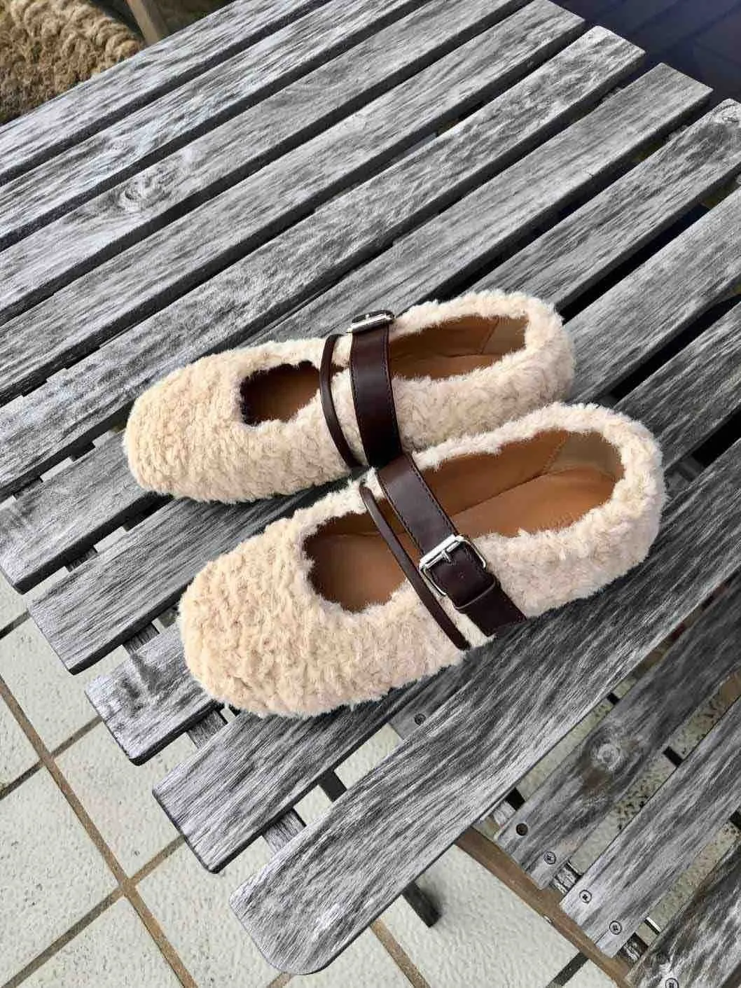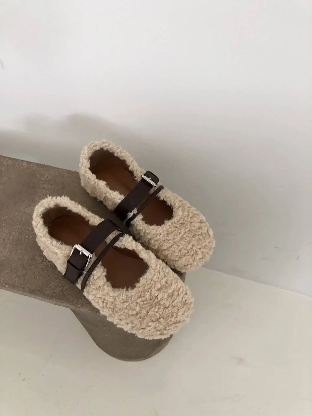 【暖冬柔光】法式復古羊羔毛雙絆帶瑪莉珍平底鞋(焦糖可可棕)