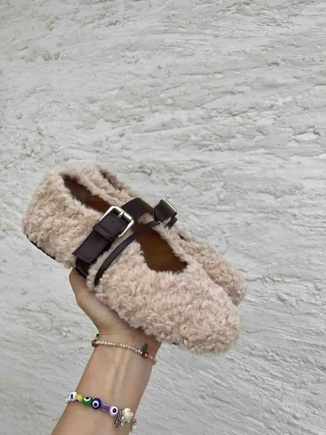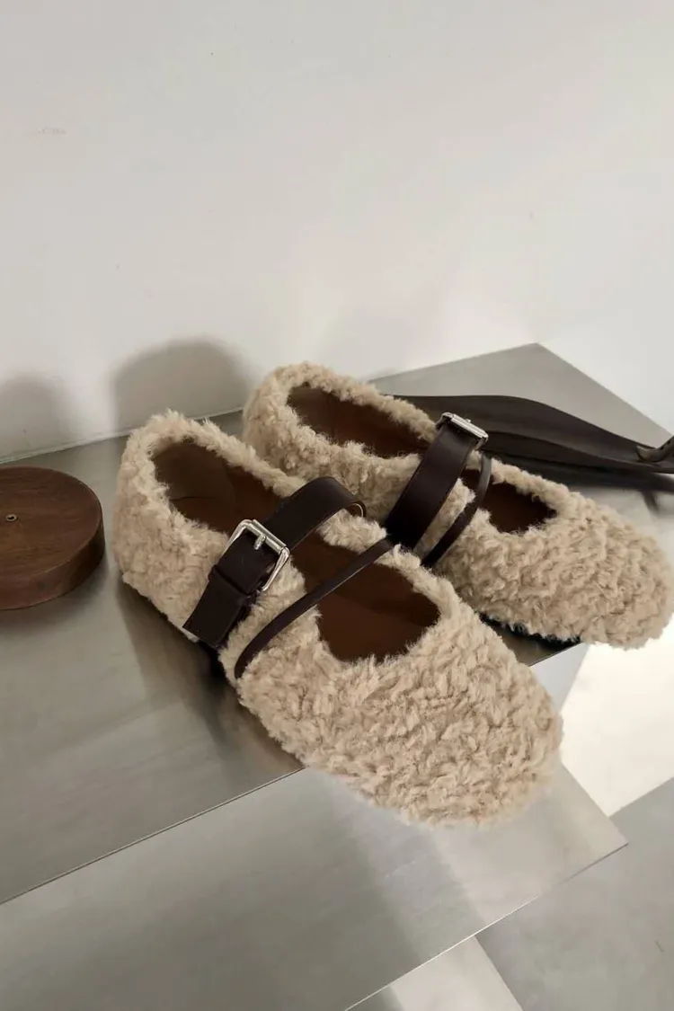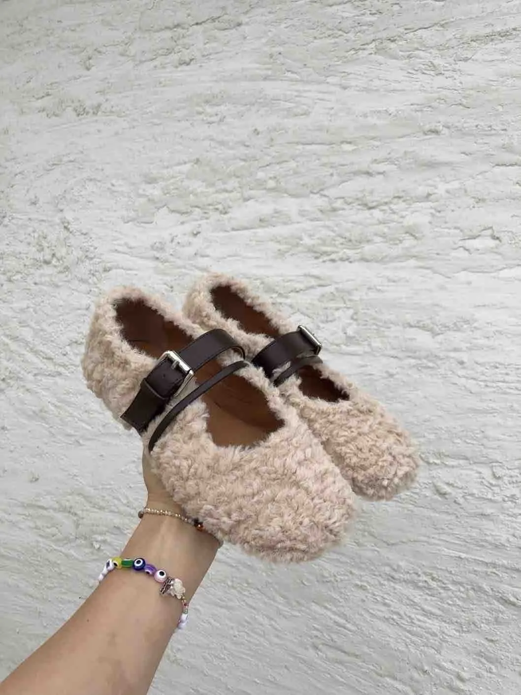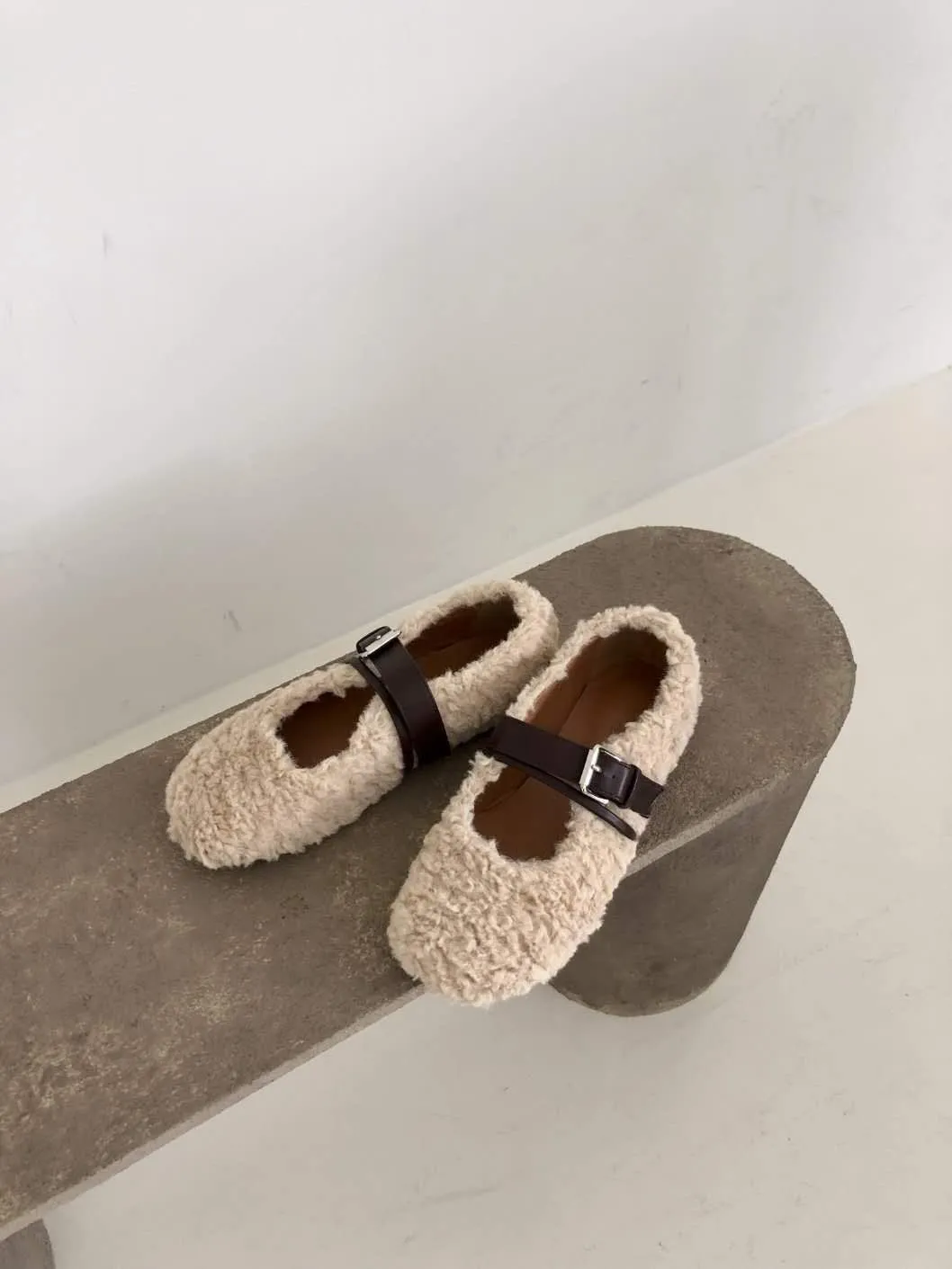 【暖冬柔光】法式復古羊羔毛雙絆帶瑪莉珍平底鞋(焦糖可可棕)