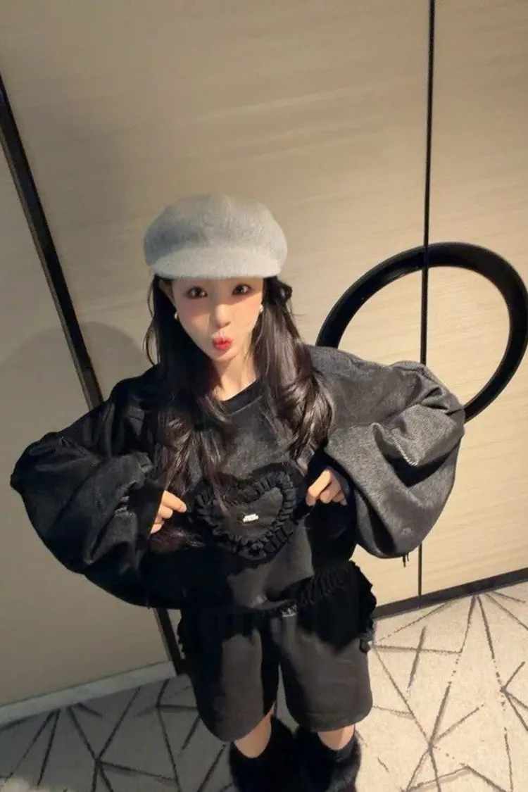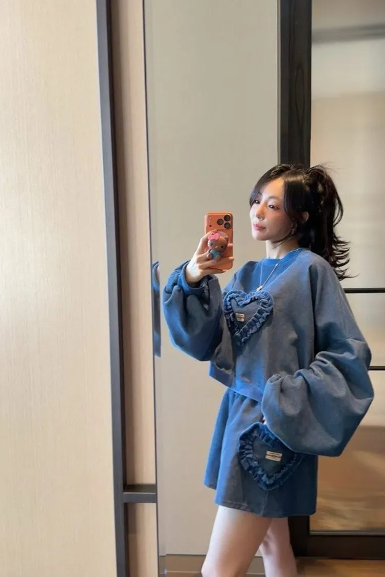 💖 韓系寬鬆燈芯絨紋理愛心縮口袖短褲套裝