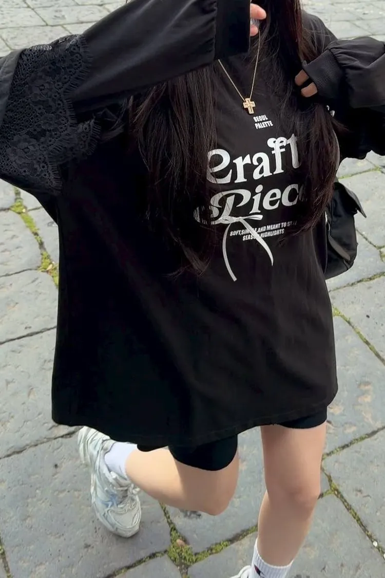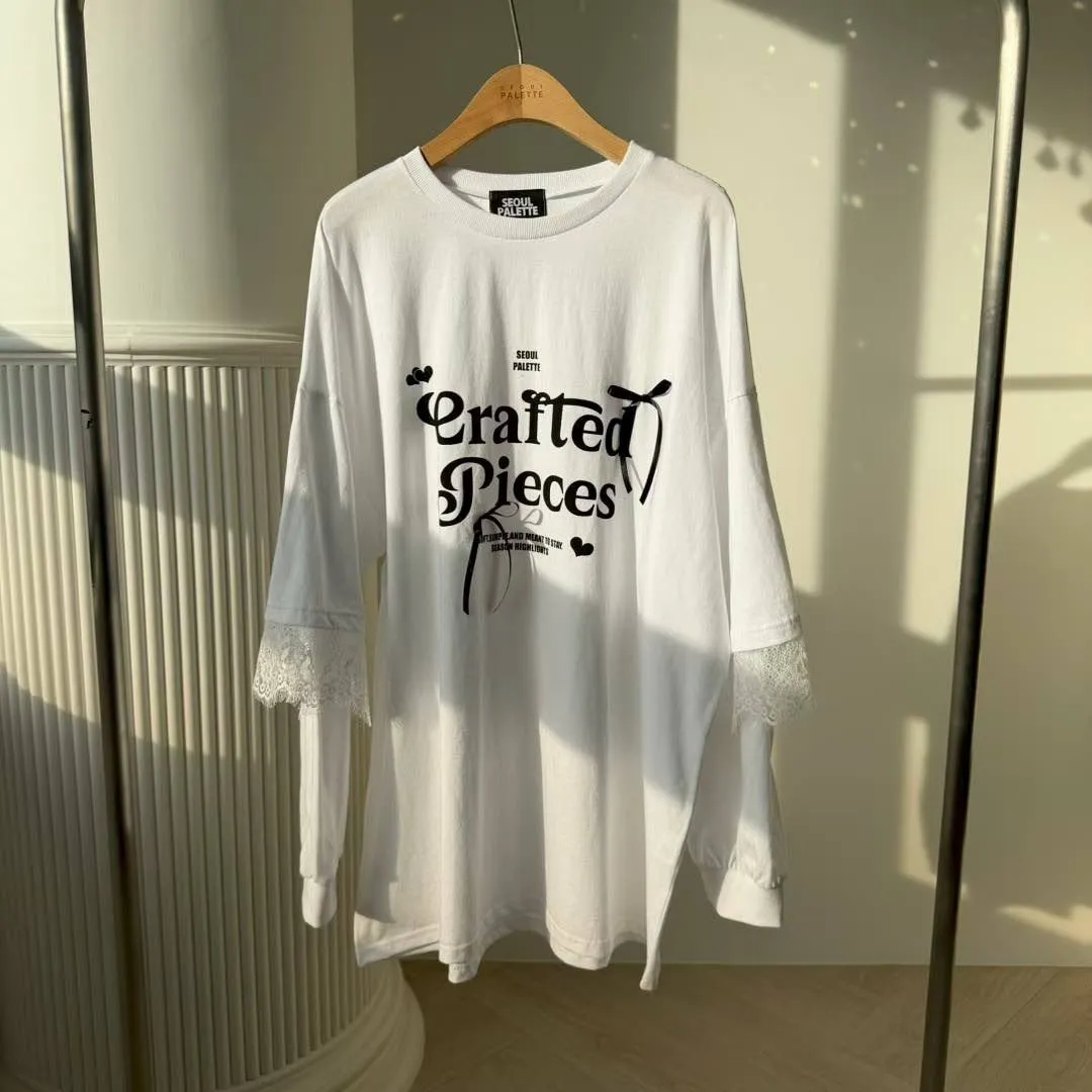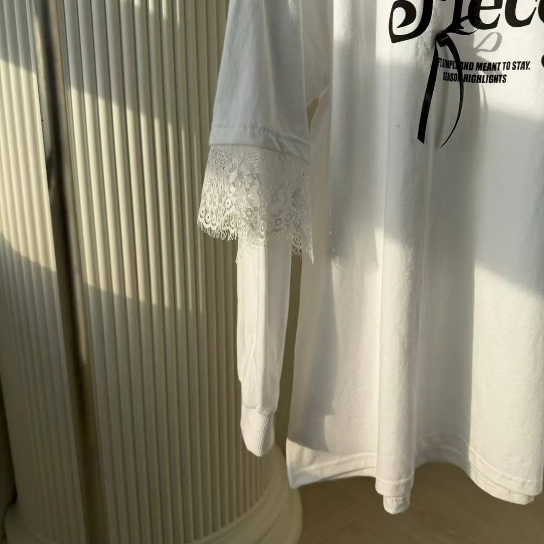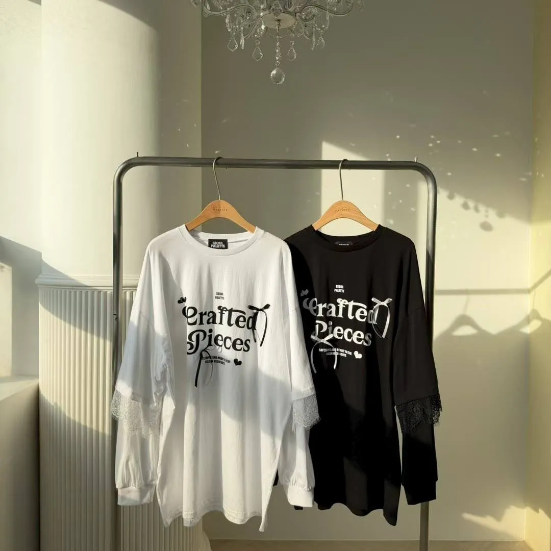 利用袖口的蕾絲拼接與立體緞帶蝴蝶結,打破傳統長 T 的單調感,讓穿搭更具層次與設計張力。