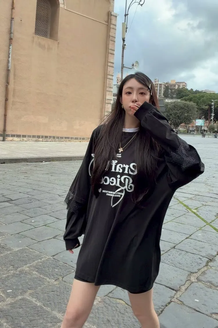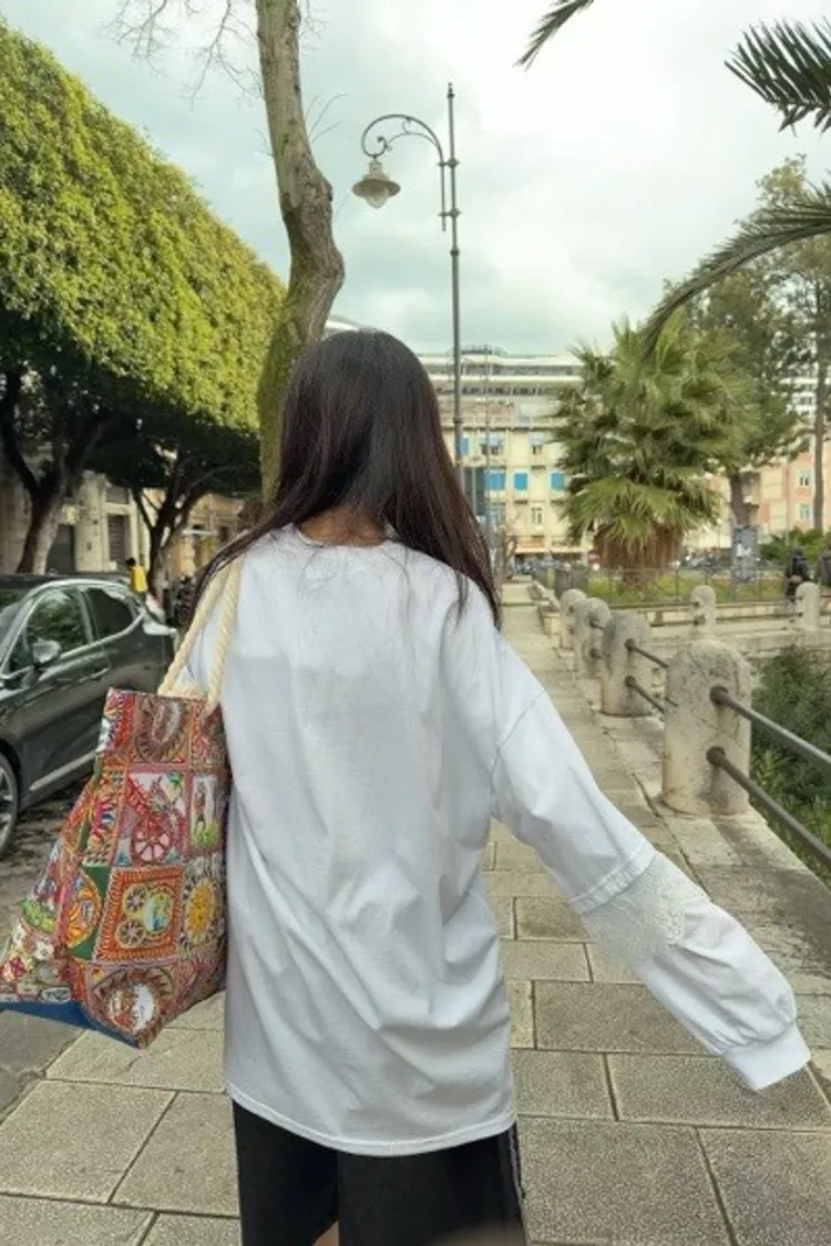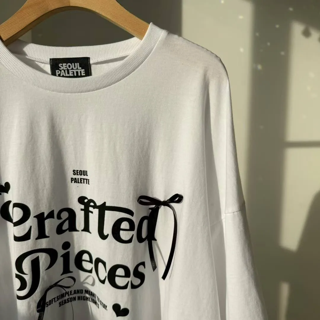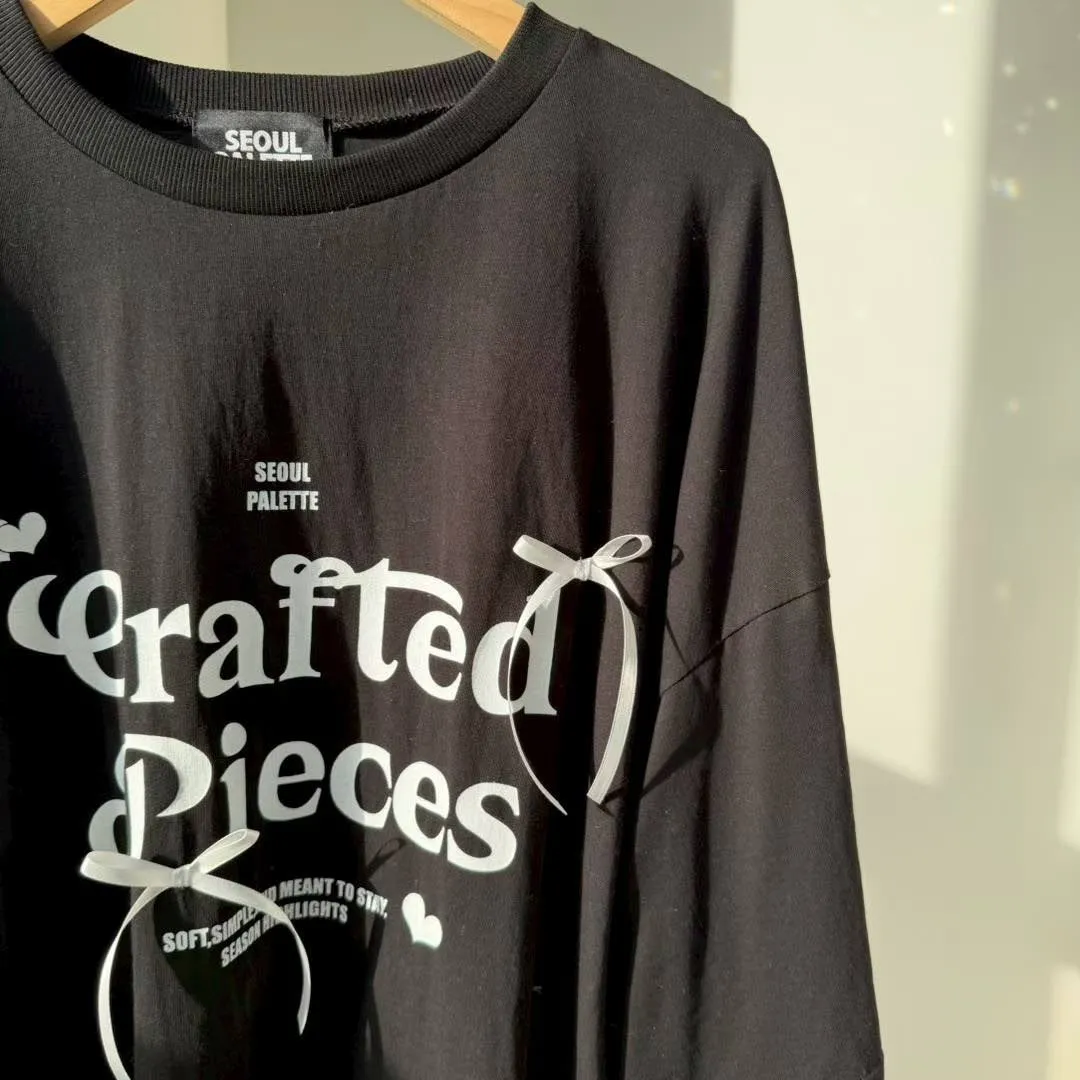 利用袖口的蕾絲拼接與立體緞帶蝴蝶結,打破傳統長 T 的單調感,讓穿搭更具層次與設計張力。