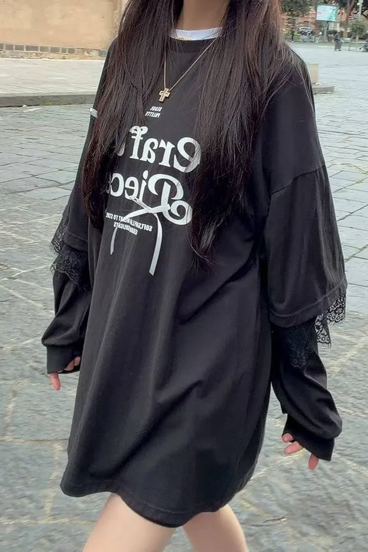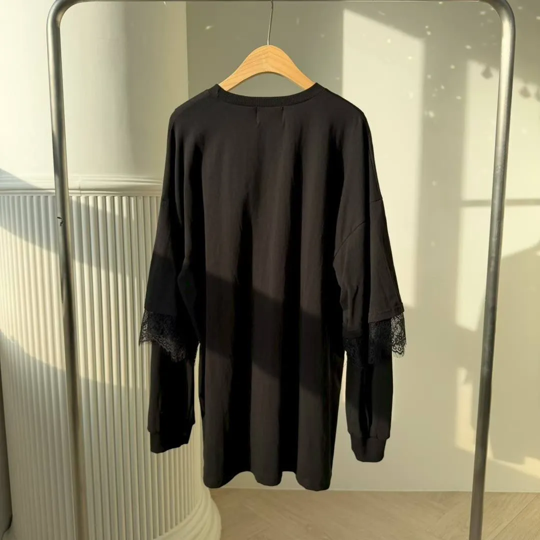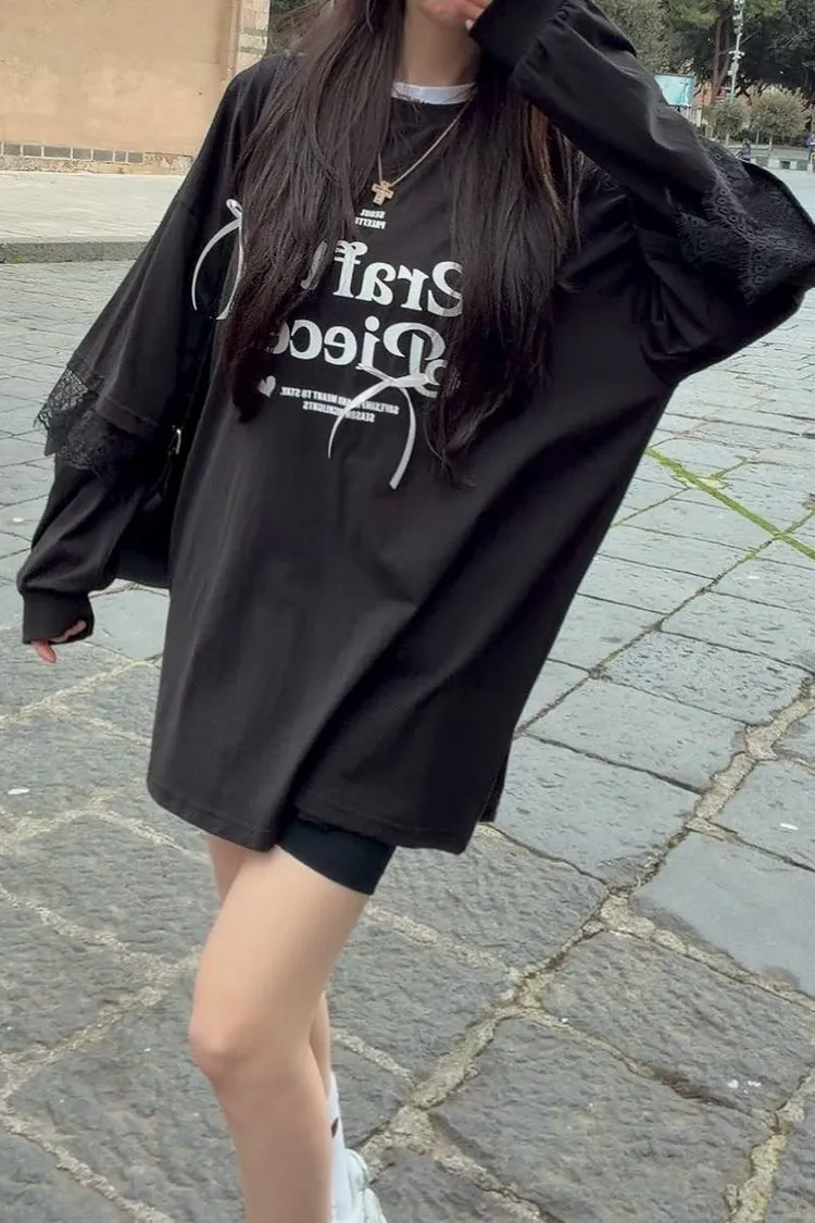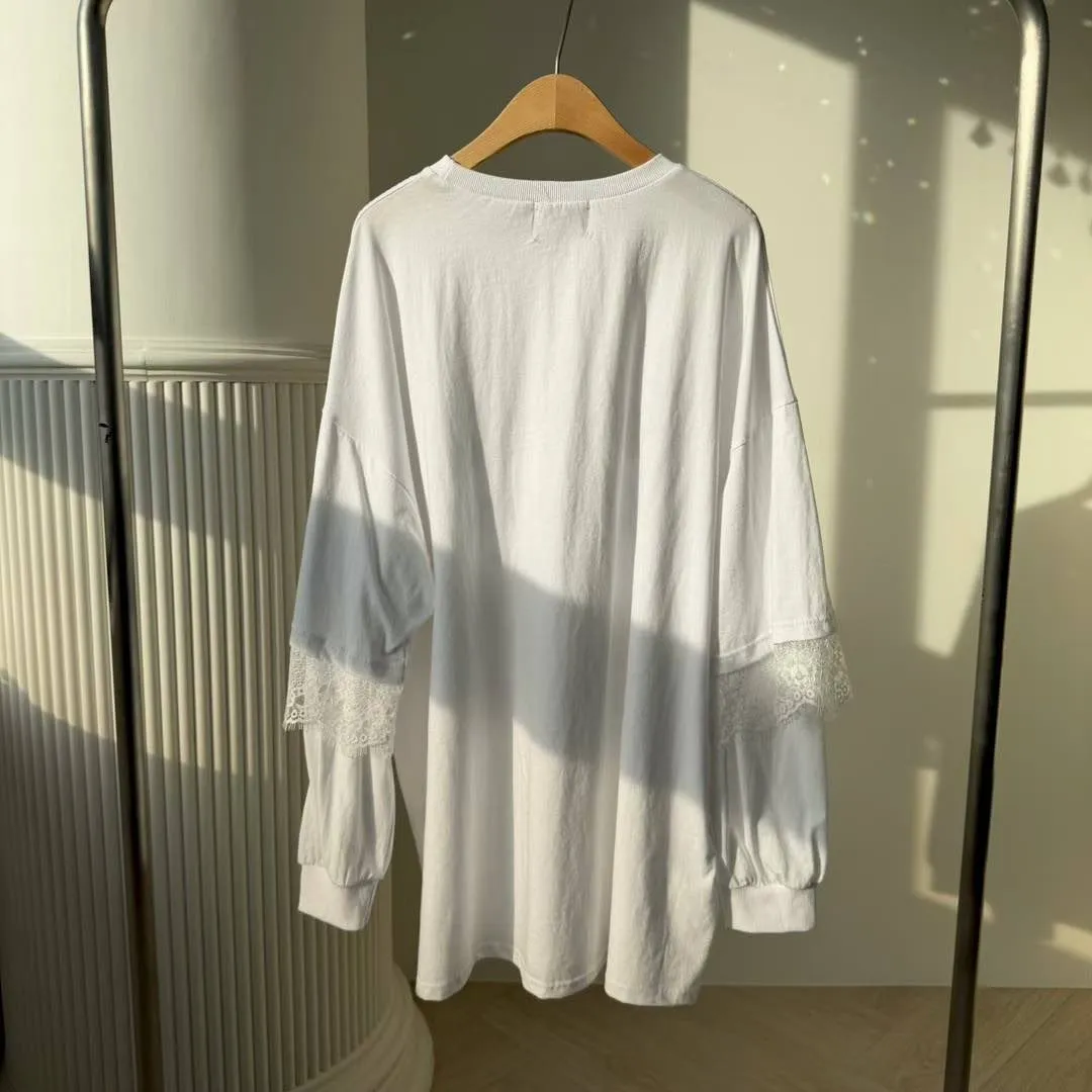 😎甜酷女孩必入!蕾絲拼接緞帶寬鬆長版上衣(黑/白)