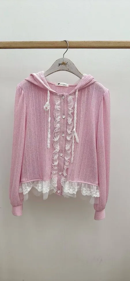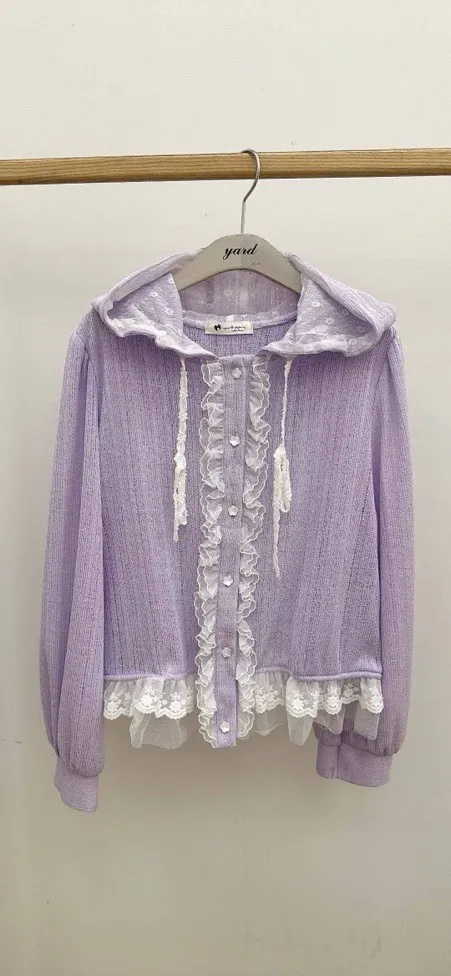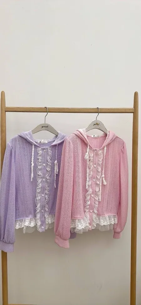 【輕甜花漾】法式蕾絲荷葉邊連帽針織開衫 (粉/紫兩色)