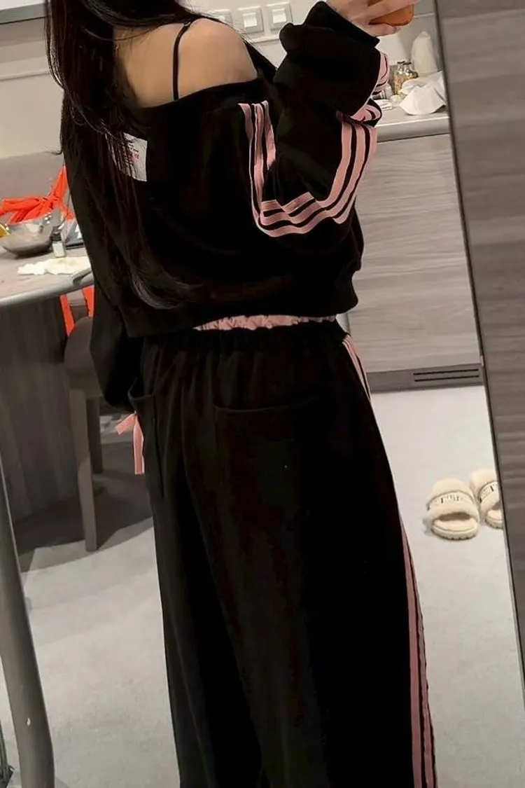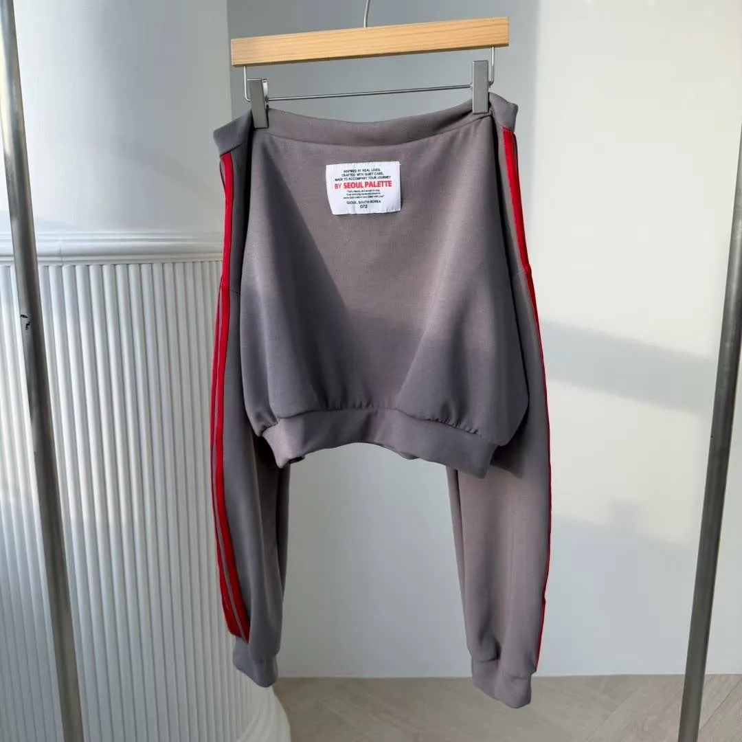 美式復古一字領露肩三線條紋運動套裝 (兩色入)