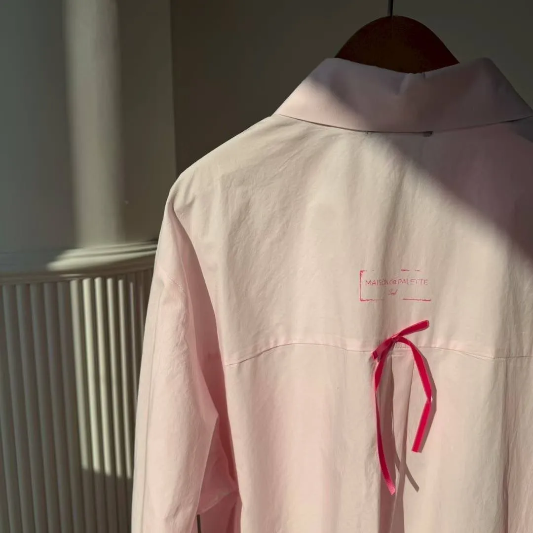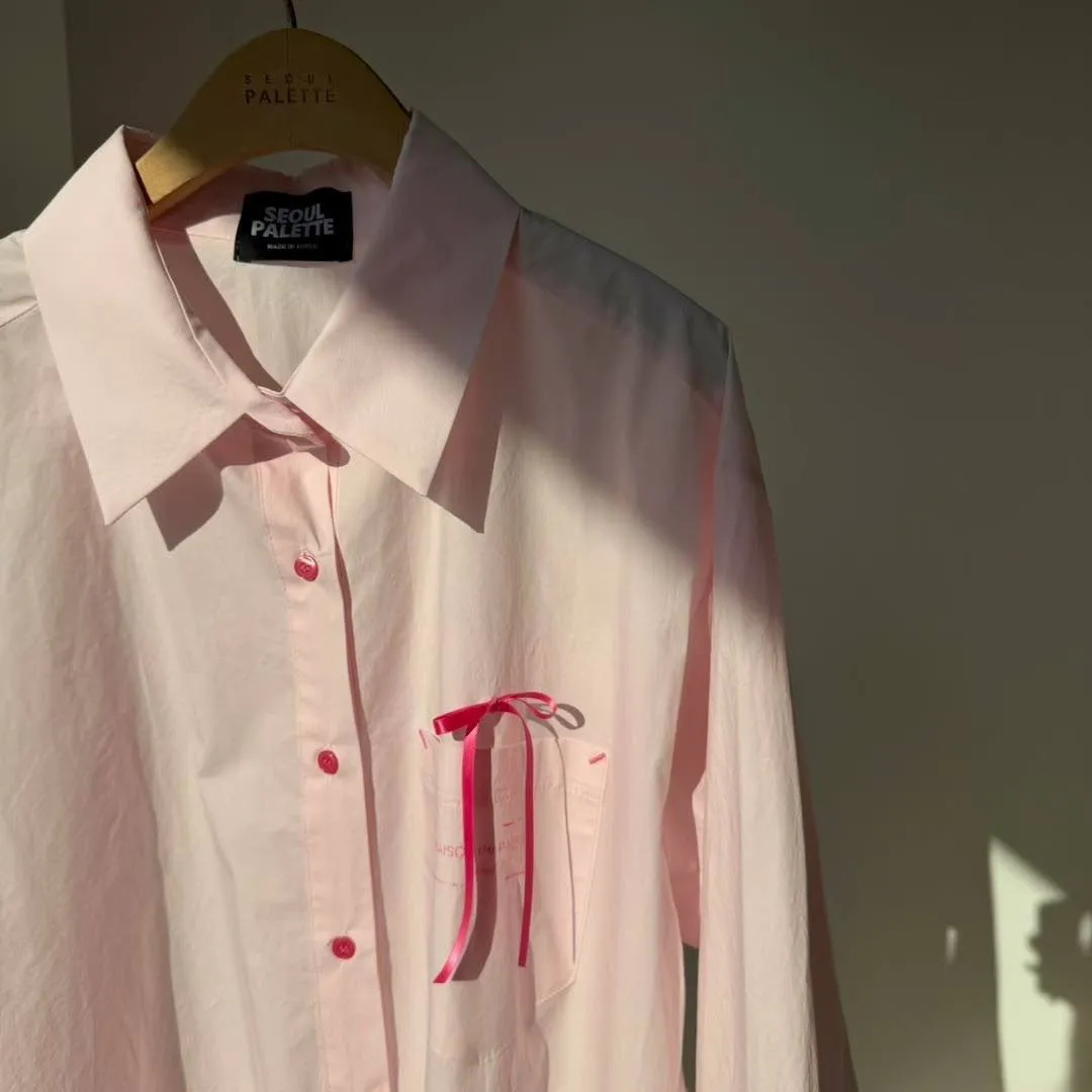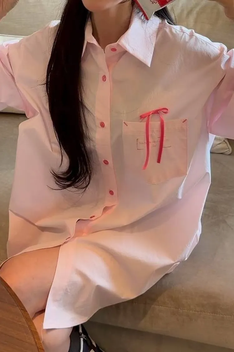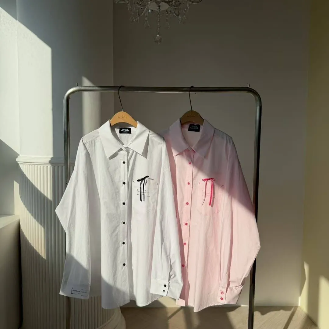 🖤襯衫:法式緞帶刺繡長版襯衫 (White/Pink)