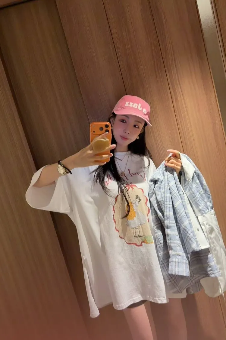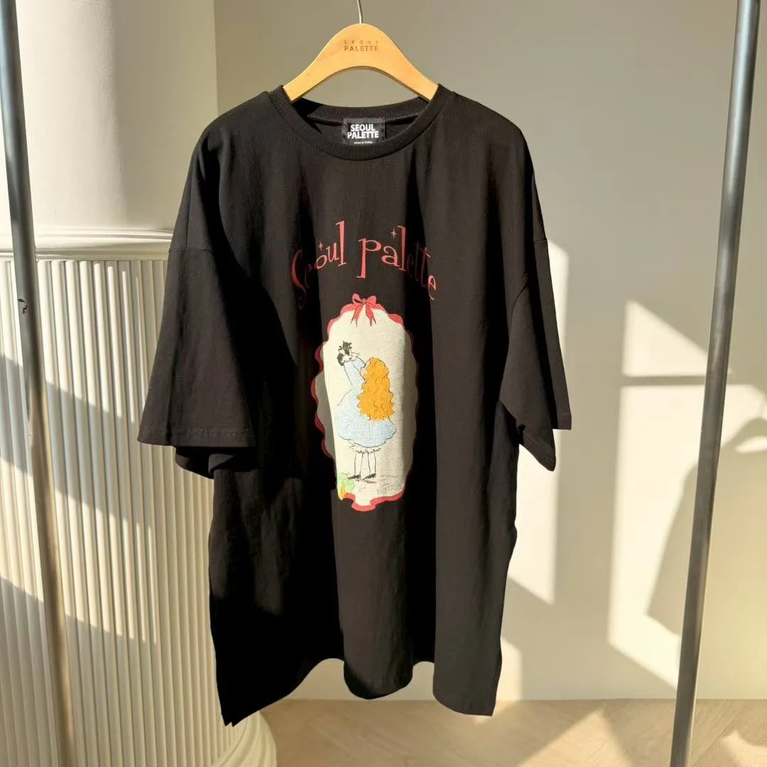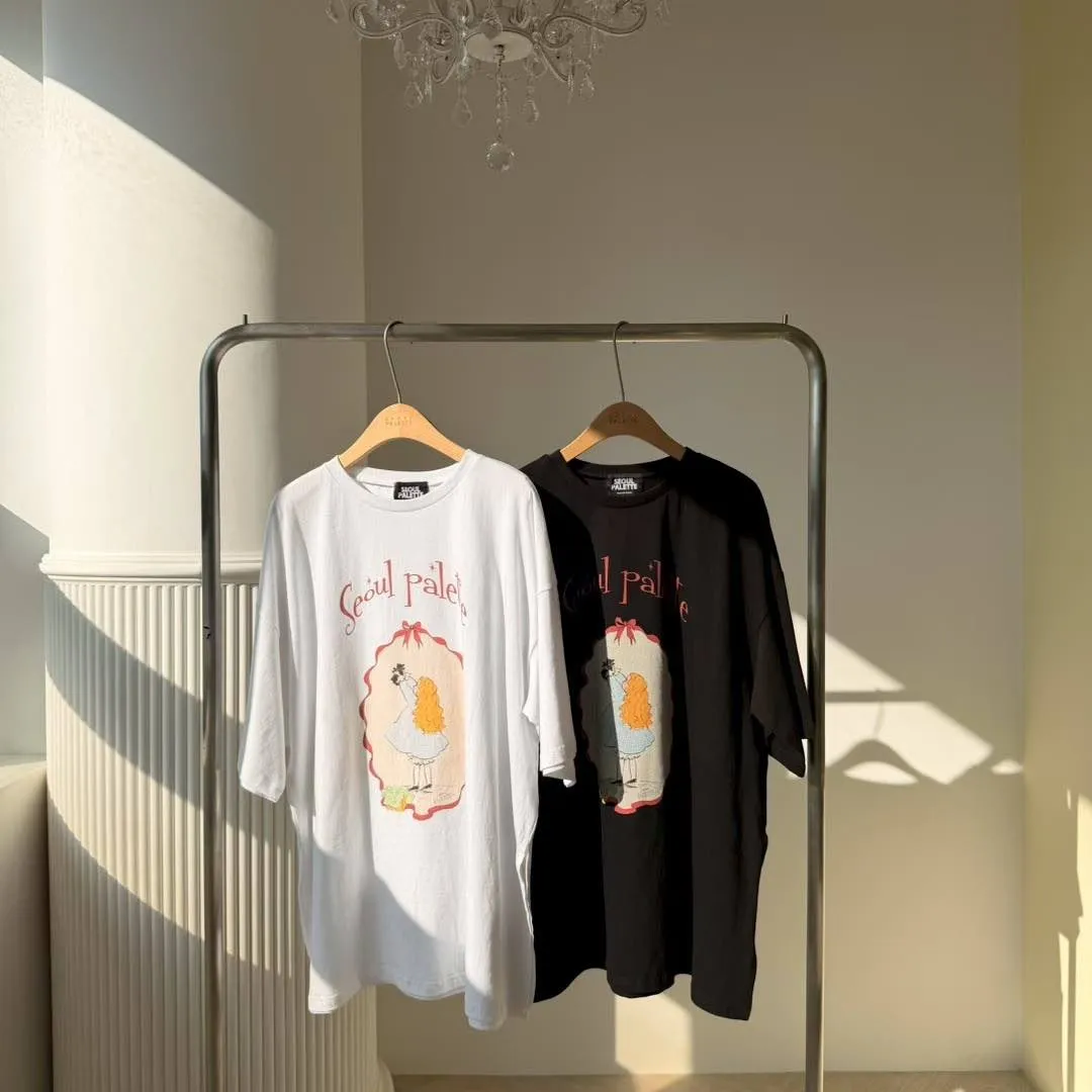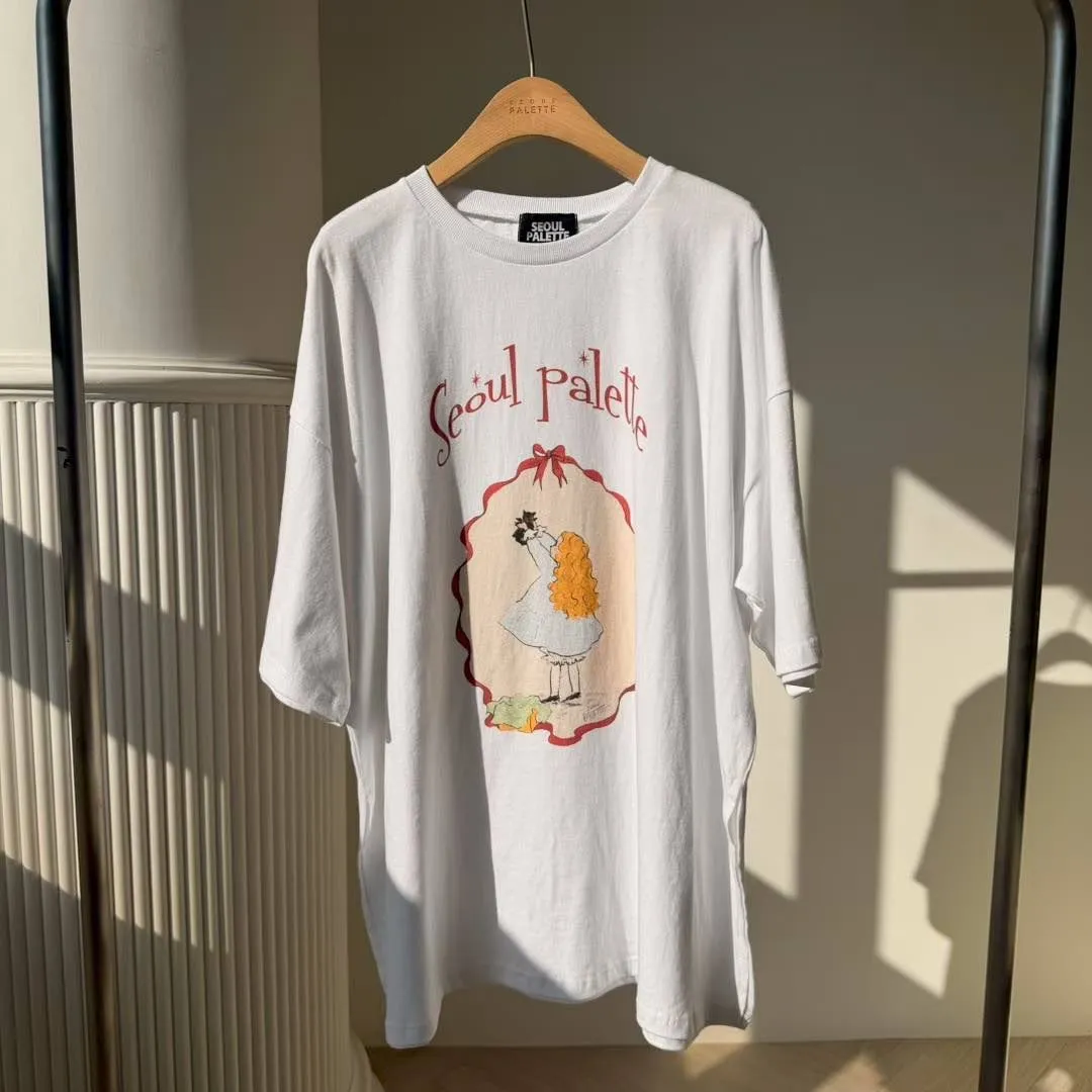 美式復古與韓系少女感的完美結合 🎀 大大的寬版剪裁,胸前的精緻人像圖案點綴出復古氛圍。 不管是搭配小短褲玩「下身失蹤」,還是隨意紮進牛仔褲,都非常有態度。 全棉材質親膚透氣,出國旅遊、逛街自拍必備的百搭單品!