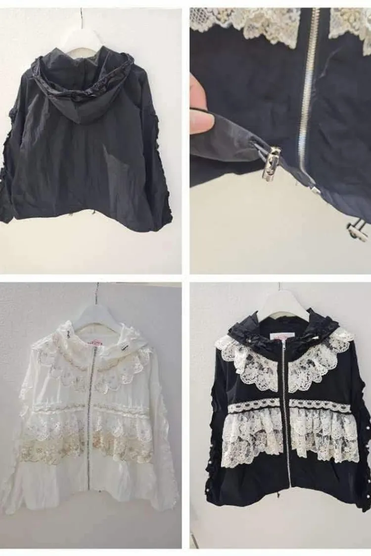 大膽的蕾絲荷葉邊與運動風連帽結合, 把復古宮廷感穿在身上,甜美卻不膩。 側袖還有珍珠排扣裝飾,細節控絕對會瘋掉!