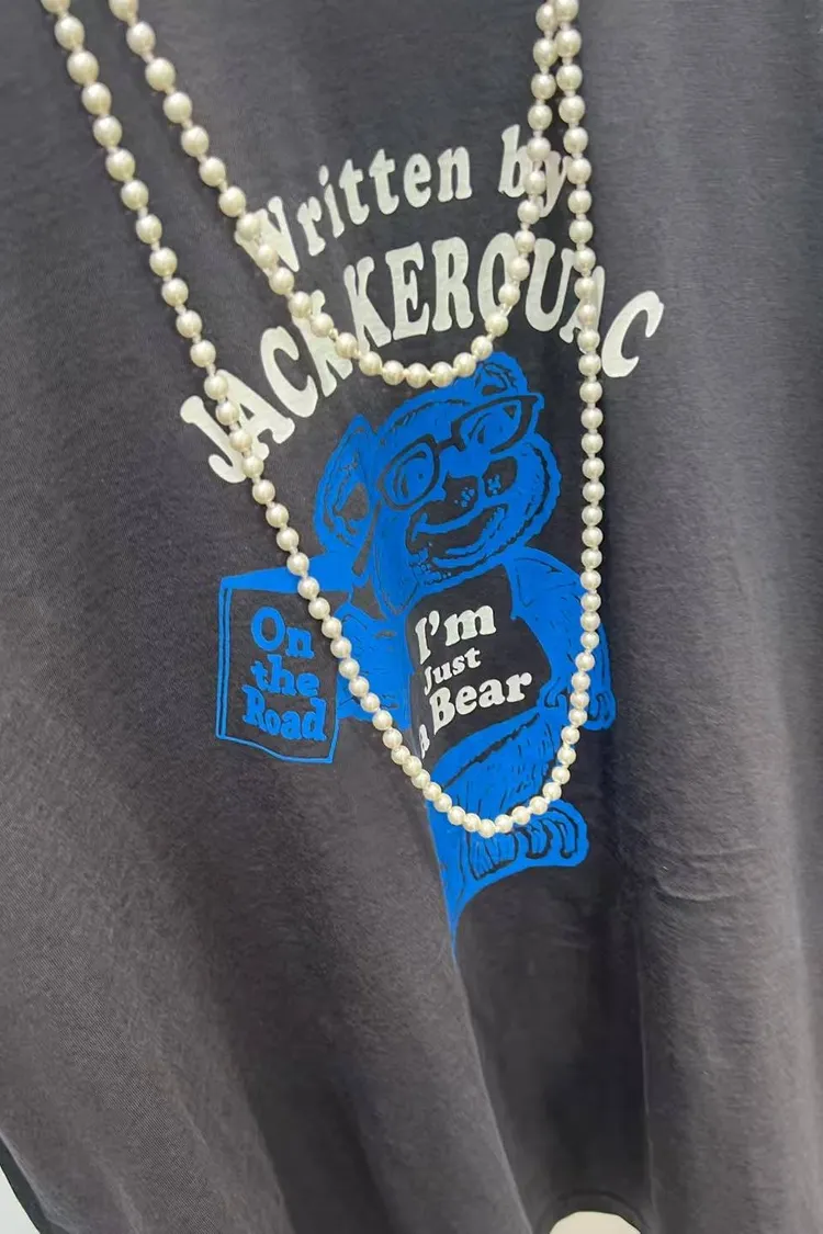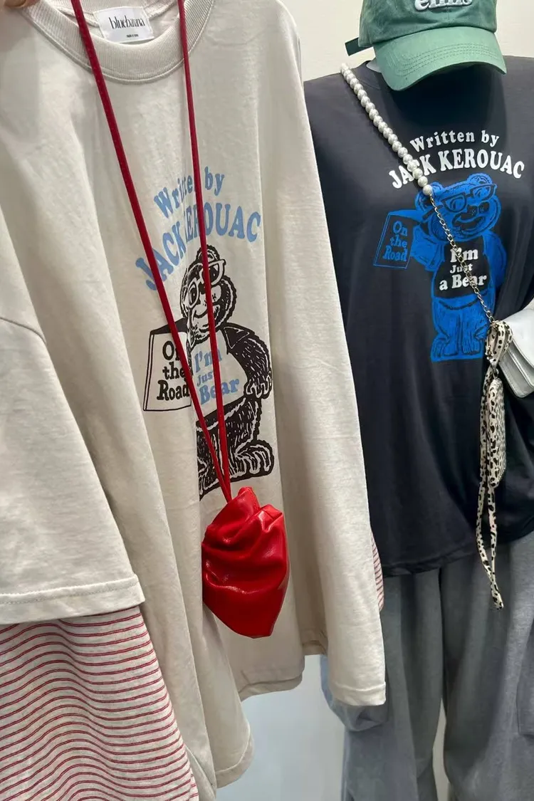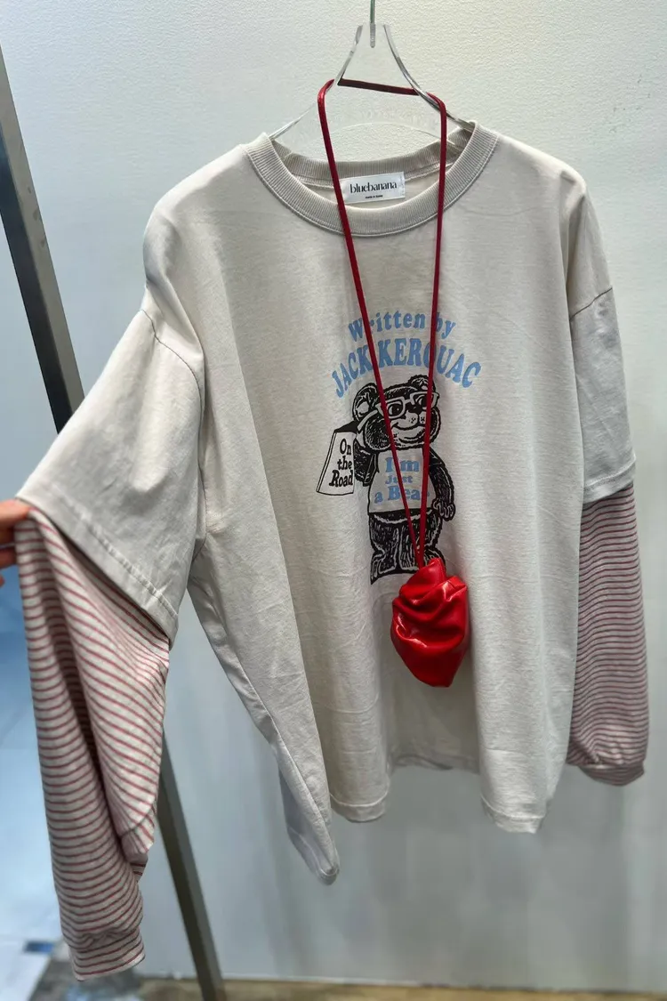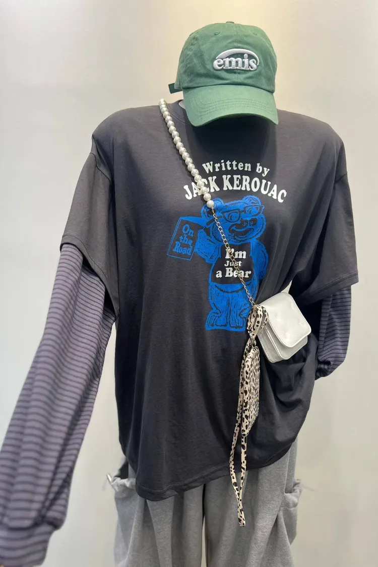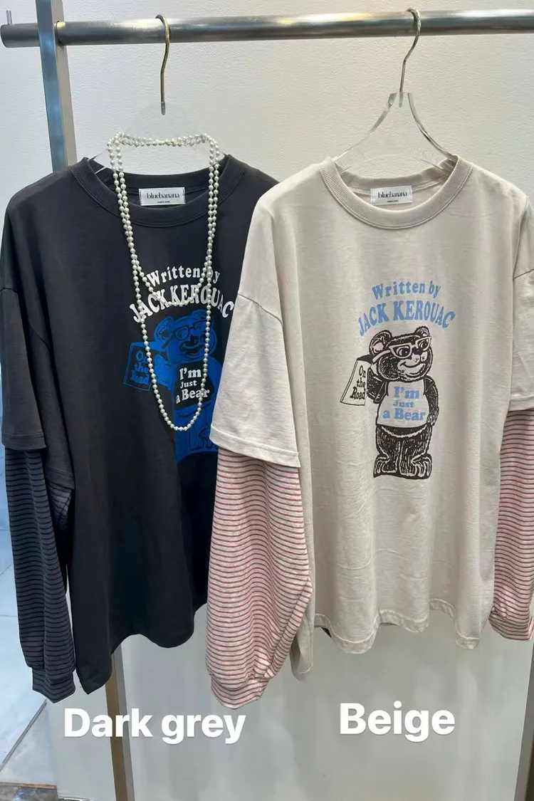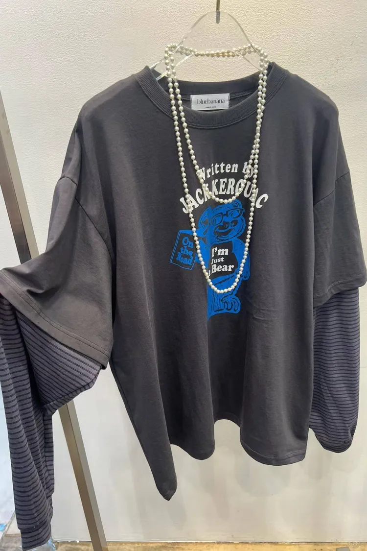 【復古文學系】Jack Kerouac •小熊插畫假兩件條紋長袖 T (深灰/米白)