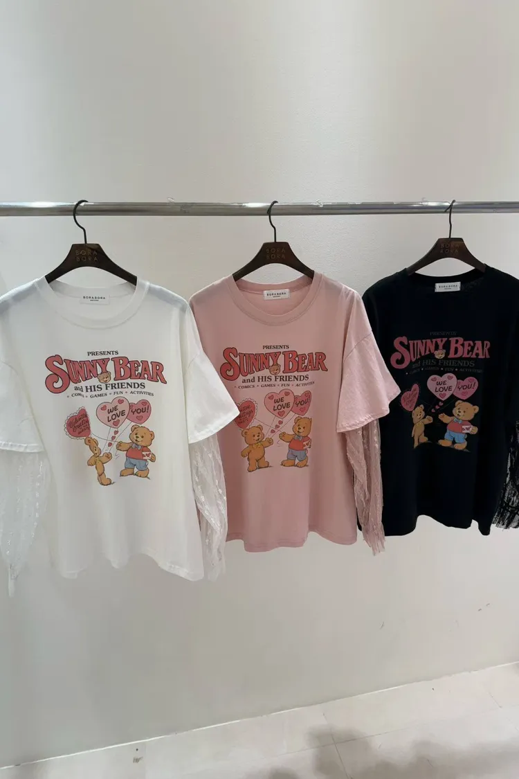 【Maison Evelyn Privé】Sunny Bear 浪漫蕾絲拼接假兩件式美式復古 T-shirt