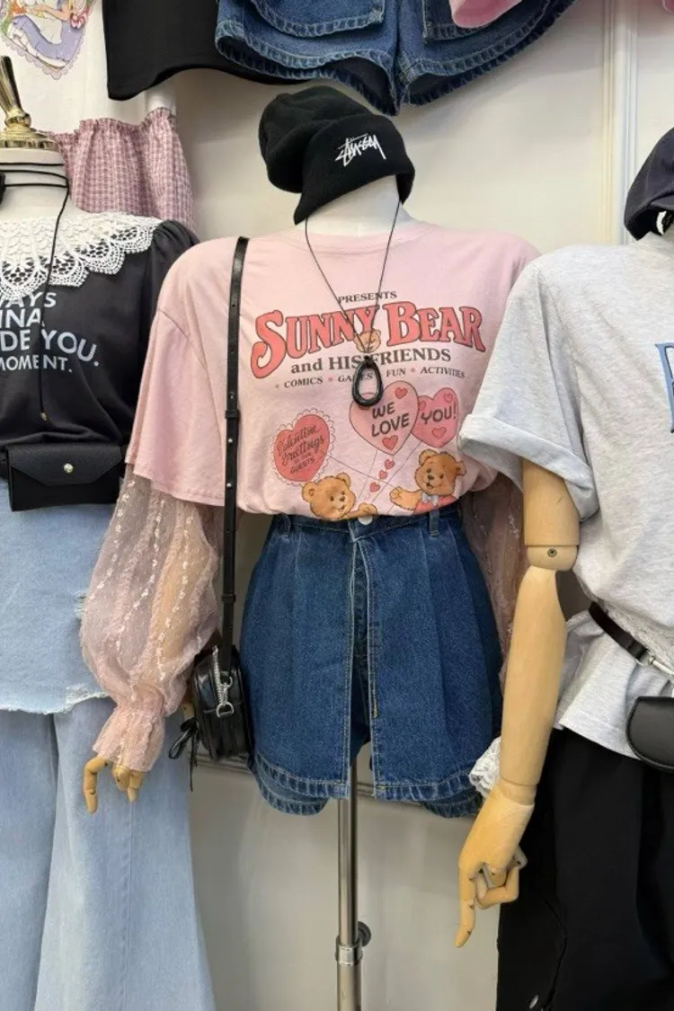 🎀 風格特點:甜心小熊印花 x 夢幻蕾絲長袖