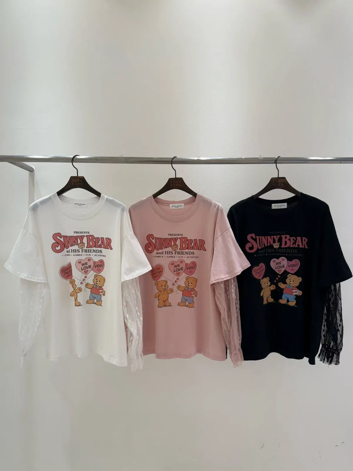 經典的大學 T 剪裁印上超萌的復古小熊,最讓人驚喜的是袖口的 細緻花卉蕾絲拼接 🌸