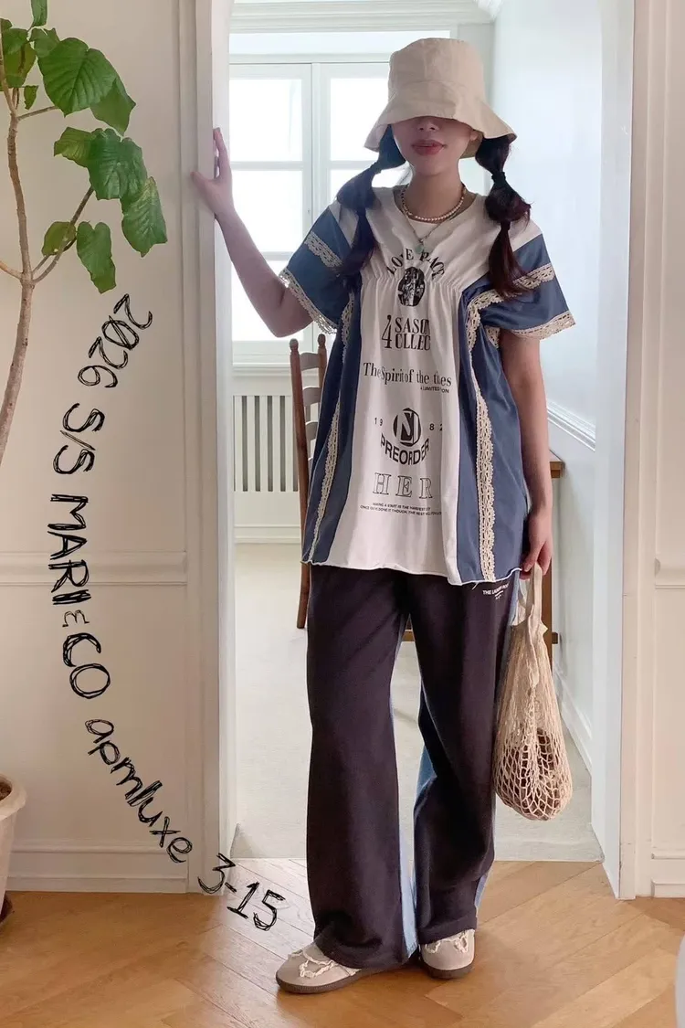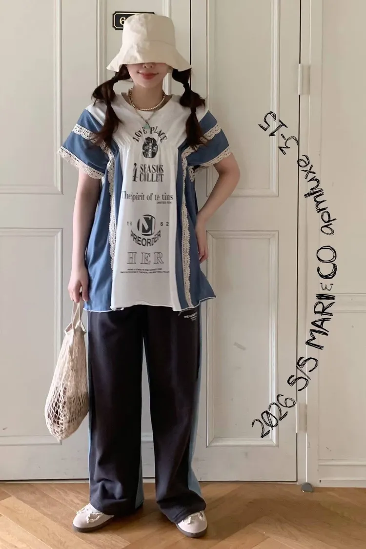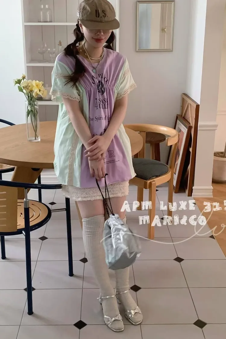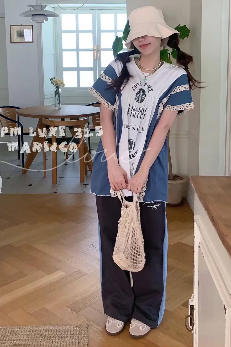 這款撞色拼接設計,不僅富有層次感,更在袖口和拼縫處精心點綴了精緻的蕾絲花邊,將休閒與甜美完美融合。