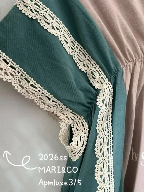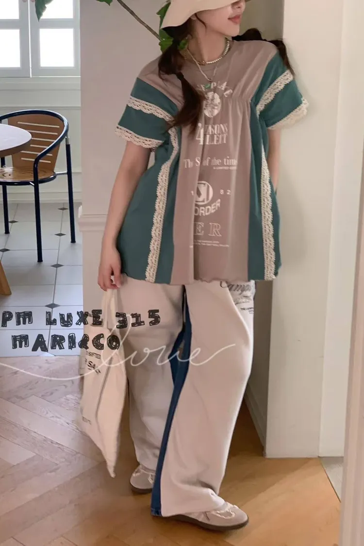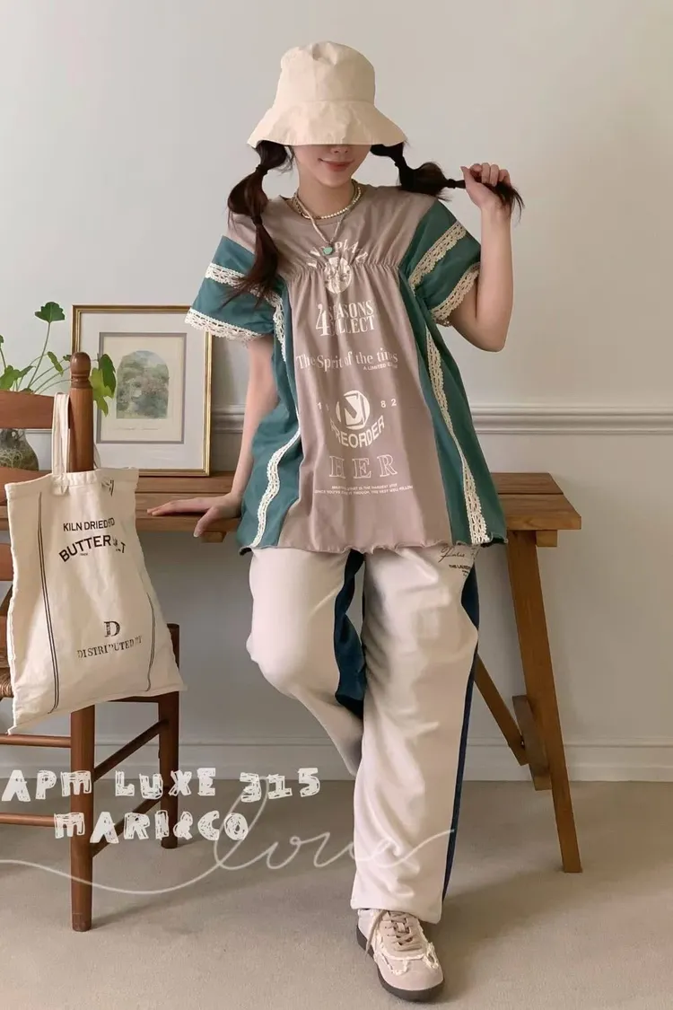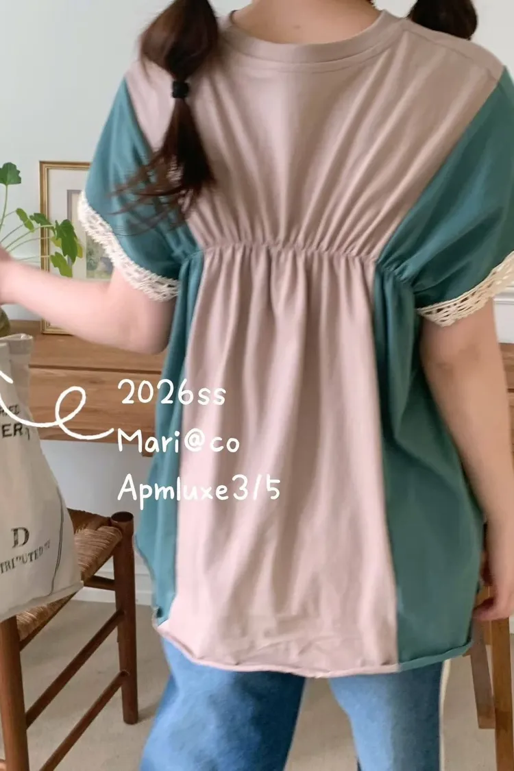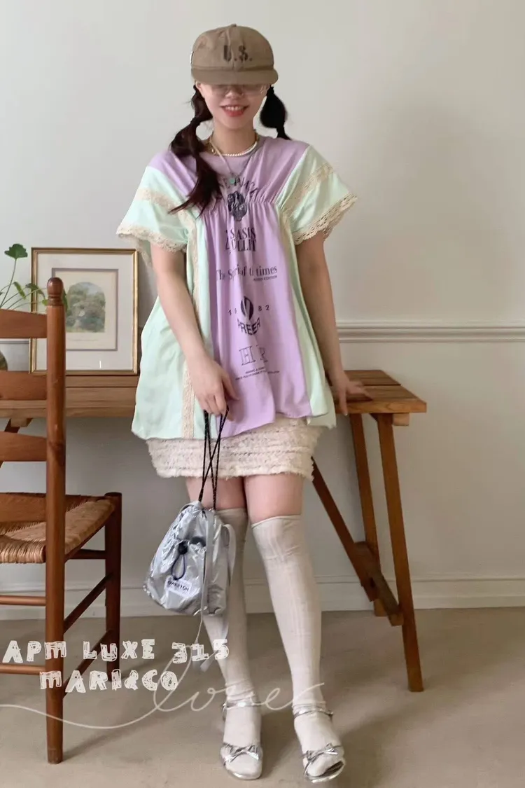 這款撞色拼接設計,不僅富有層次感,更在袖口和拼縫處精心點綴了精緻的蕾絲花邊,將休閒與甜美完美融合。