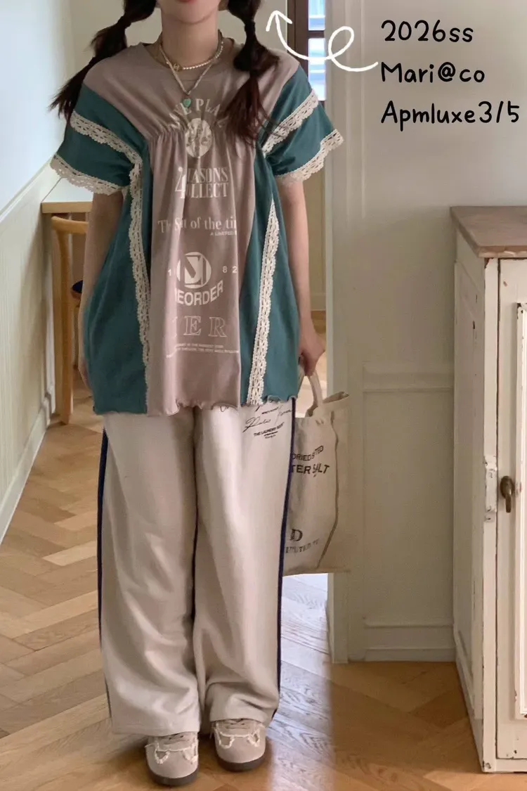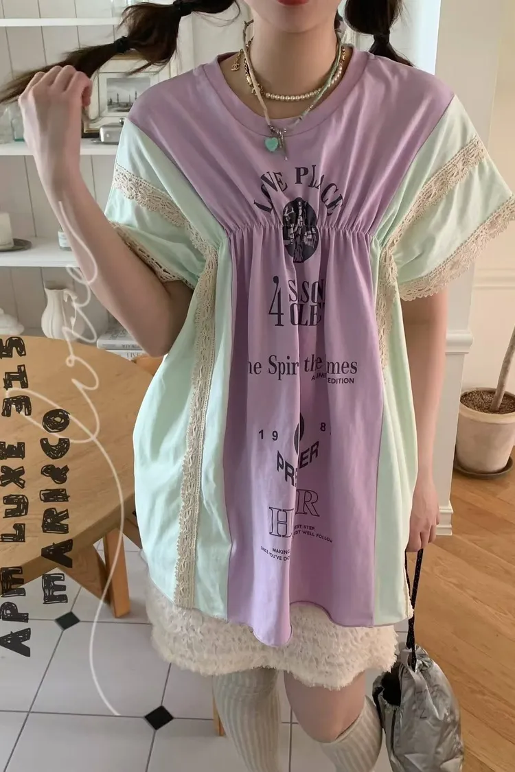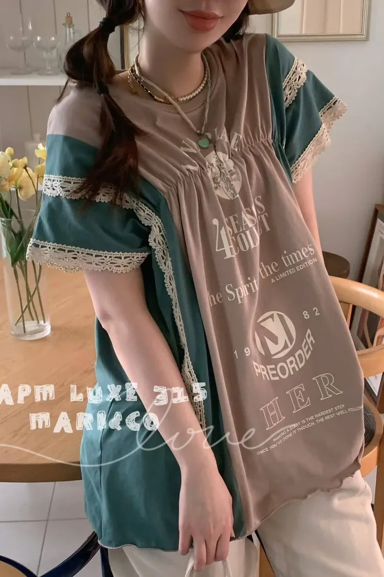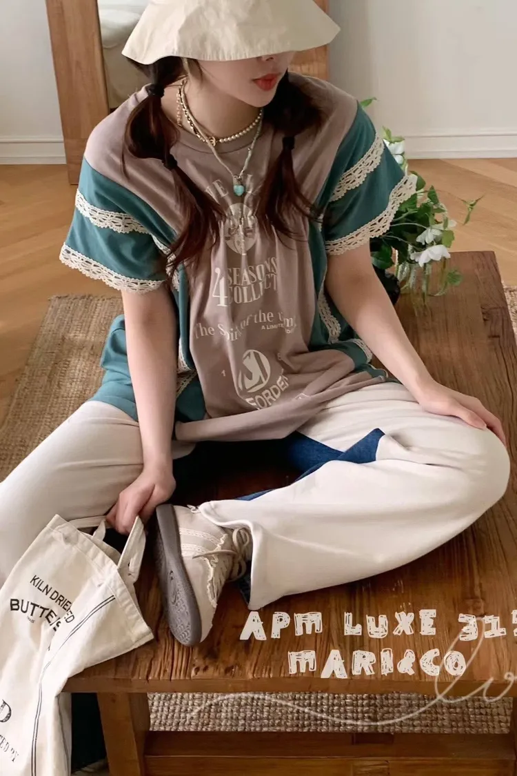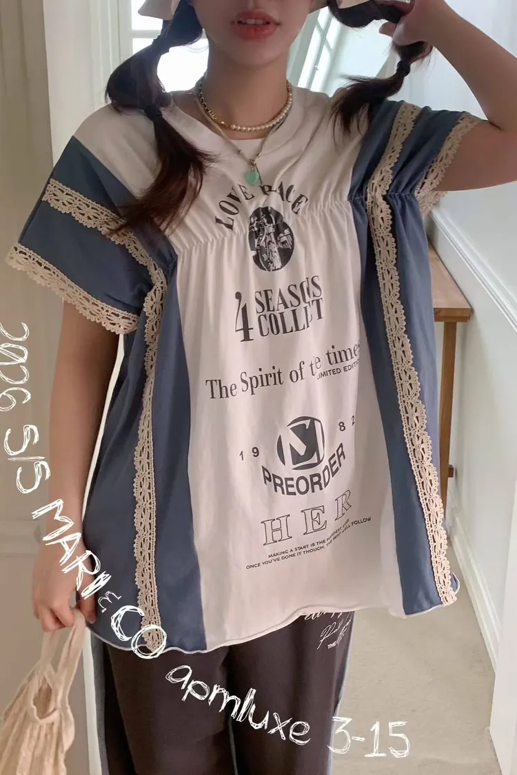 天哪!這件拼接T恤也太可愛了吧!💕 蕾絲與復古印刷的夢幻結合!