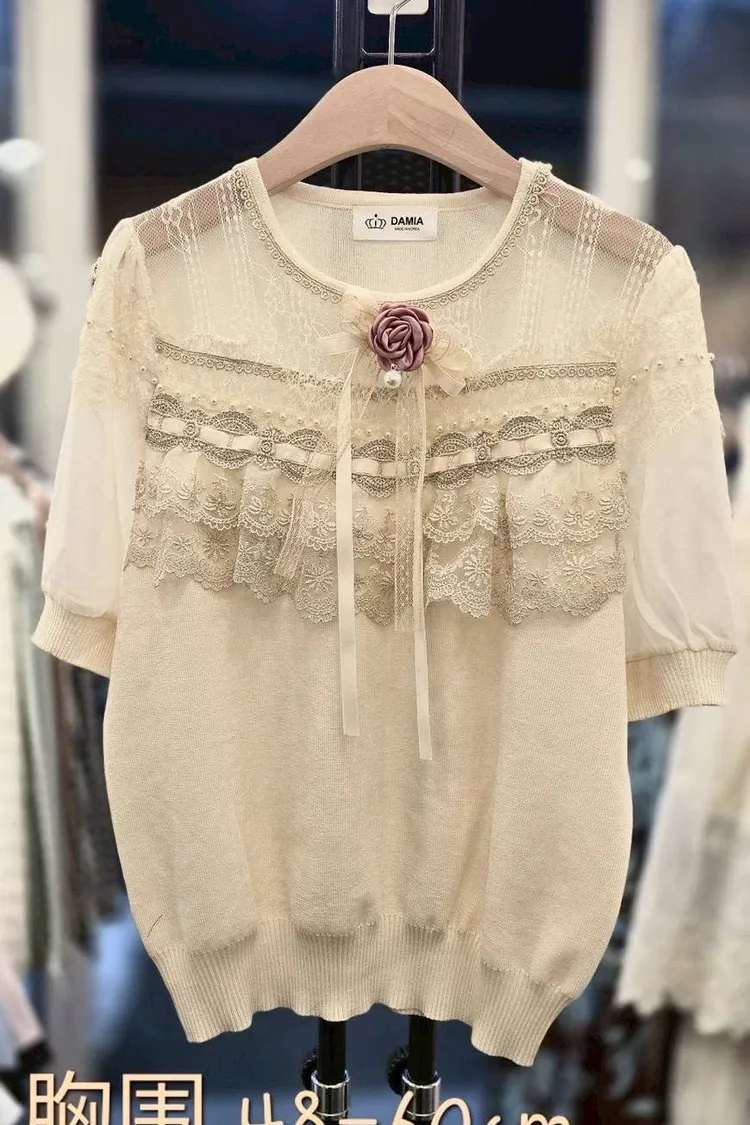 袖口與領口採用微透膚的雪紡與蕾絲拼接,若隱若現的視覺感非常修飾手臂線條。