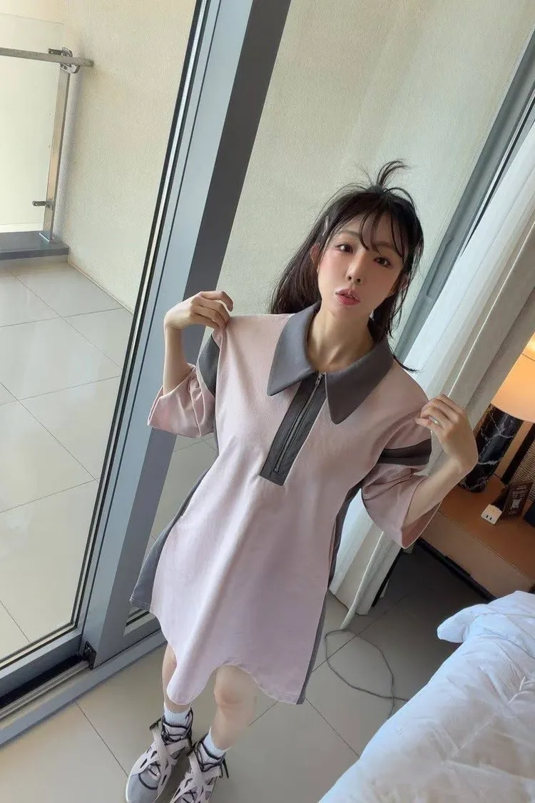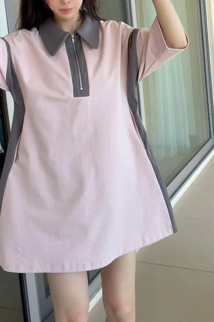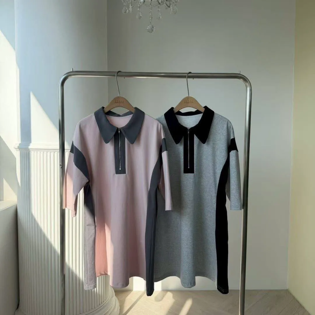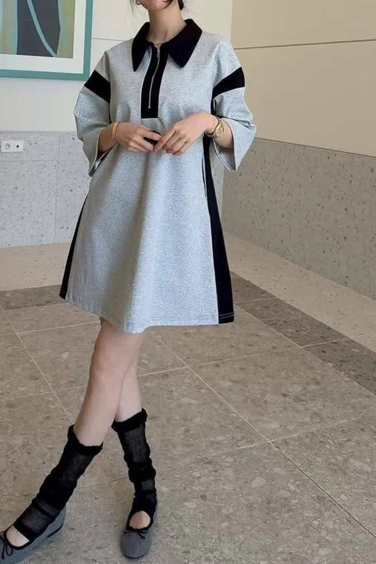「甜酷撞色」拉鍊翻領運動風連身裙 (彈性棉質 / 雙色入)