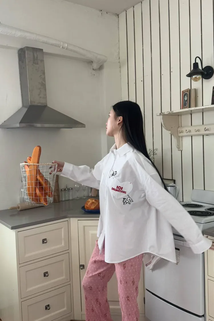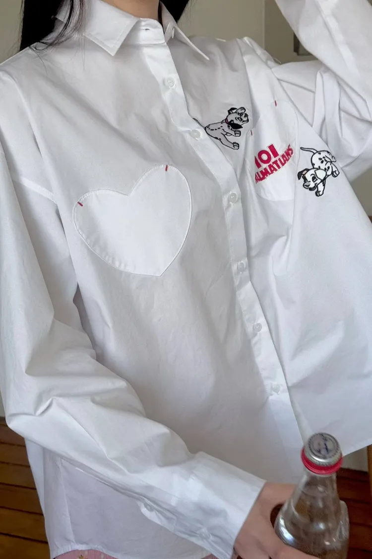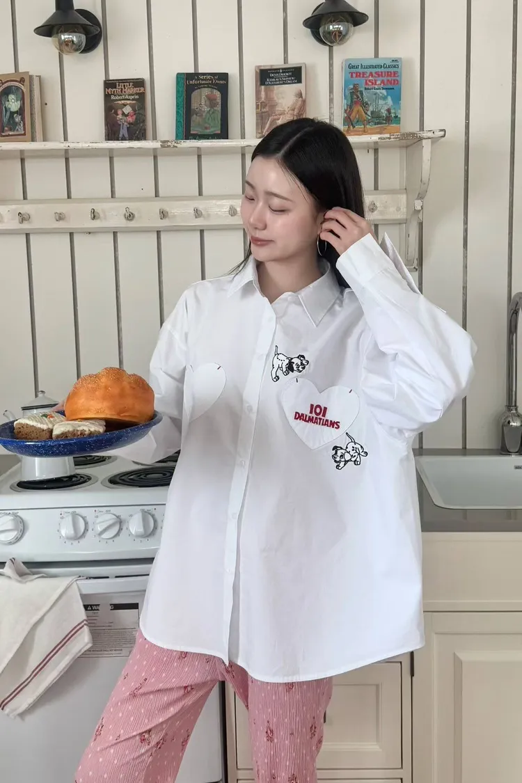 【迪士尼系列】101忠狗愛心貼布超大版型襯衫 (白)