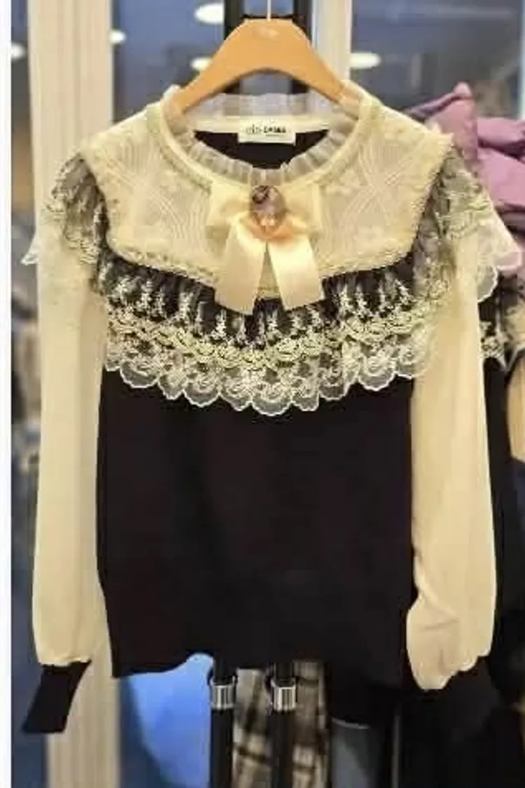 領口和袖口的蕾絲設計增添了復古的浪漫氣息,而胸前精緻的蝴蝶結與珠飾則點綴出甜美的少女感。
