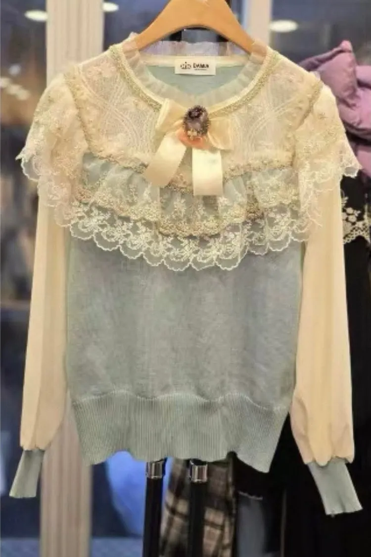 這款針織上衣融合了精緻的蕾絲與輕盈的雪紡,打造出層次感豐富的視覺效果。
