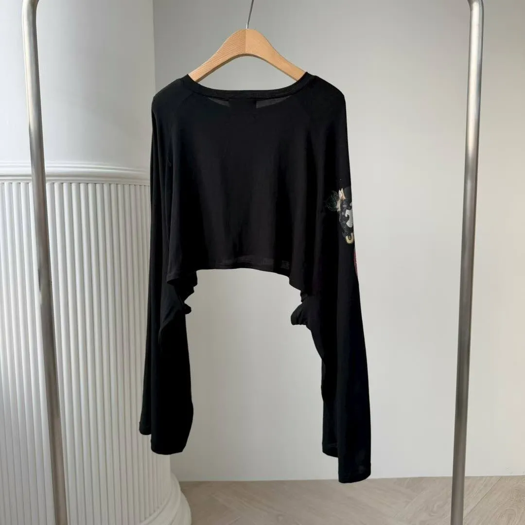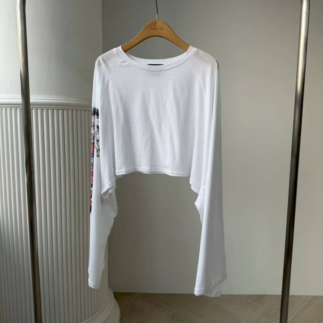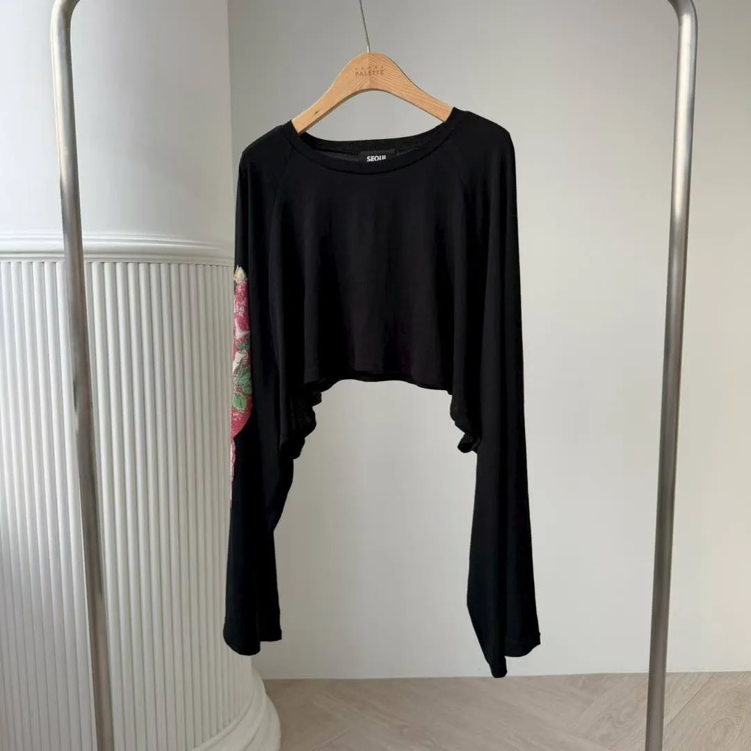 這款短版 T 真的太有態度了! 袖口的大面積印花,巧妙結合了美式機車與經典玫瑰圖騰 復古中帶點小叛逆,完全是 #Coquette 少女的必備單品。