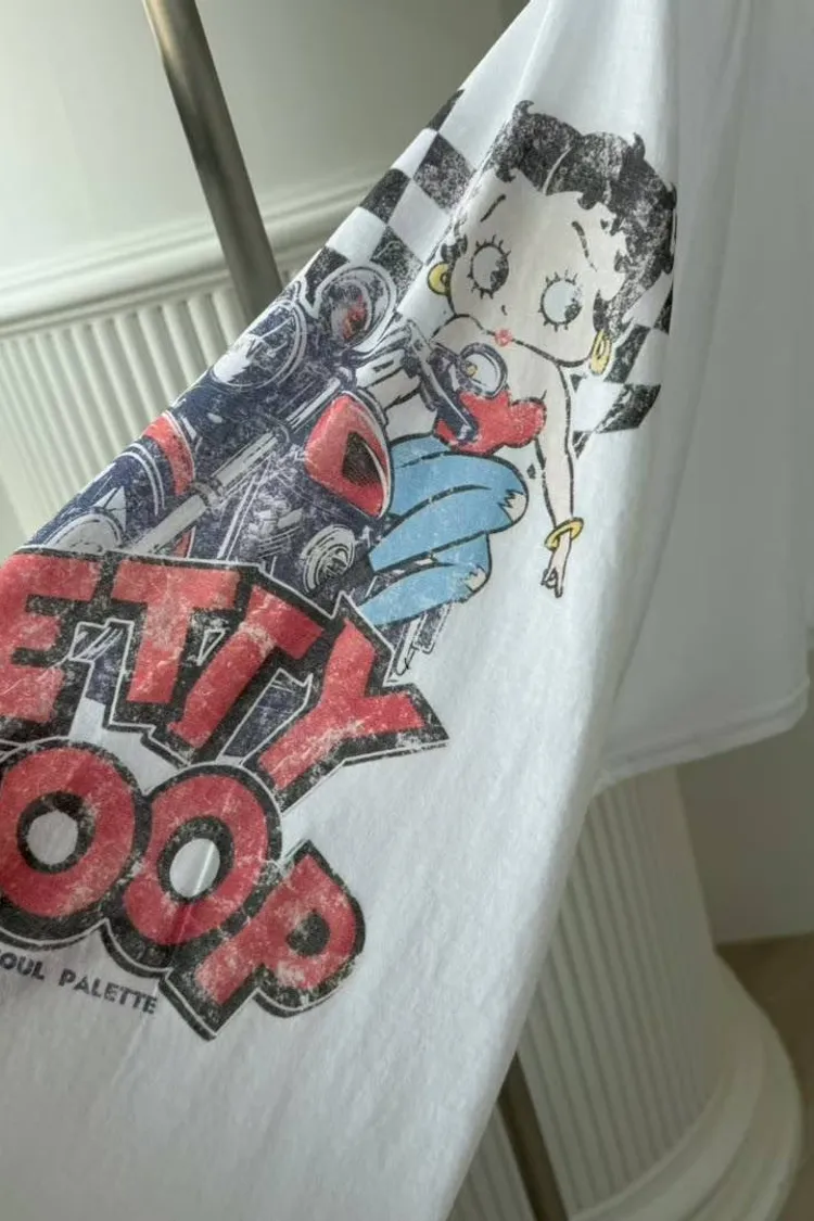 【26S/S 復古貝蒂】美式機車玫瑰印花.極簡寬袖短版圓領 T (黑/白)