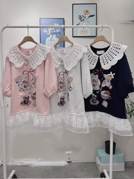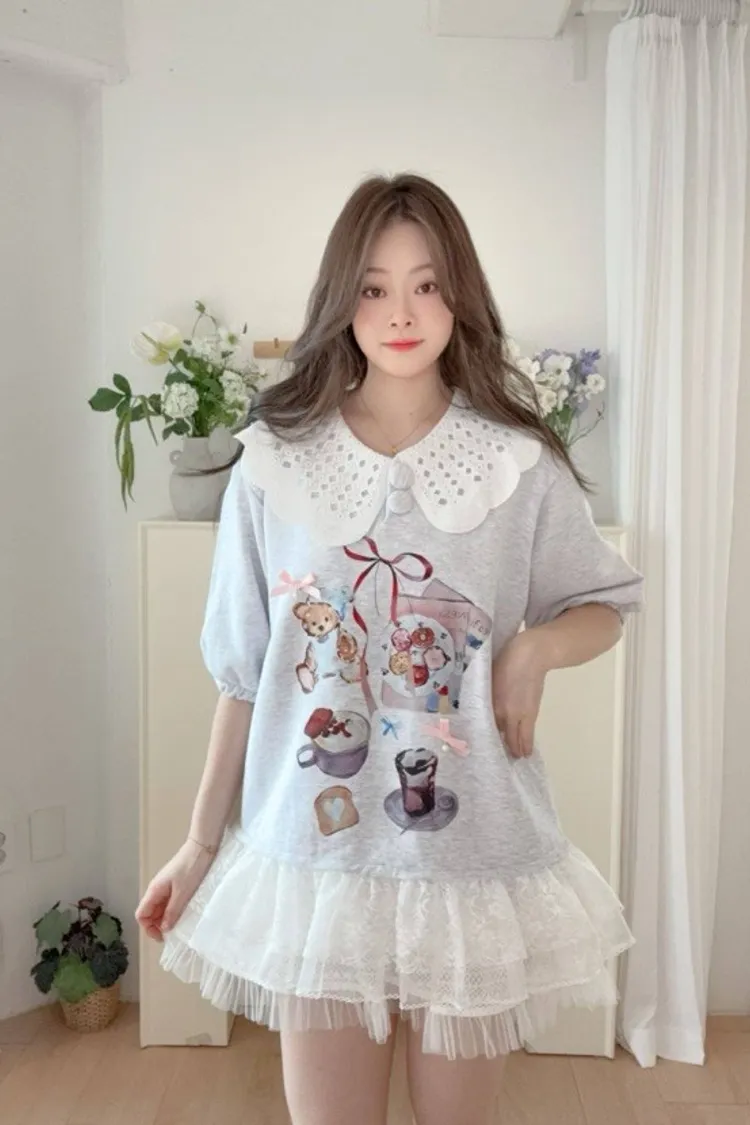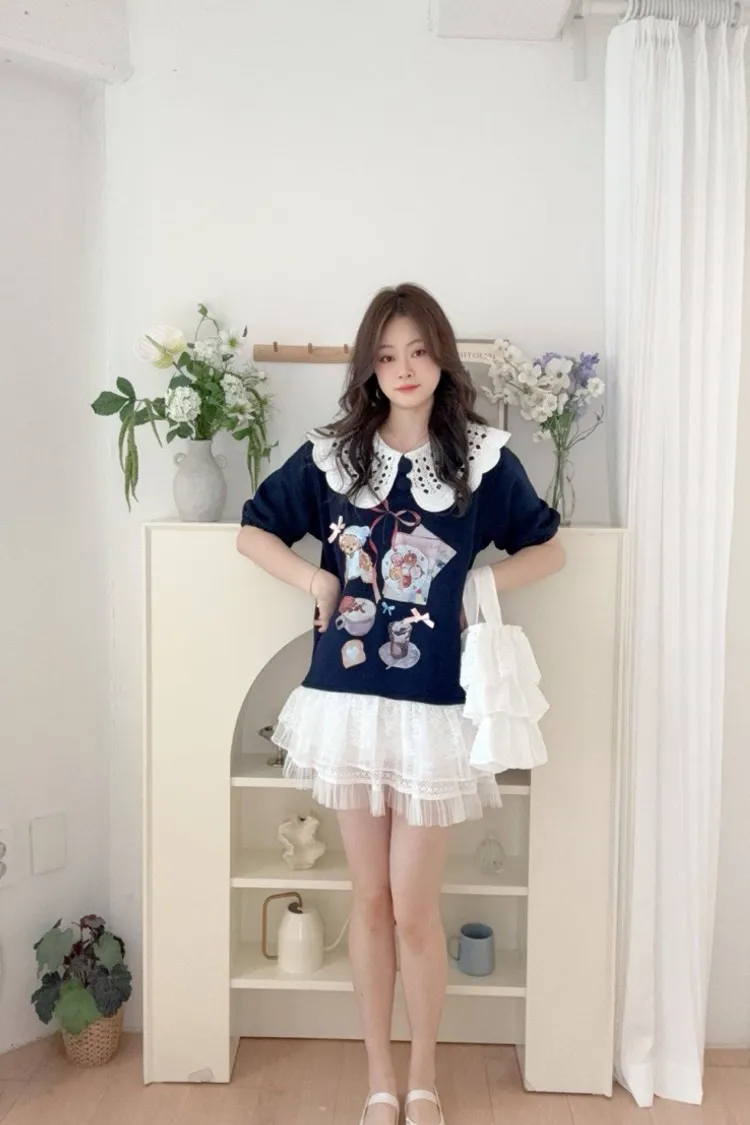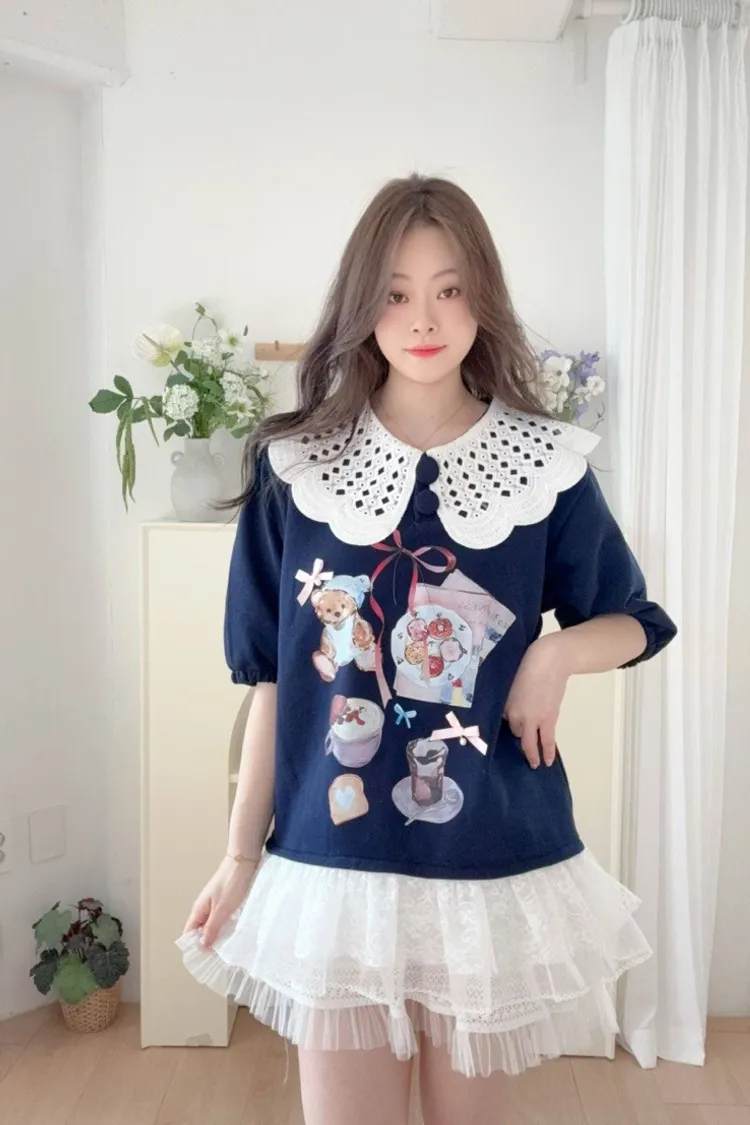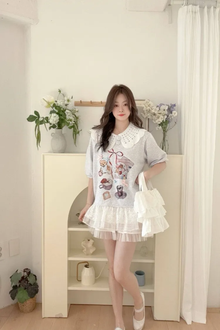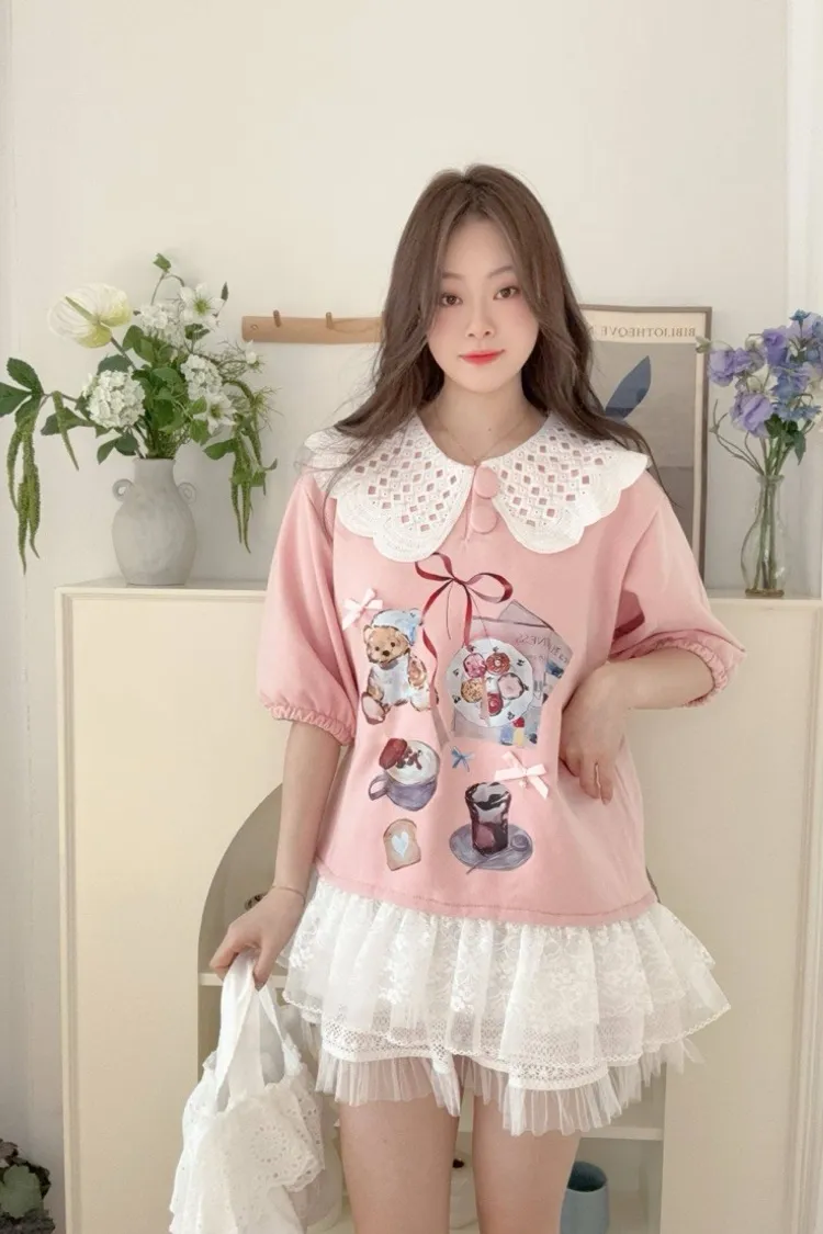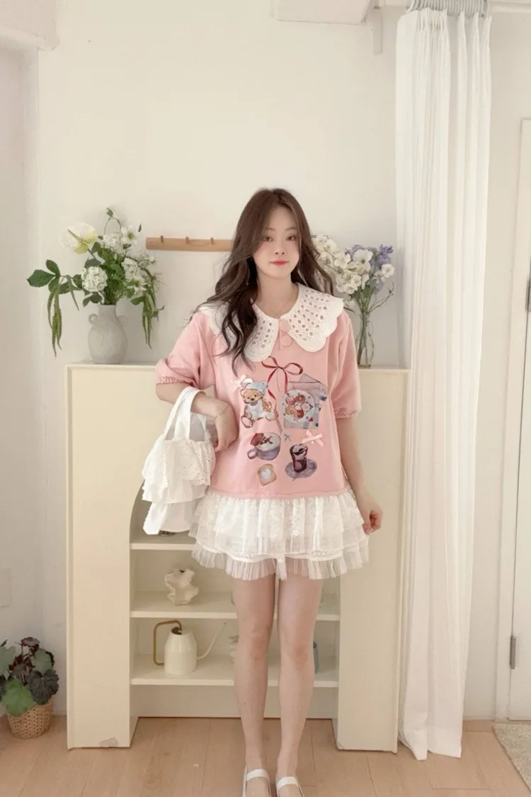 甜點小熊 ‧ 蕾絲花邊領短袖上衣 -三色入