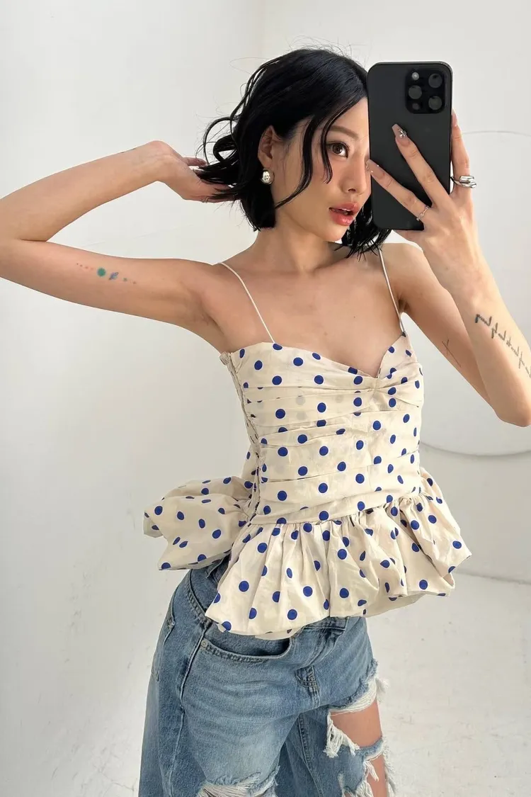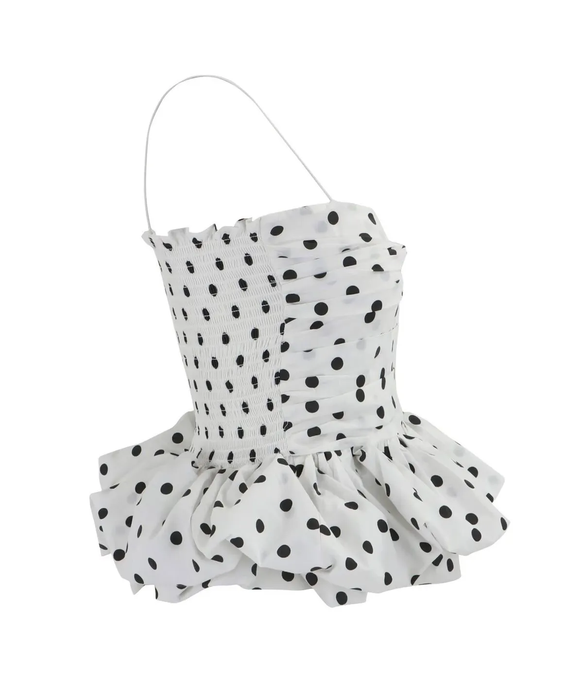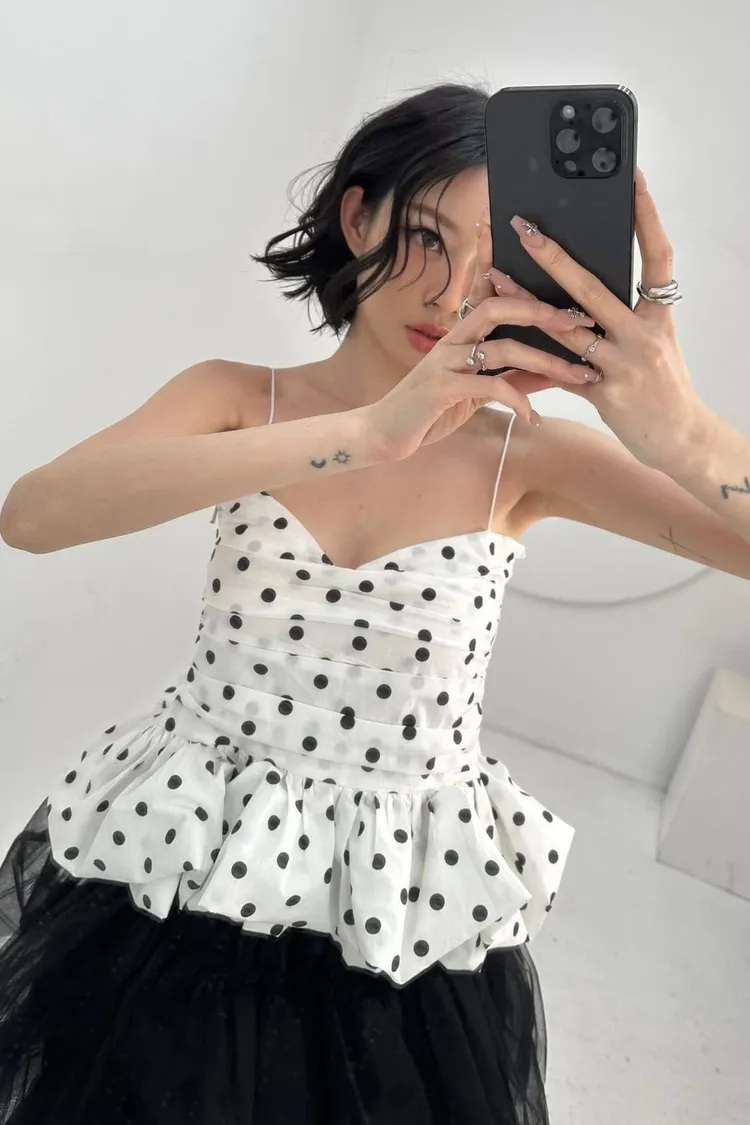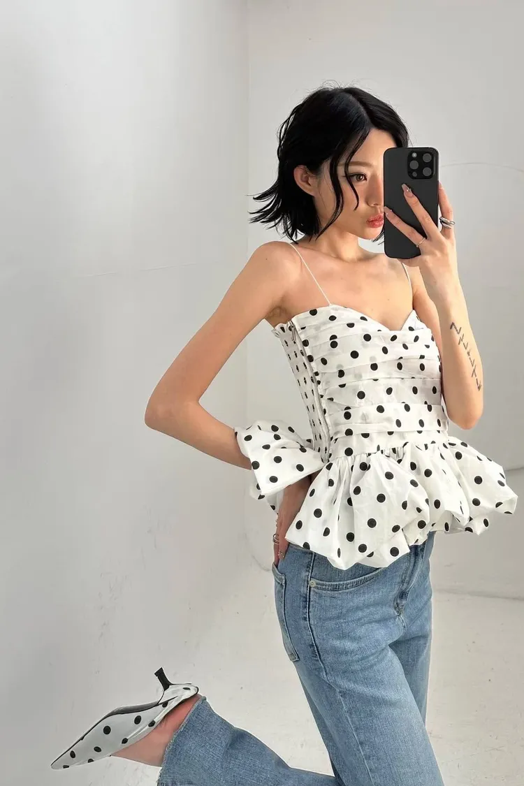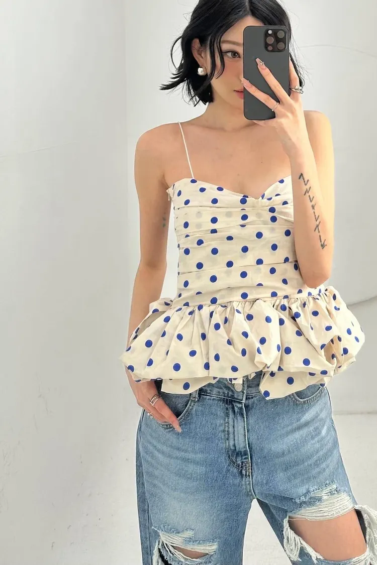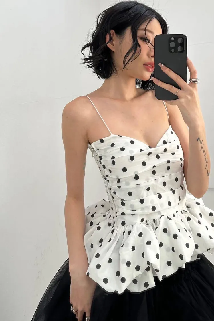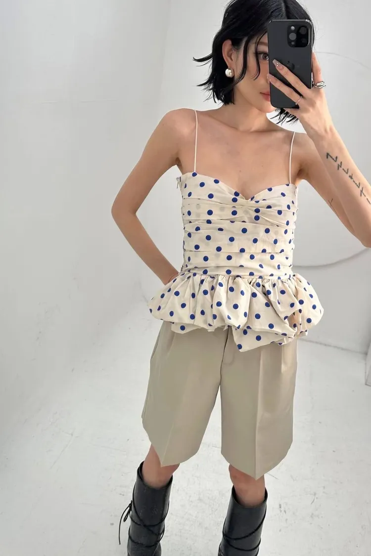 【法式復古】赫本風波點抓皺荷葉邊蓬蓬吊帶背心
