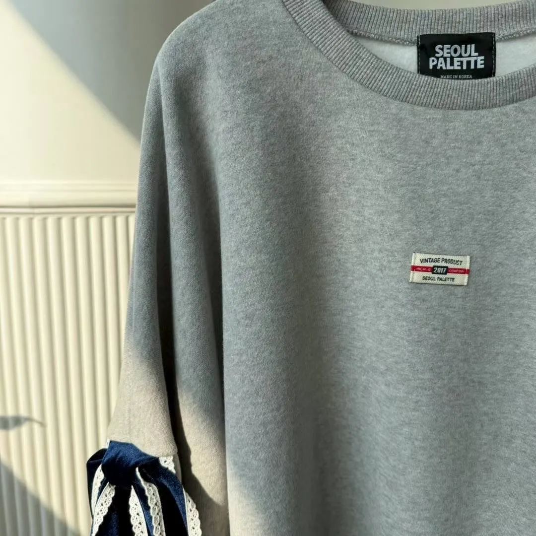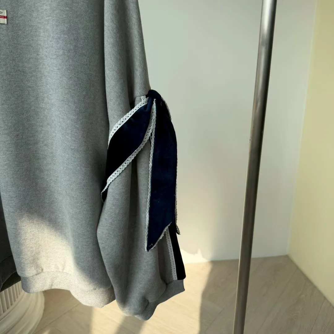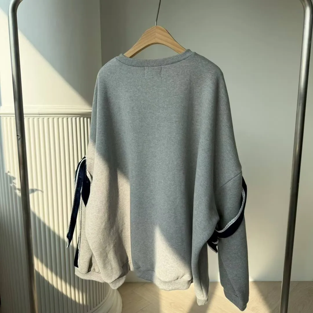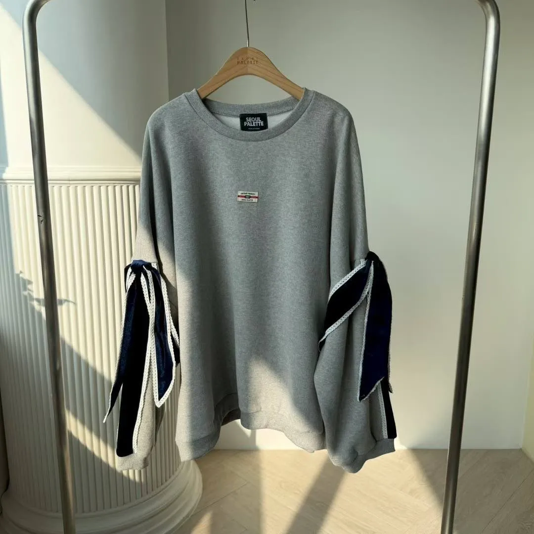 【Seoul Palette】法式甜酷風:絲絨拼色蝴蝶結裝飾落肩寬版衛衣 (灰/黑)