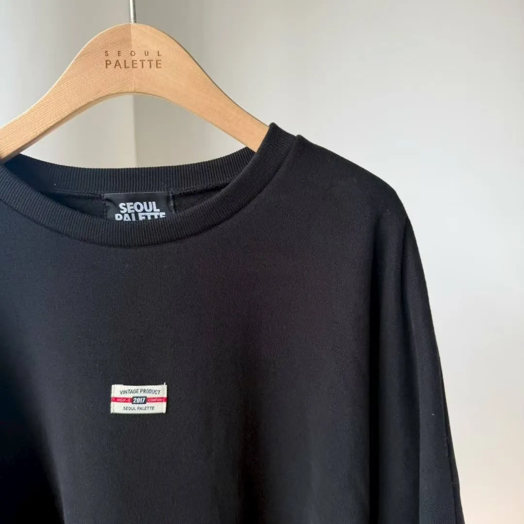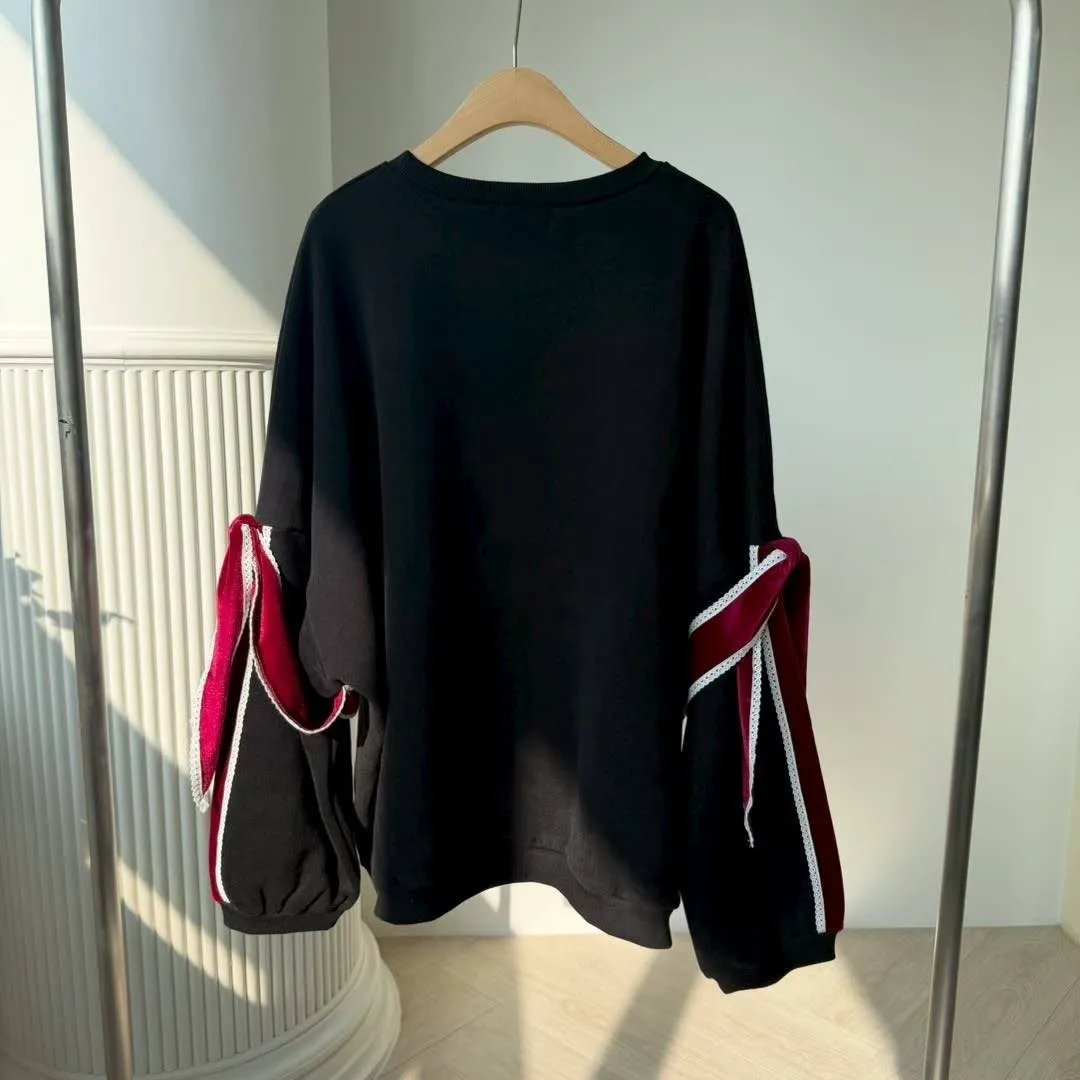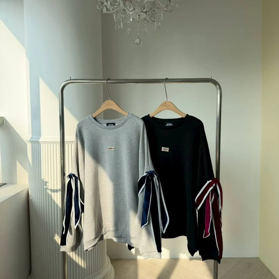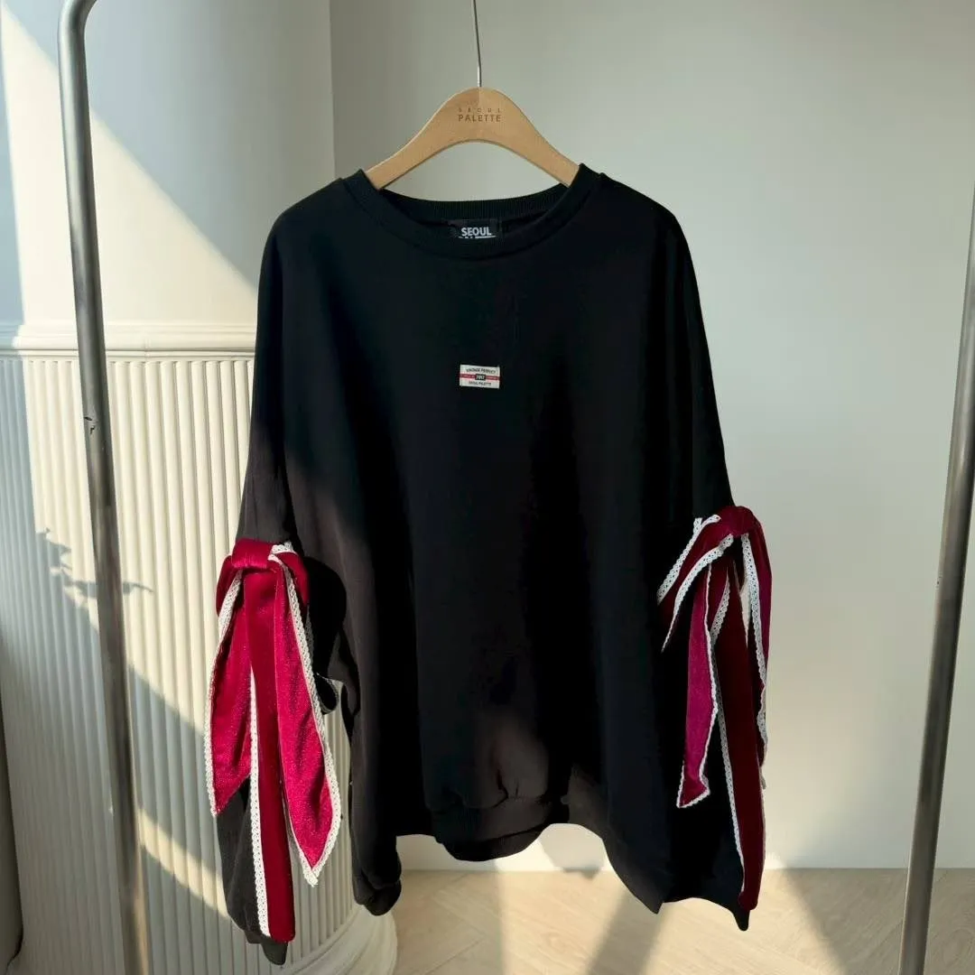 【Seoul Palette】法式甜酷風:絲絨拼色蝴蝶結裝飾落肩寬版衛衣 (灰/黑)