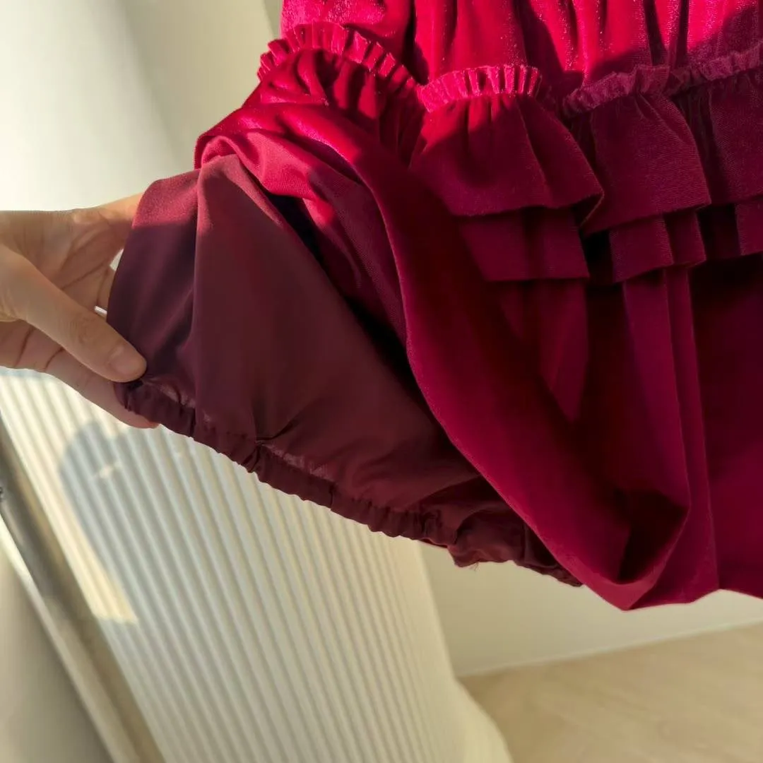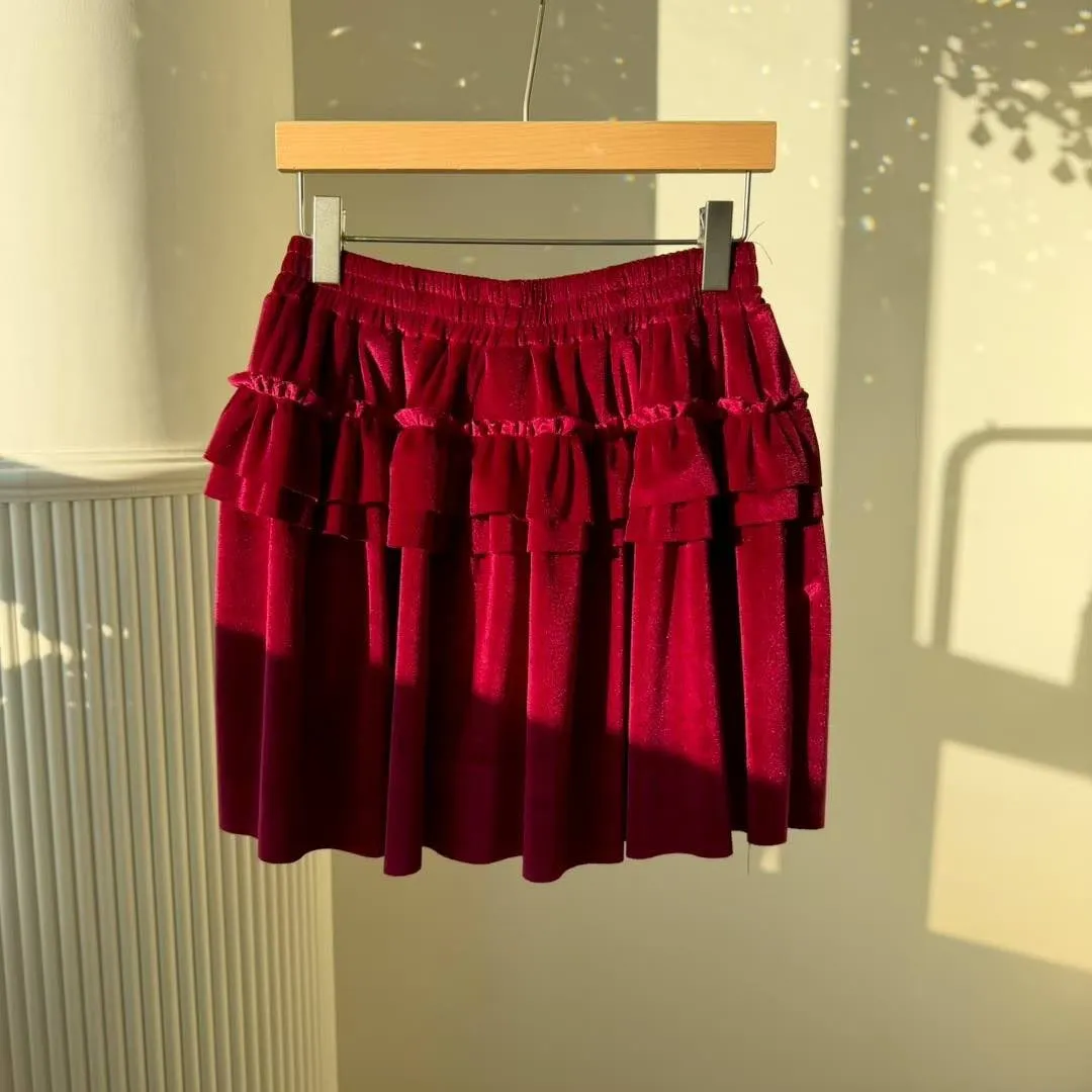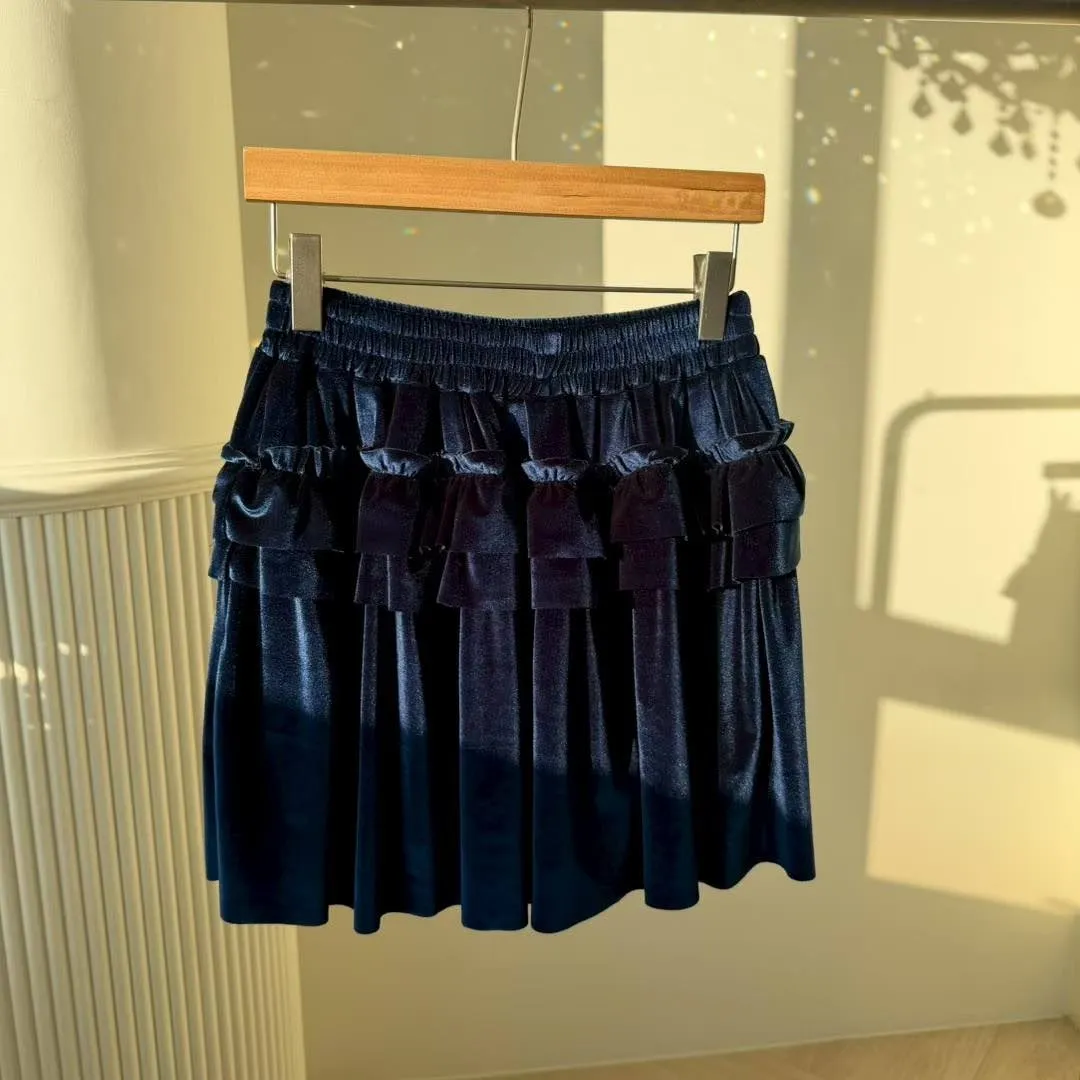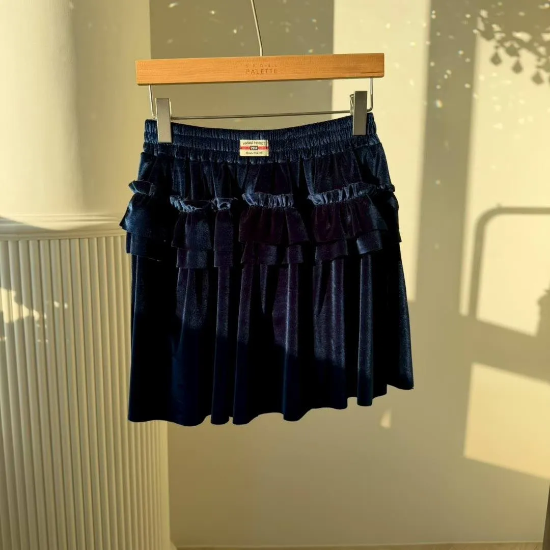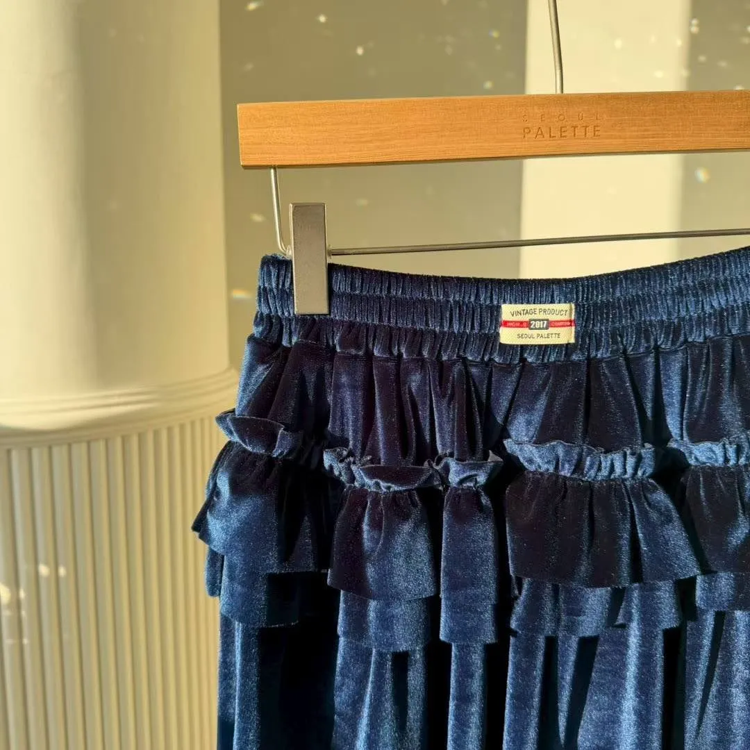 【Seoul Palette】光澤感美學:復古絲絨壓褶 A 字百褶短裙 (深藍/酒紅)