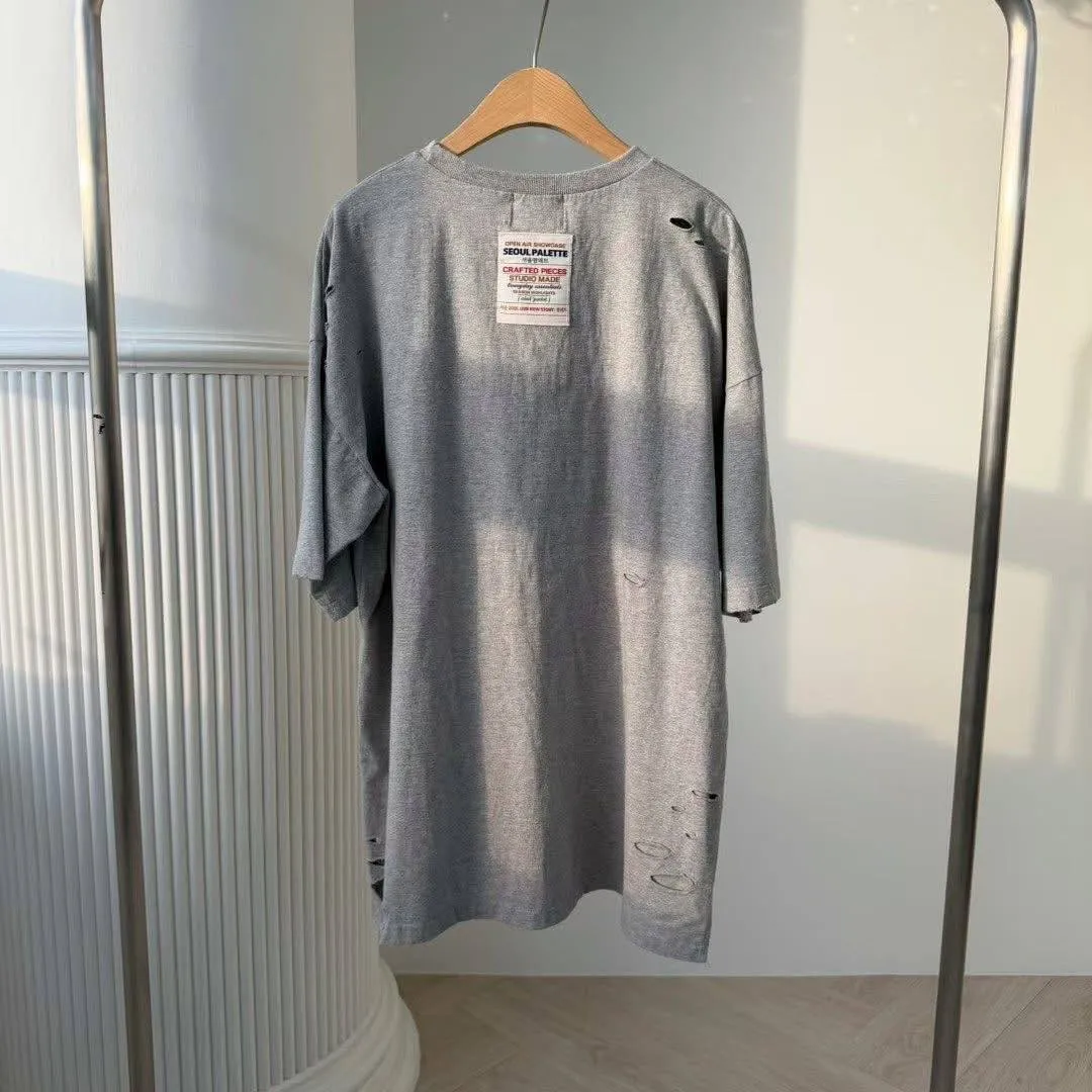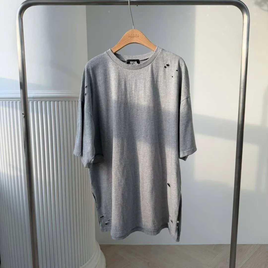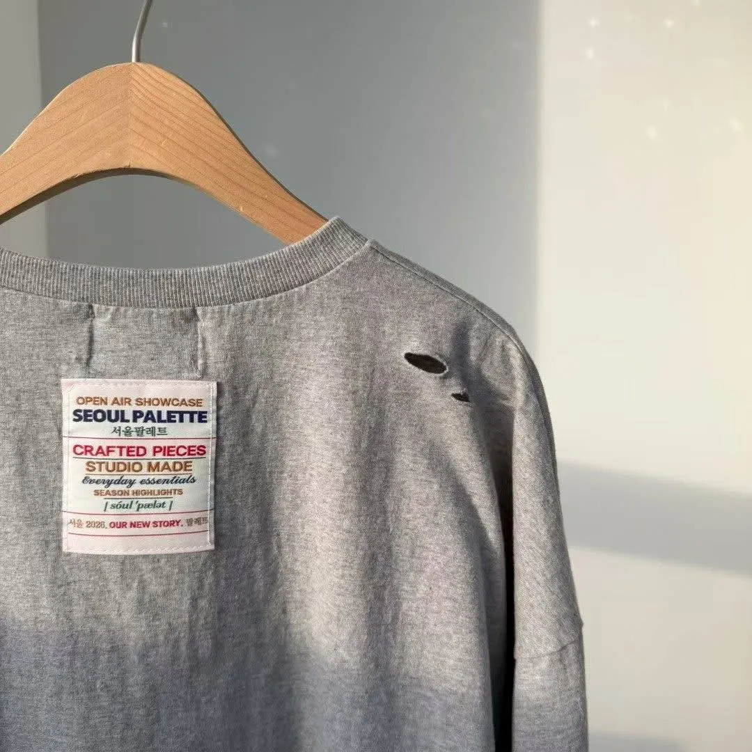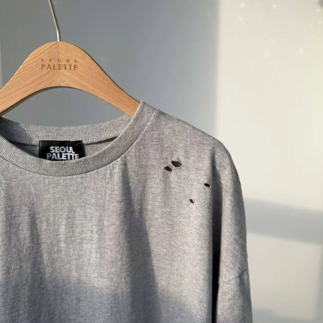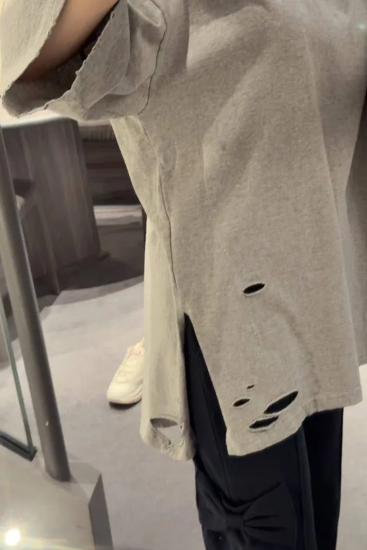 ☑️細節破損設計:領口、肩部及下襬處點綴不規則的手工感破洞,營造出自然的洗舊感與頹廢美學。