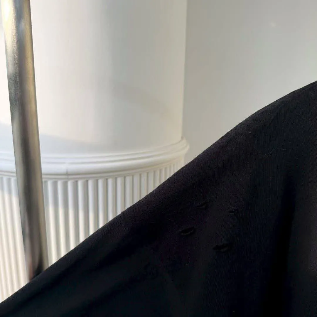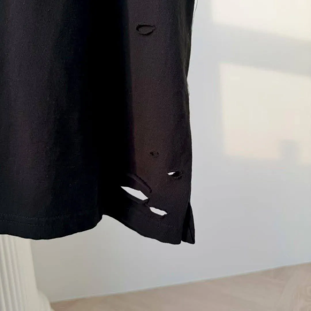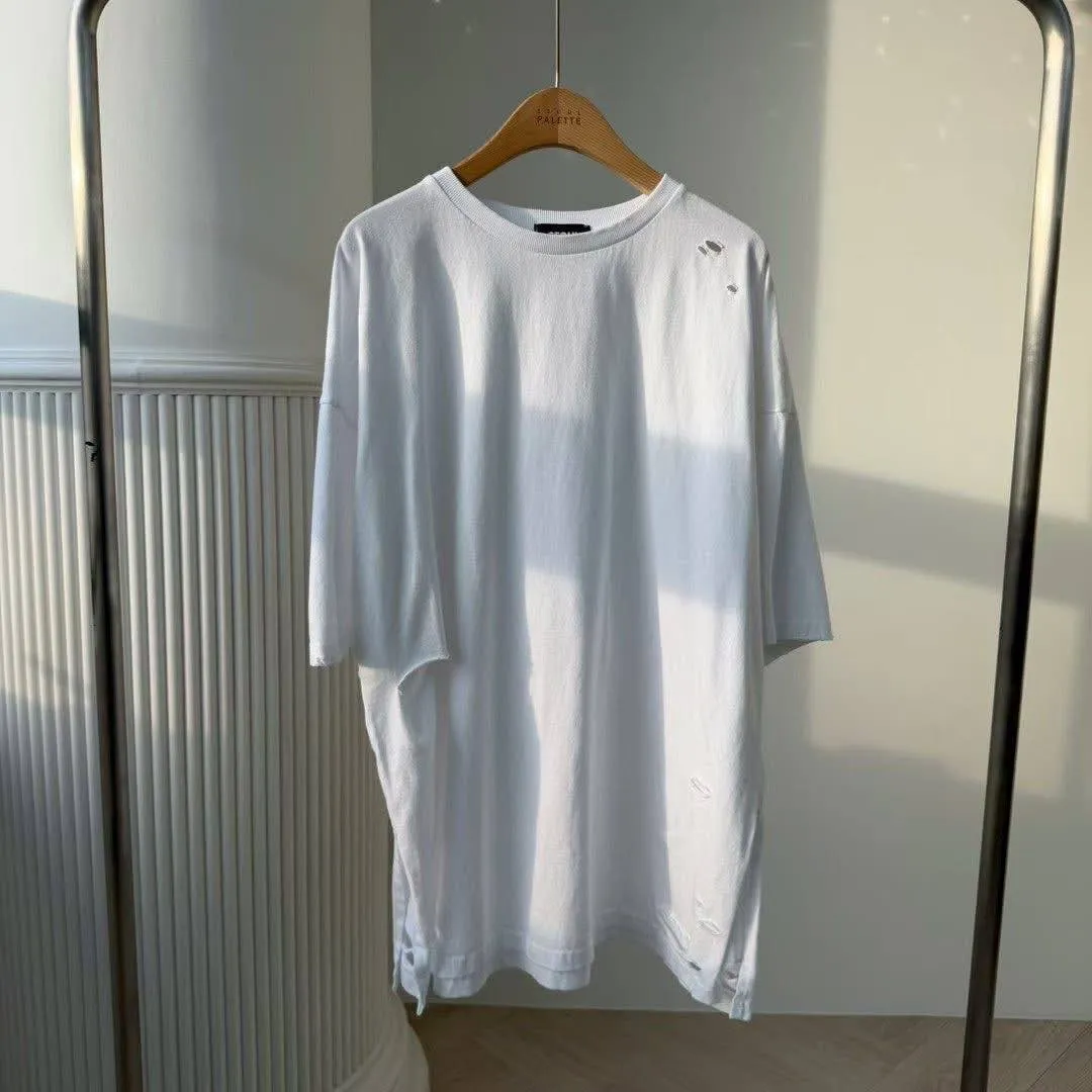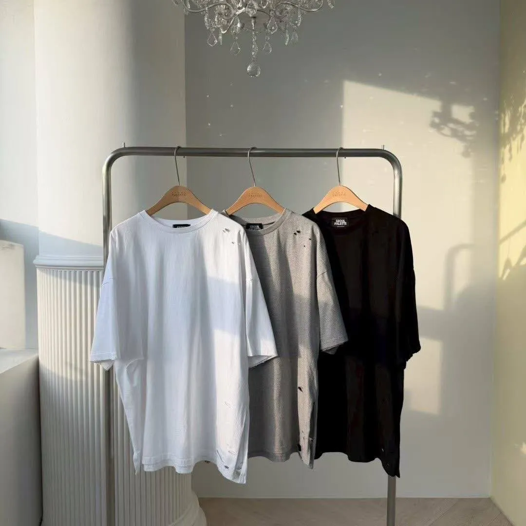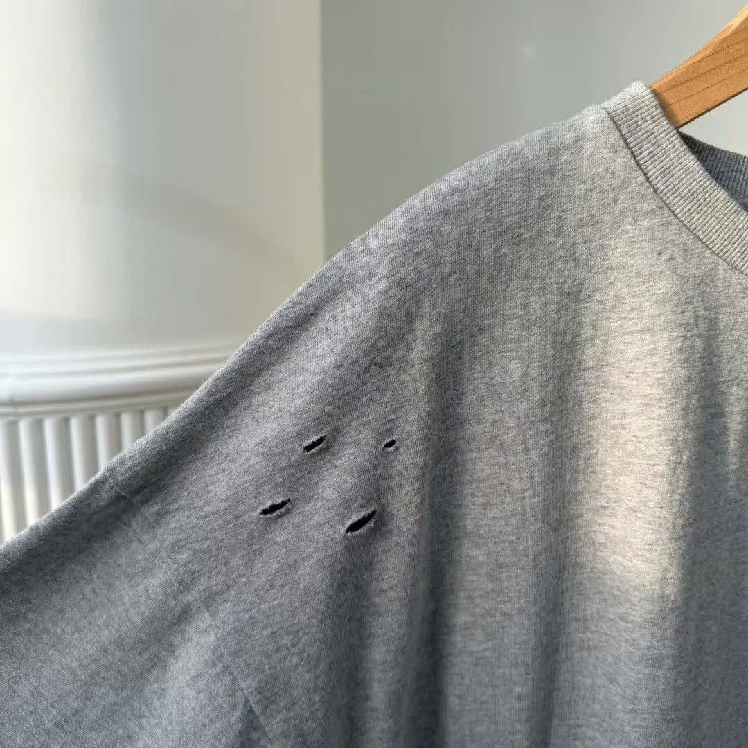 ☑️細節破損設計:領口、肩部及下襬處點綴不規則的手工感破洞,營造出自然的洗舊感與頹廢美學。