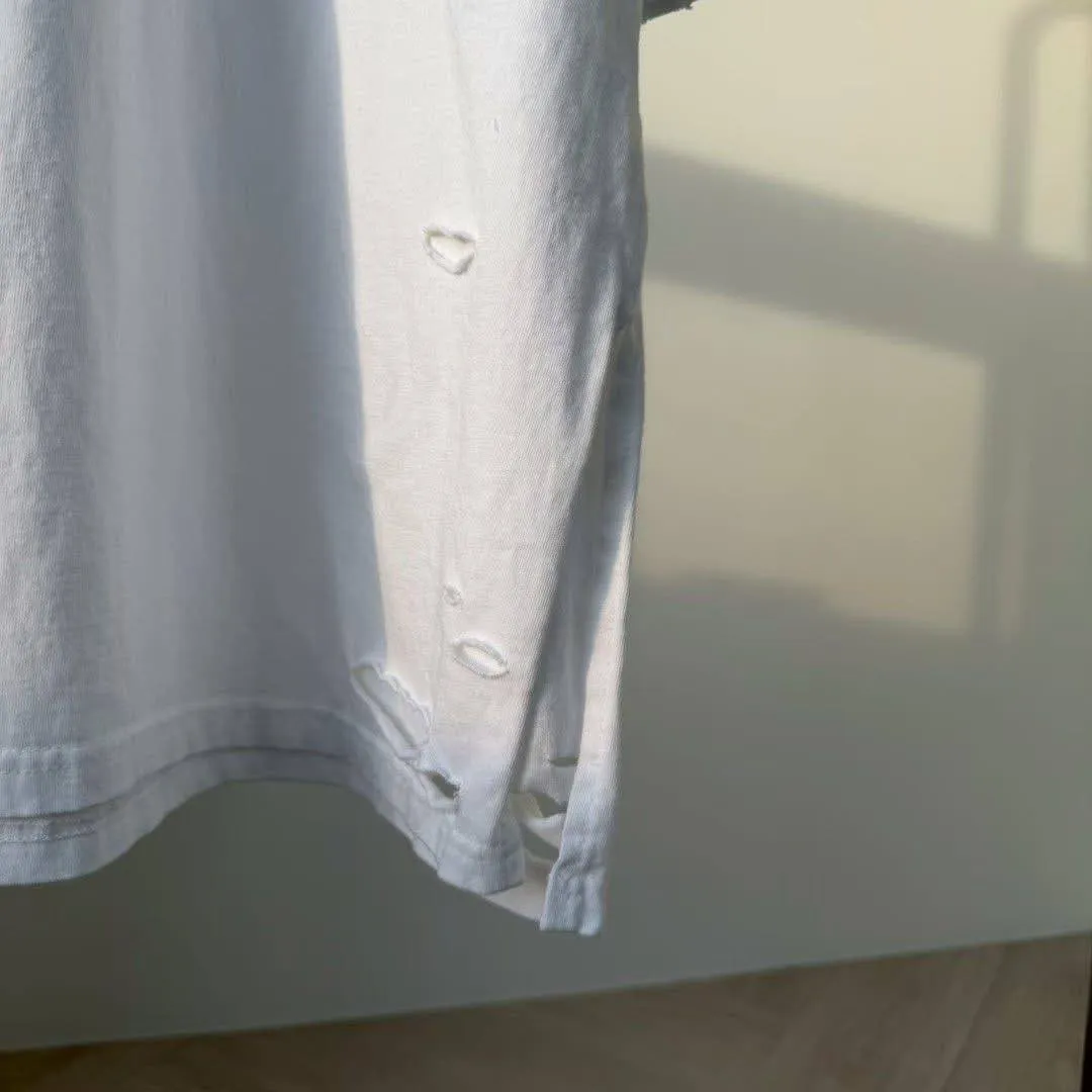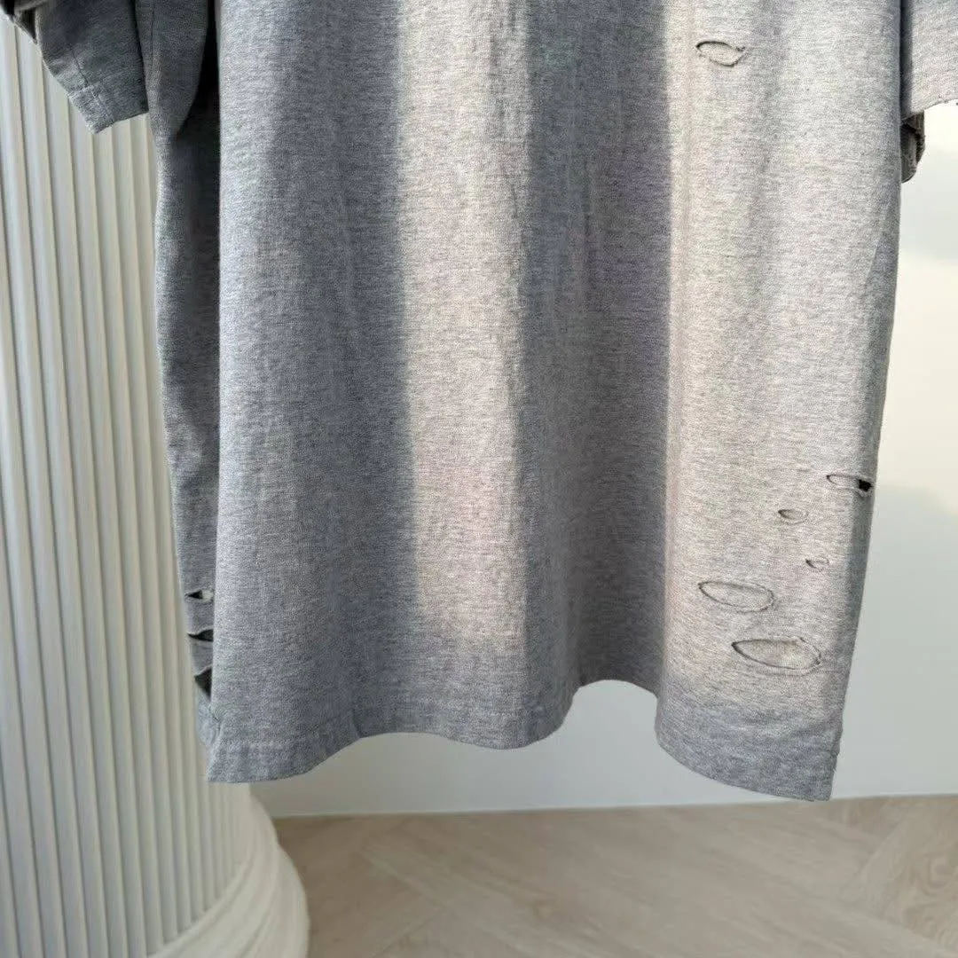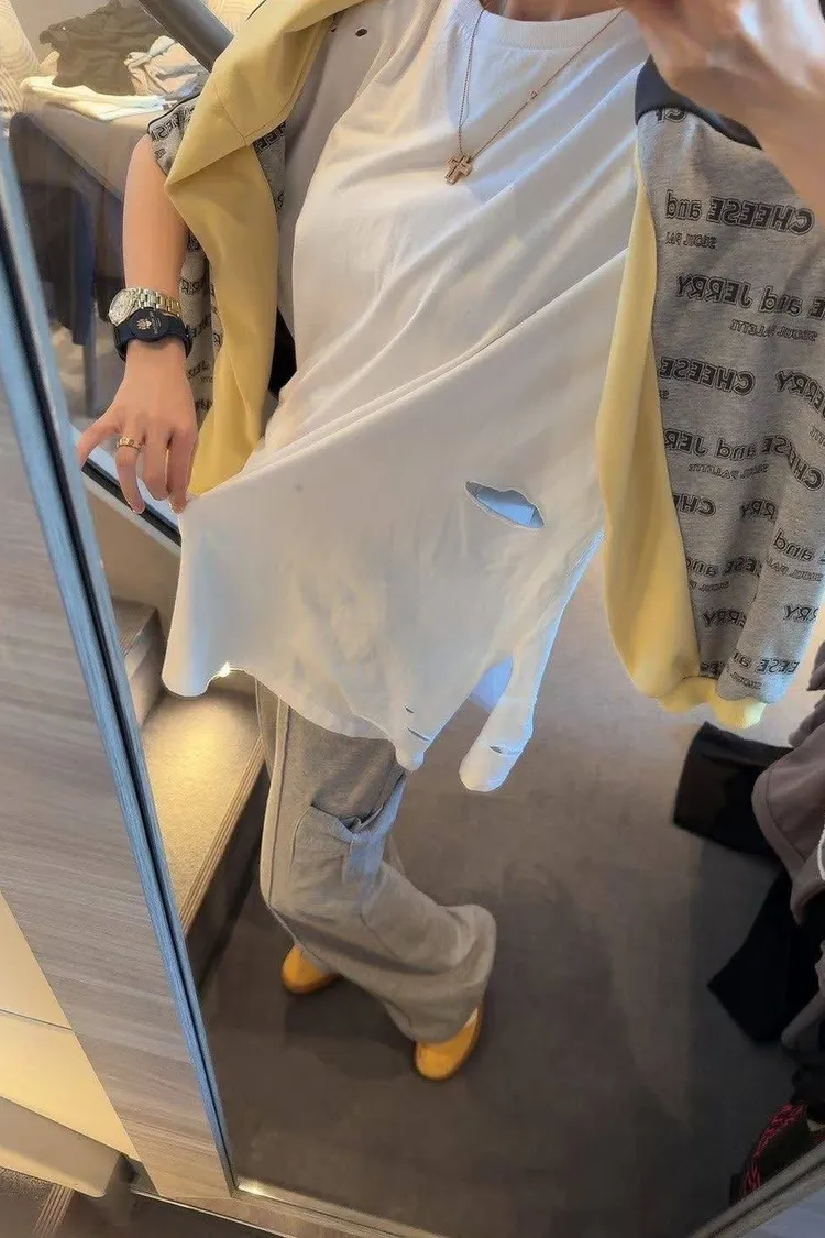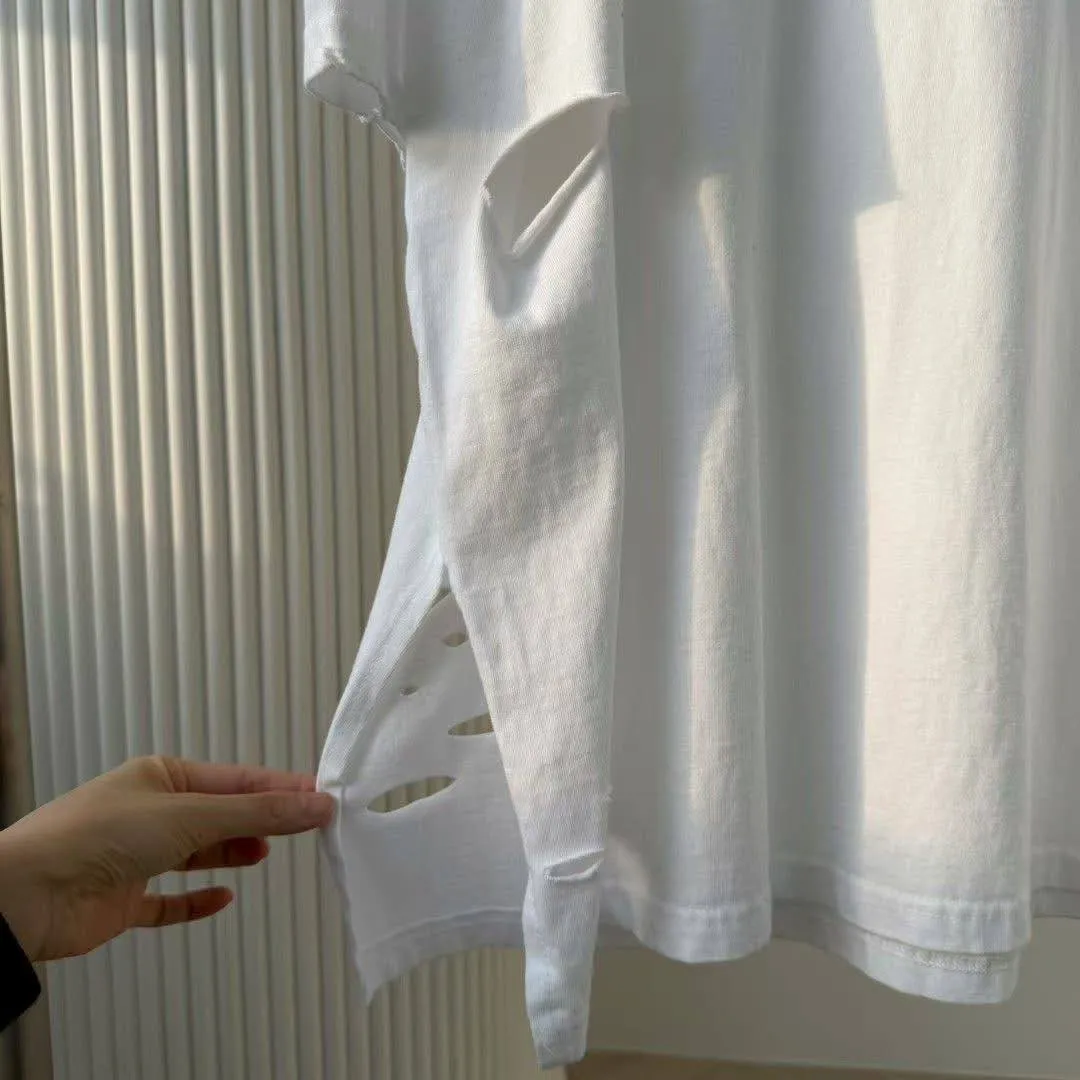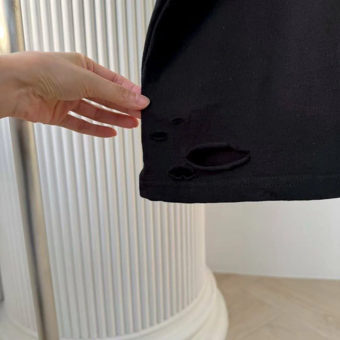 ☑️細節破損設計:領口、肩部及下襬處點綴不規則的手工感破洞,營造出自然的洗舊感與頹廢美學。