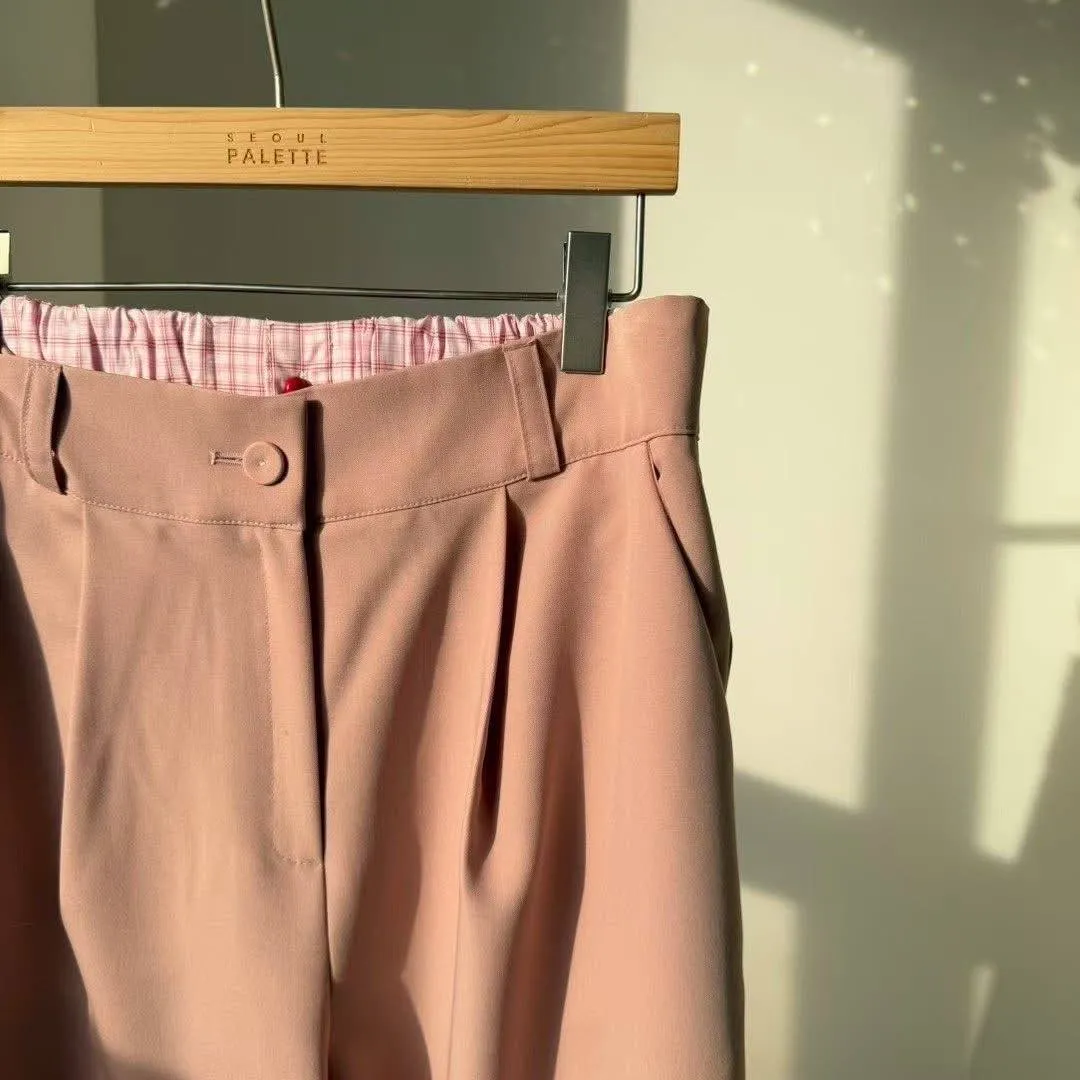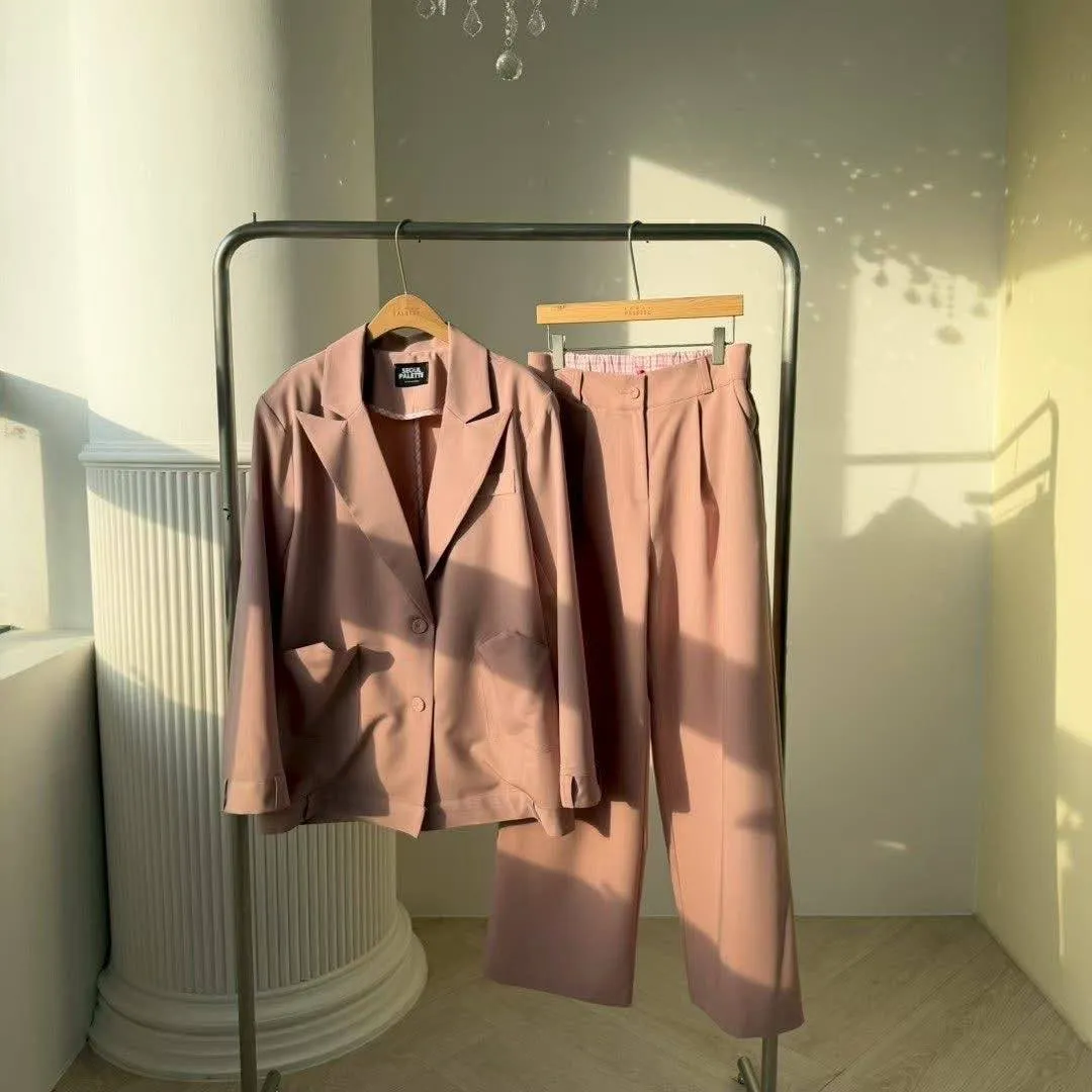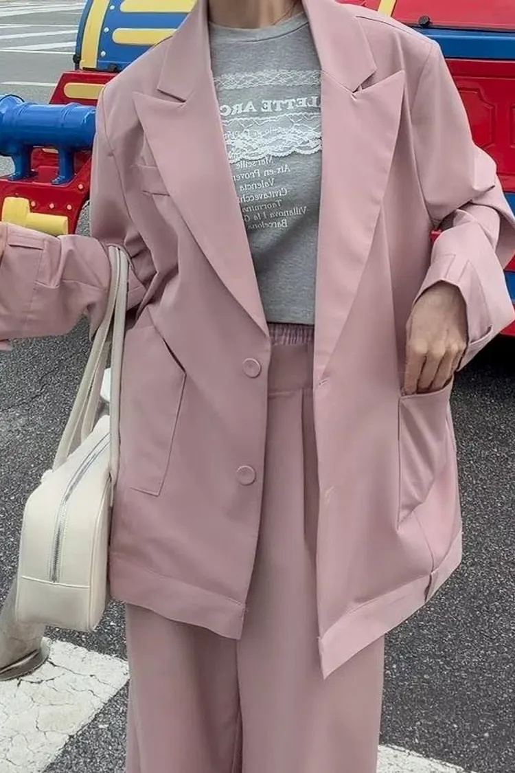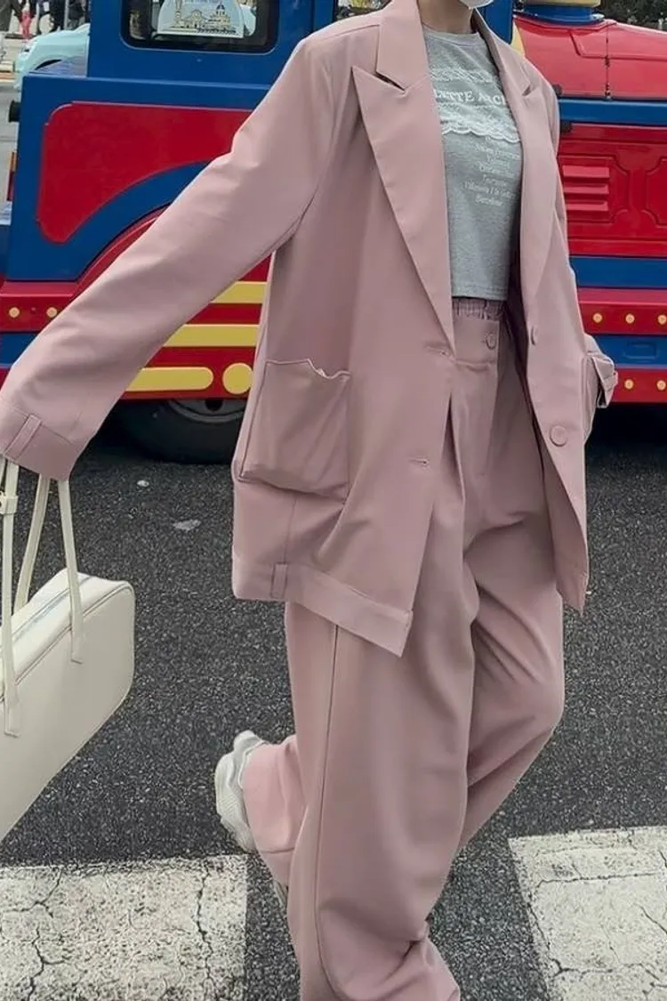 【Seoul Chill】慵懶系雙層腰頭西裝套裝(微寬版剪裁 / 粉、灰兩色)