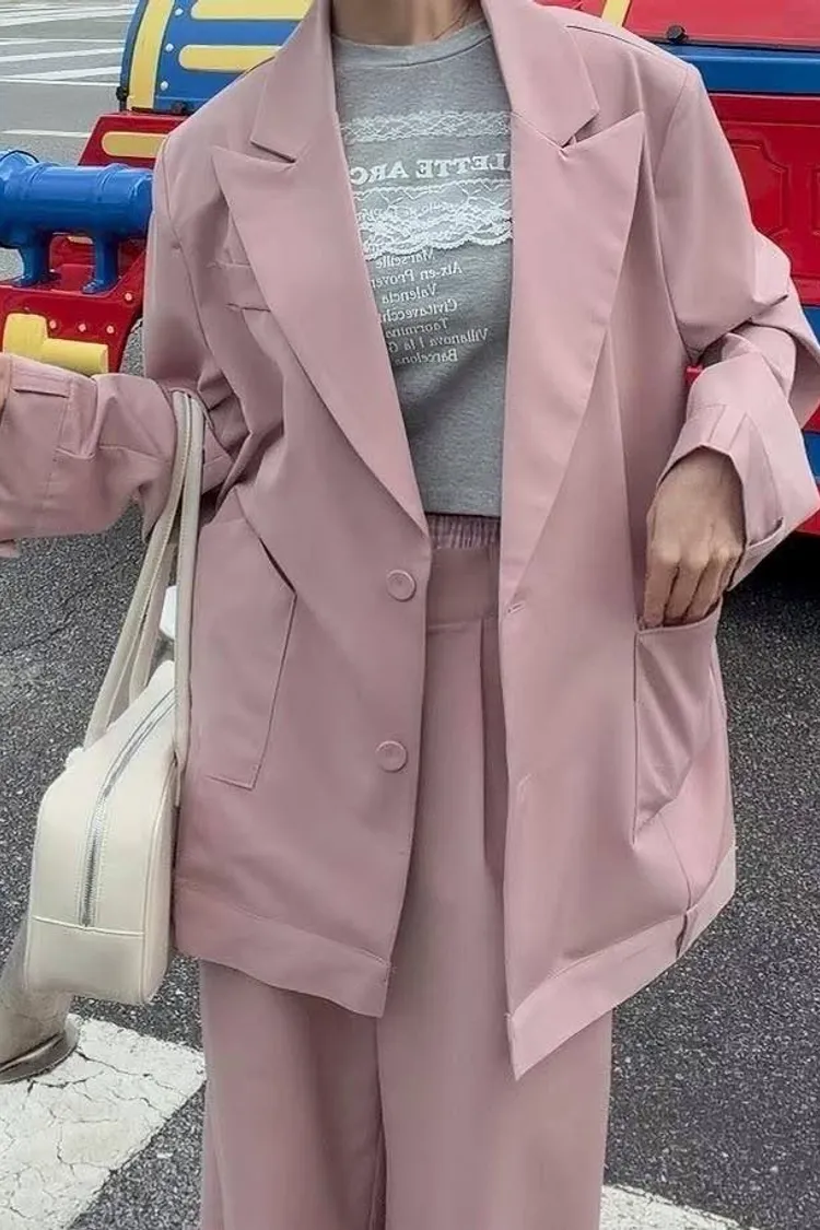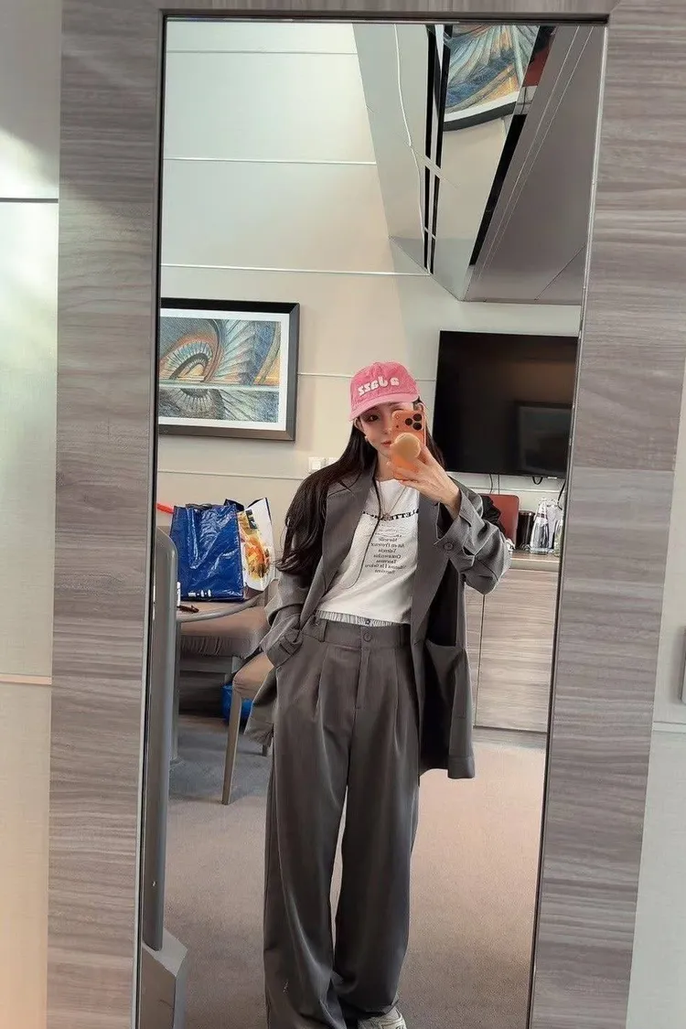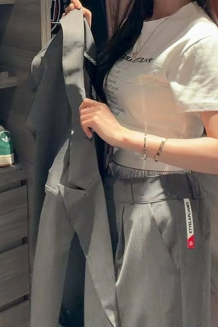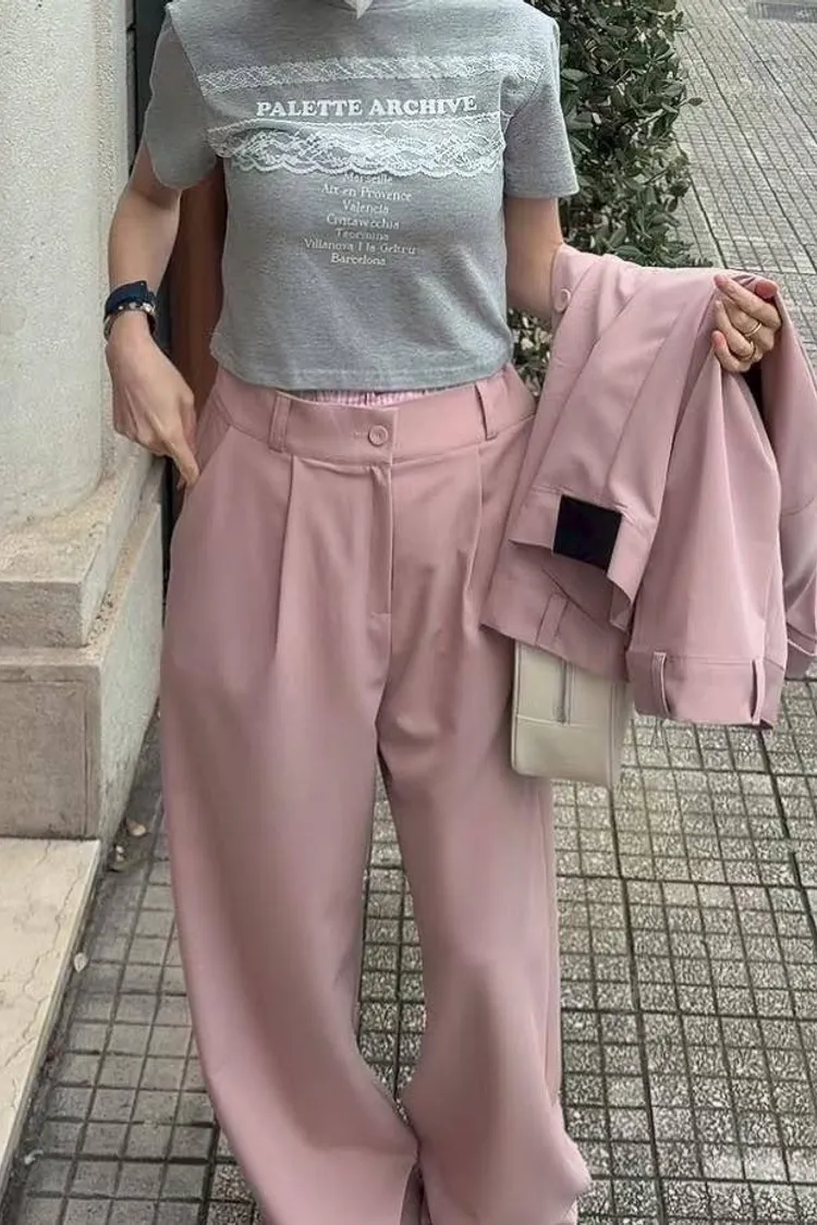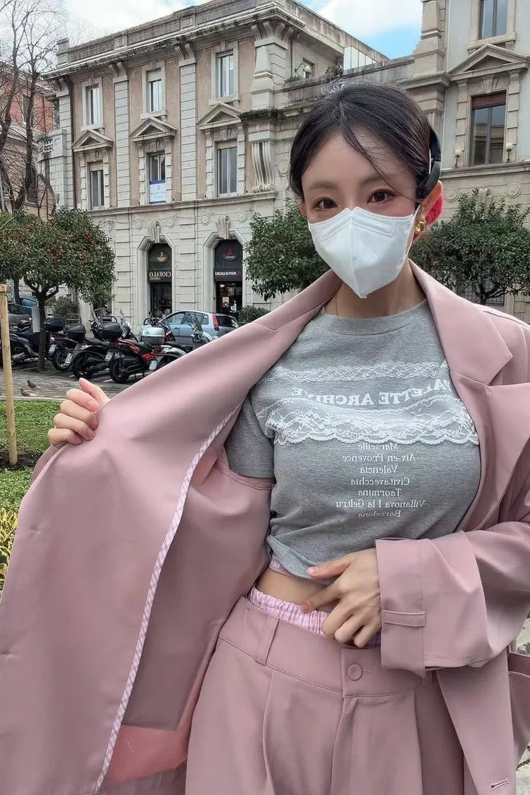 微微修身的短版剪裁,搭配高腰西裝褲真的「胸以下全是腿」! 不管是像歐膩一樣套上粉色西裝套裝走甜酷風, 還是搭灰色套裝走都會高級感, 這件蕾絲 T 都能讓整身穿搭瞬間有了視覺重點。