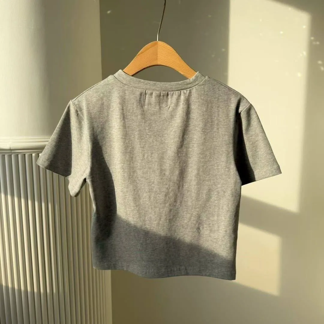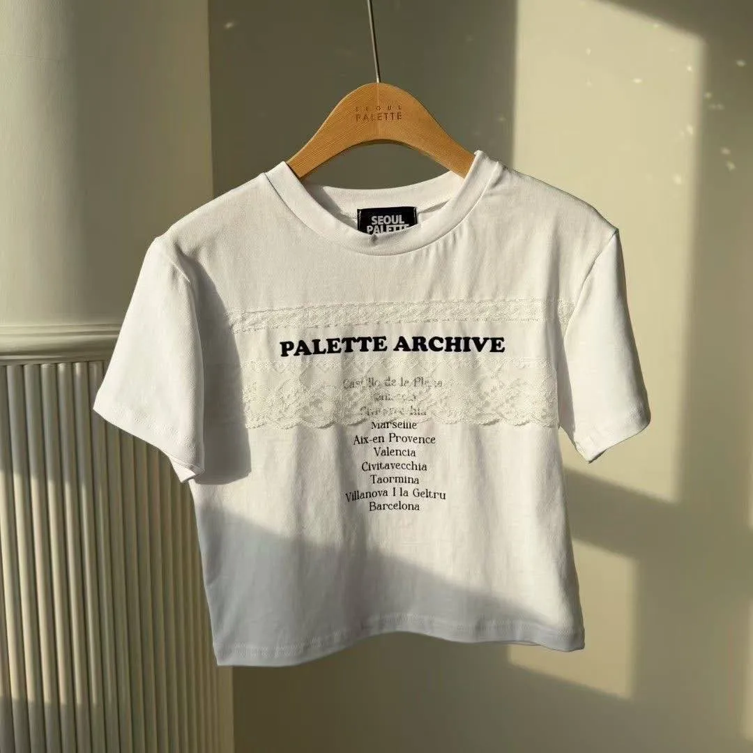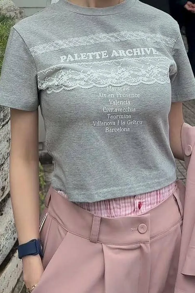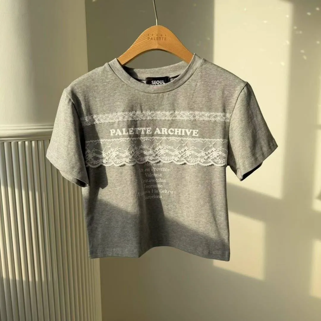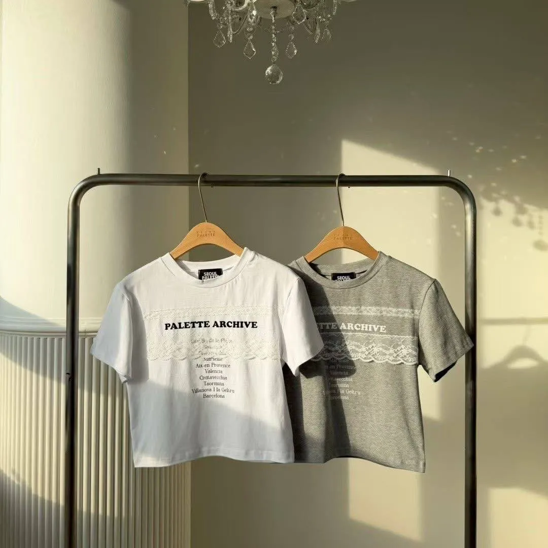 法式蕾絲拼接棉質短版彈力 TEE(迷霧灰 / 珍珠白)